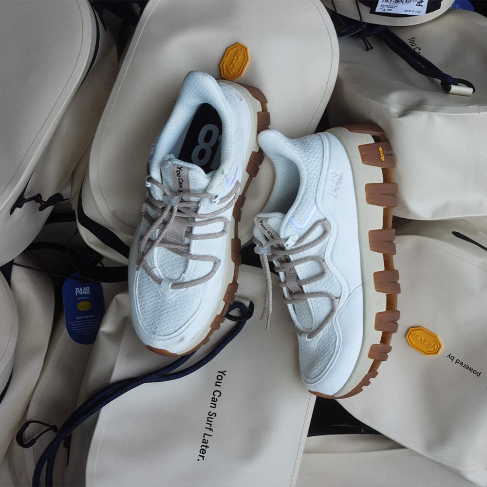Packed for adventure. With every pair from the P448 x Vibram collection, you’ll receive your shoes packaged in our custom waterproof and 100% recycled adventure bag. Designed to be reused, the bag is crafted from entirely recycled, biobased and post‑consumer materials. It features a two‑way backpack‑to‑mono strap to accompany you on all your adventures from land to sea.