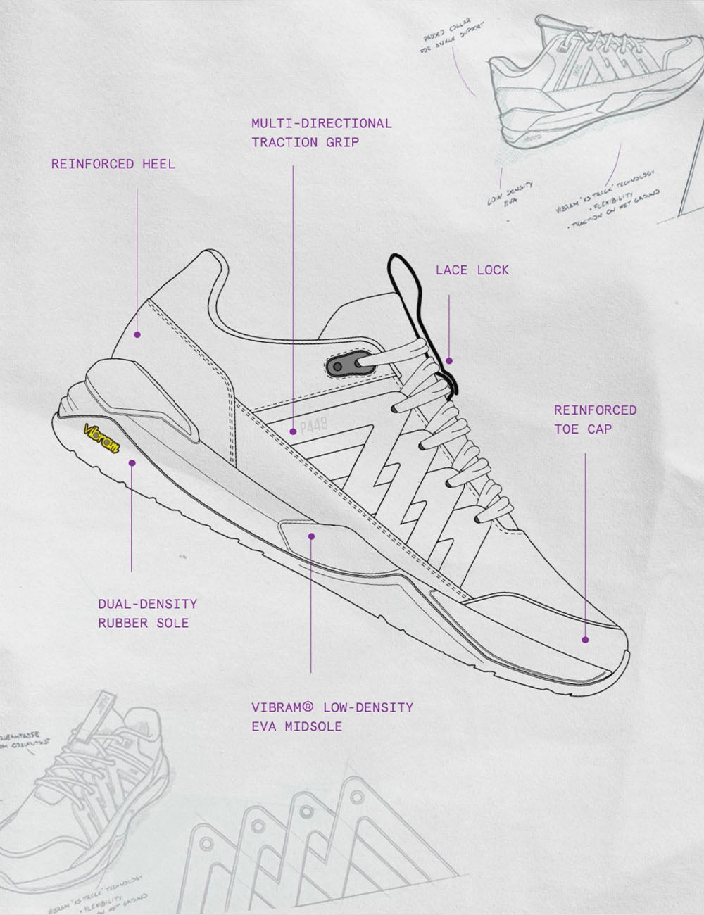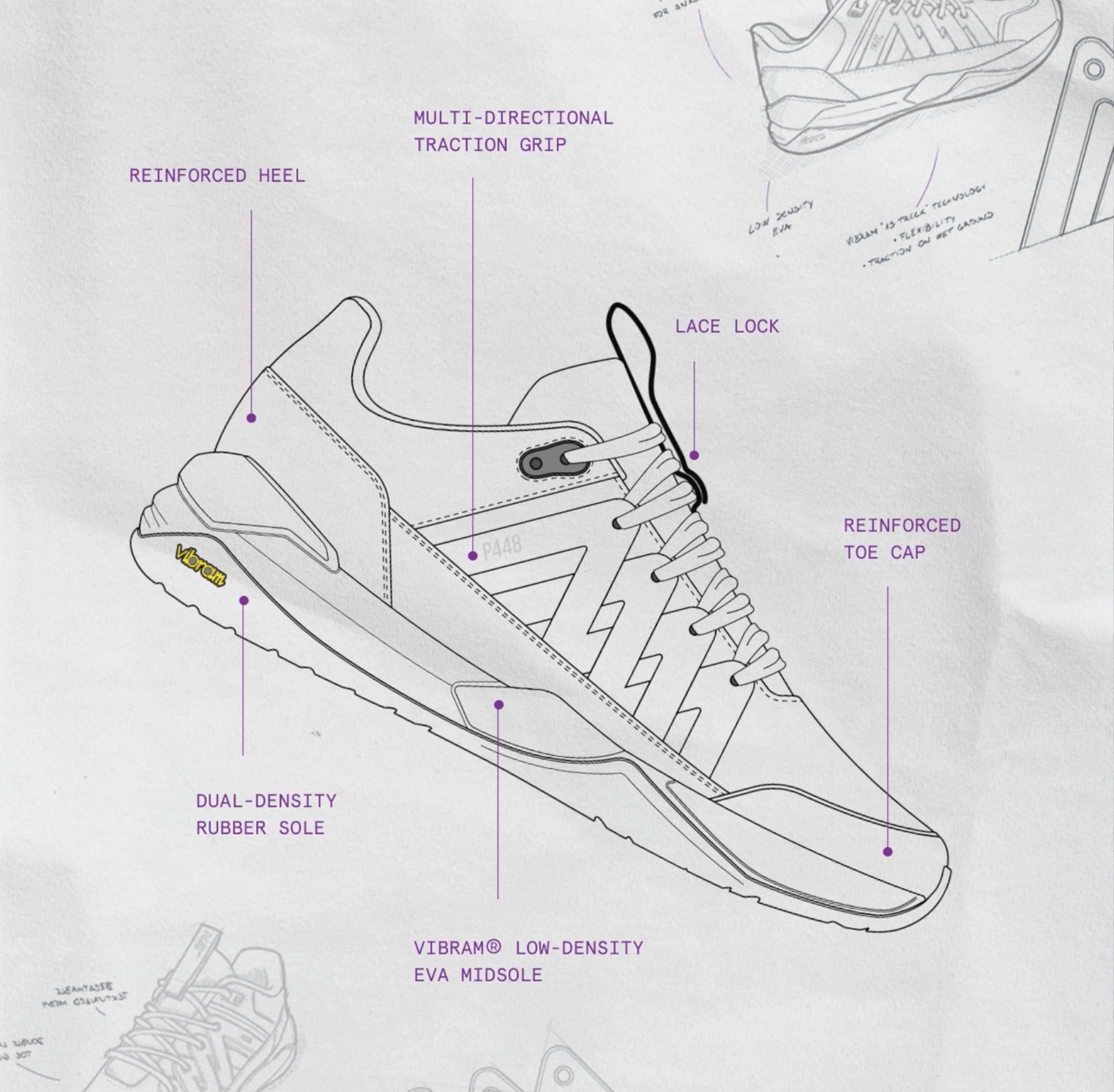 The P448 patented foot cage, lace lock and reinforced heel and toe cap pair with the Vibram Low-Density EVA Midsole and unparalleled dual-density rubber sole for a pair with serious court appeal.