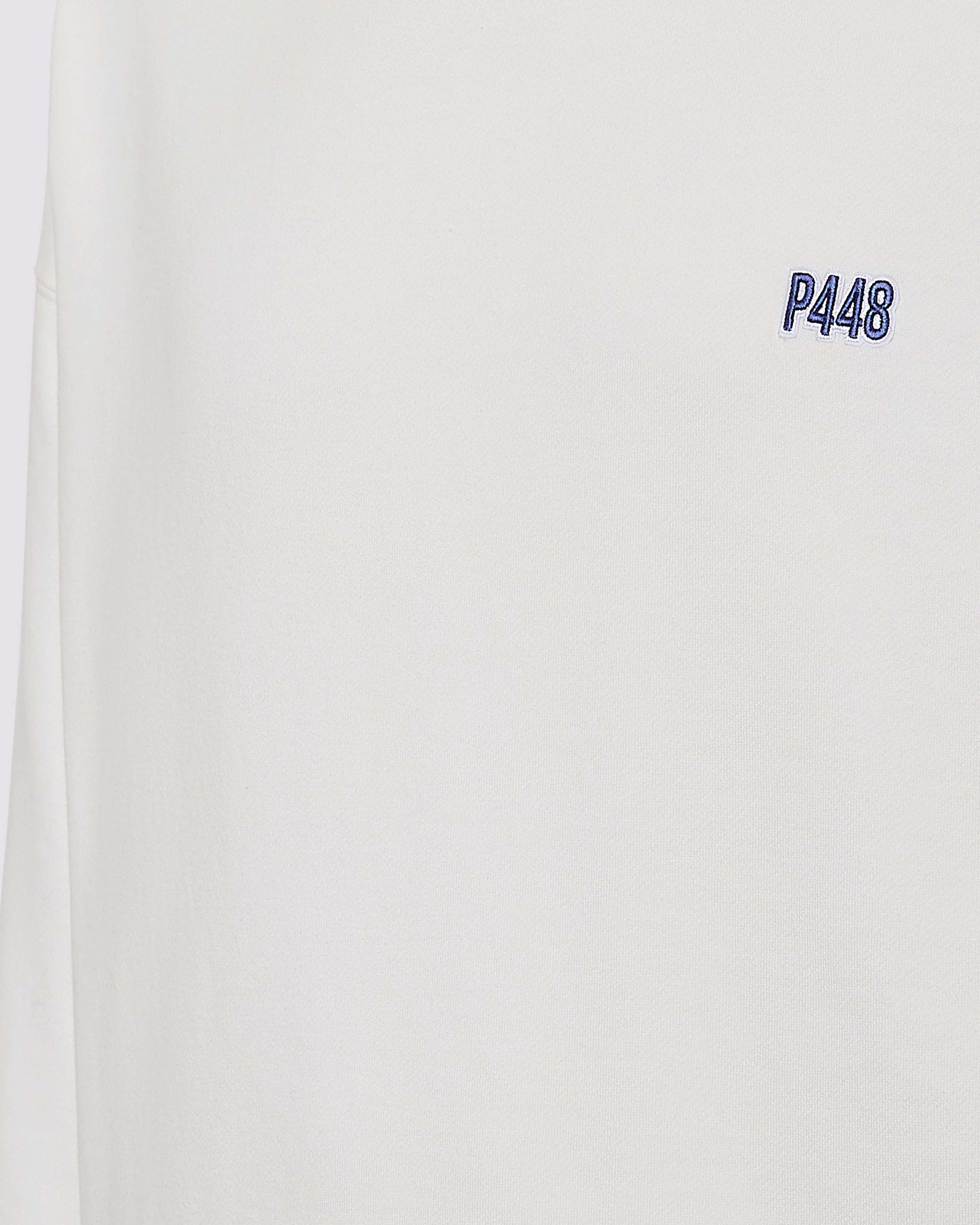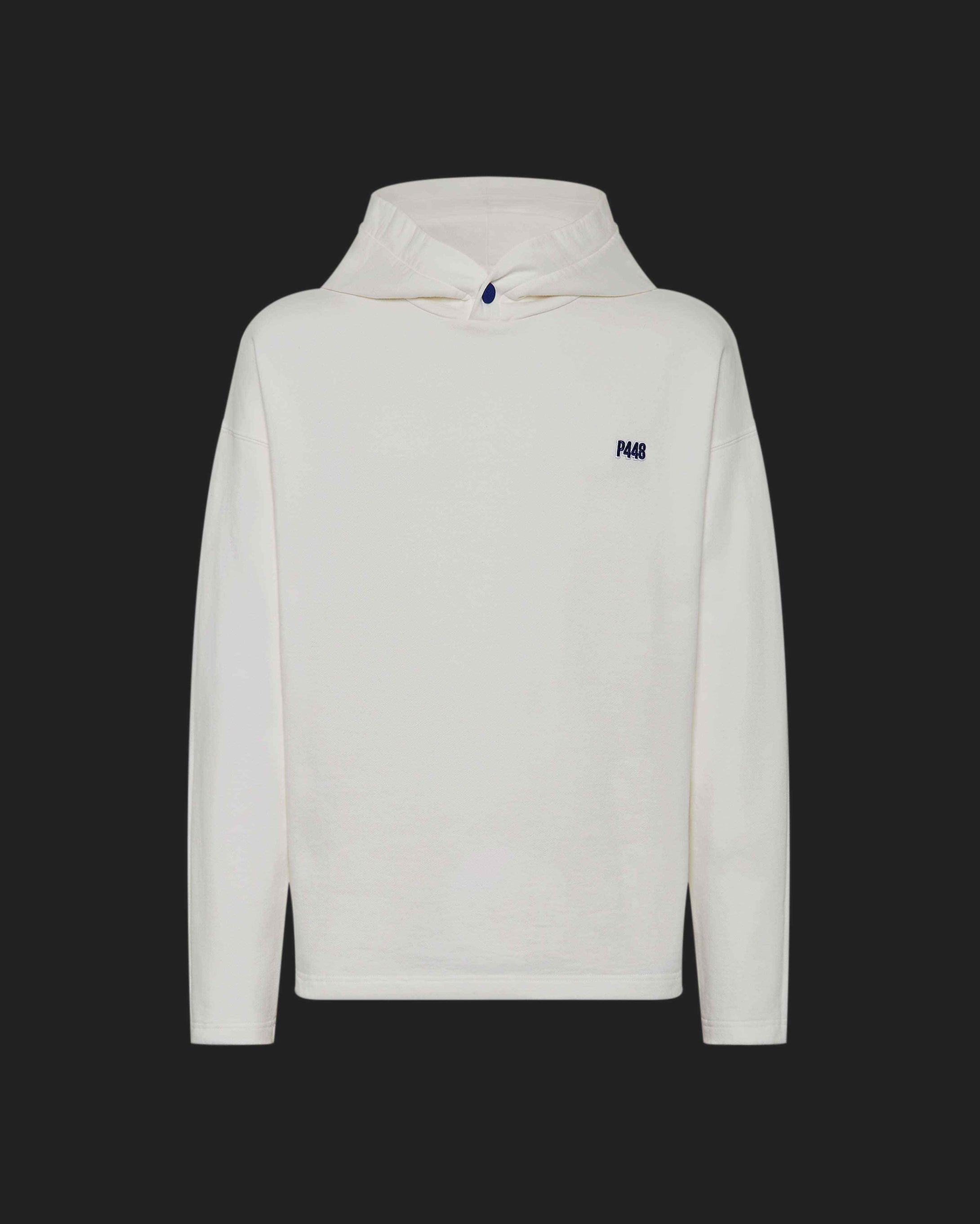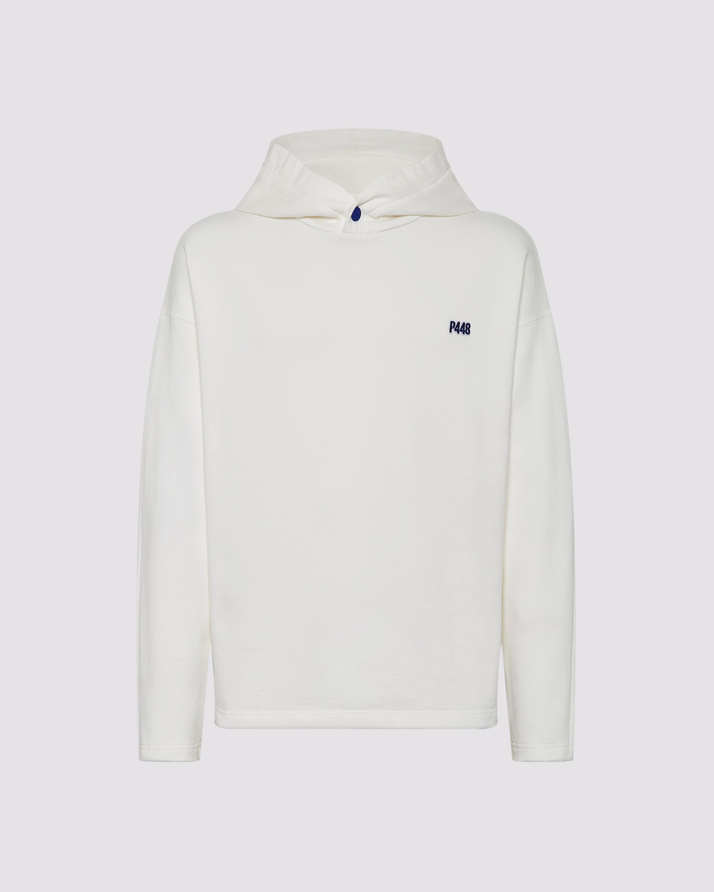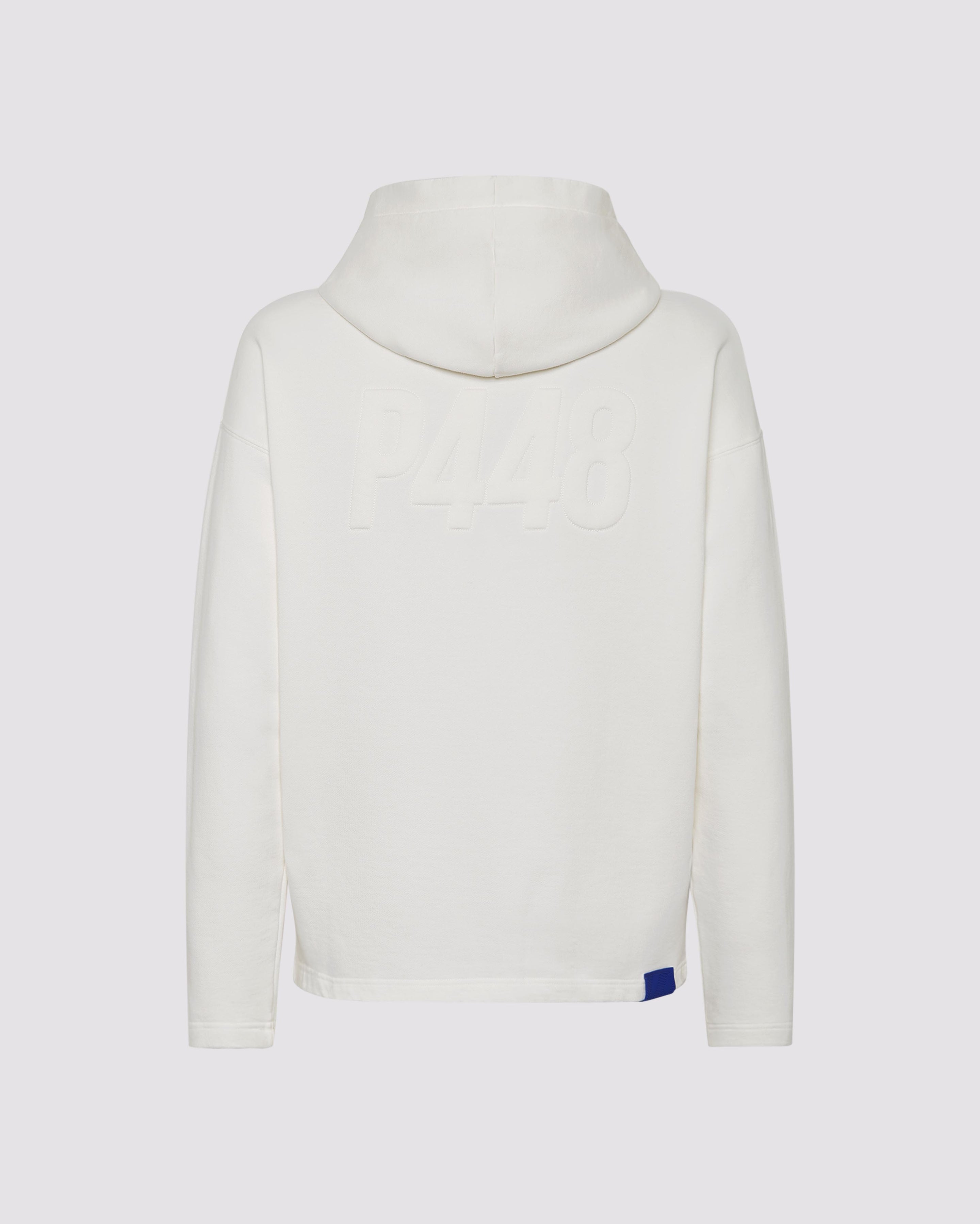 The perfect throw-on-and-go hoodie for easy style and comfort. Our Unisex Hoodie in Off-White features a front embroidered P448 logo in blue, plus an off-white bubbled logo printed on the back. This hoodie is Italian-made with 100% organic brushed cotton for an extra-soft feel.