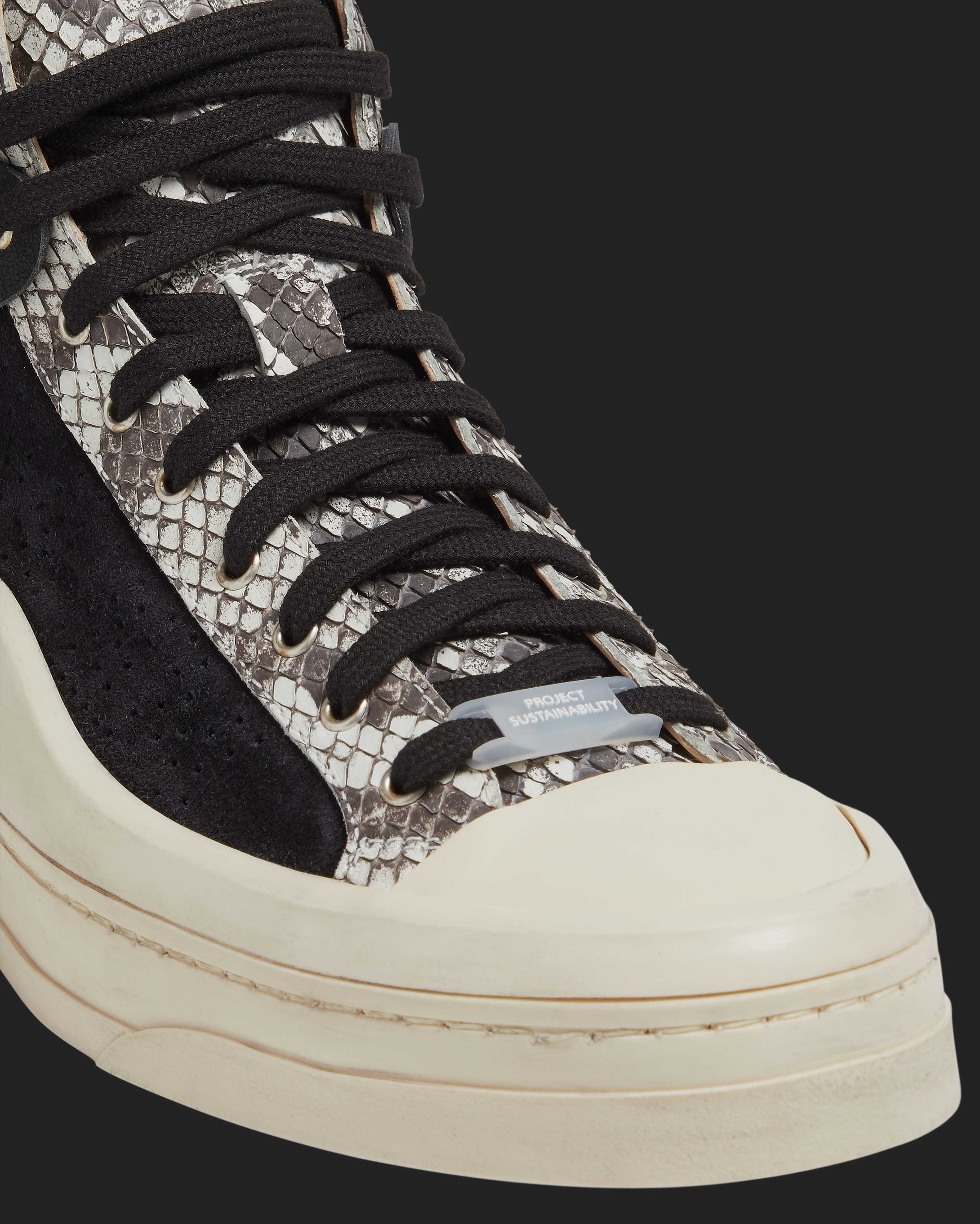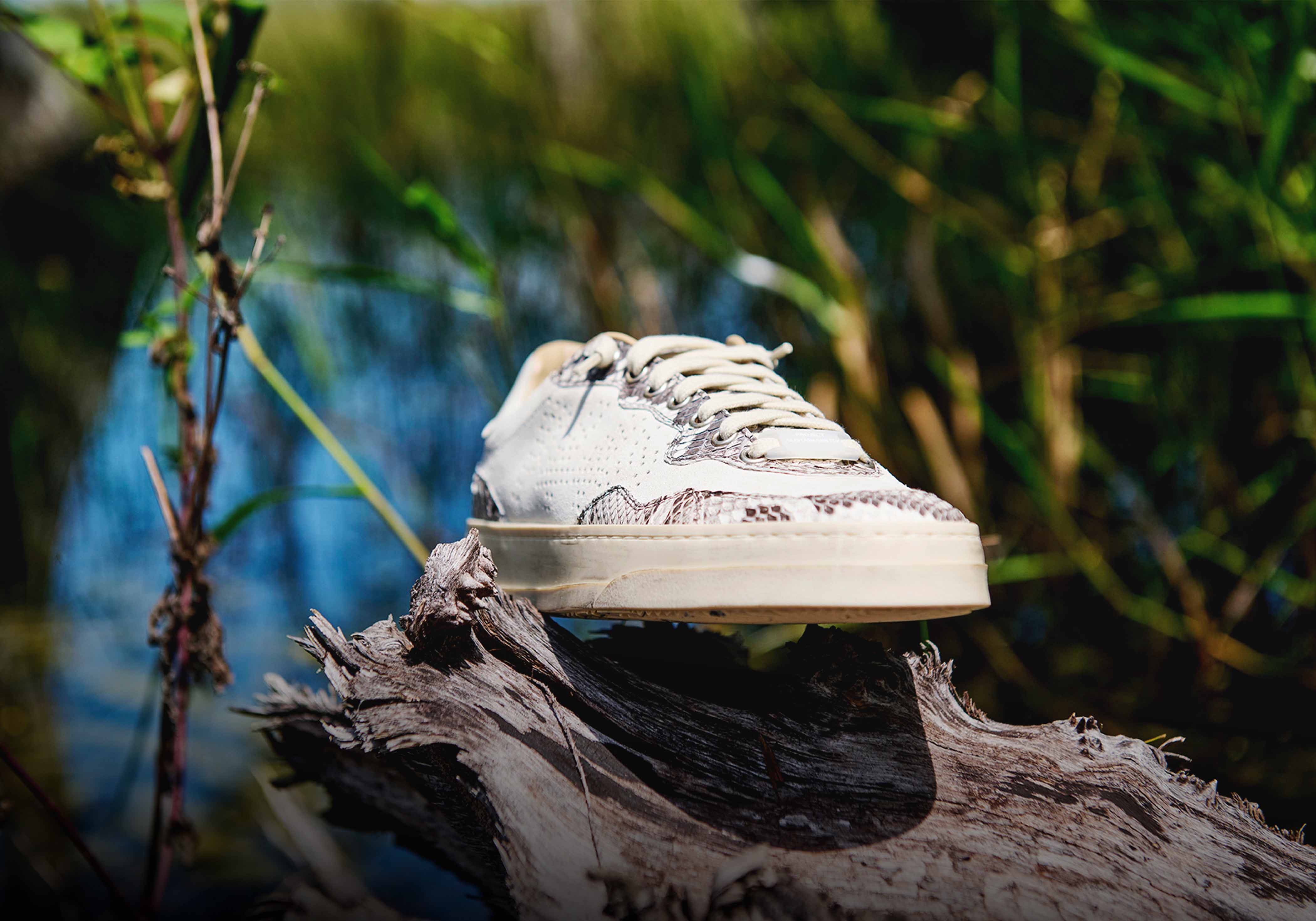 By removing Burmese pythons from the Everglades, we're helping to preserve native species, their resources and their environment. After months of tannery testing and material samples, we've created our sustainable snakeskin. The Rail Python features an all-over black recycled leather accented with a Burmese python leather tongue, heel tab and trim. Black recycled organic cotton laces and our signature, hand-distressed white gum toe finish off the look.