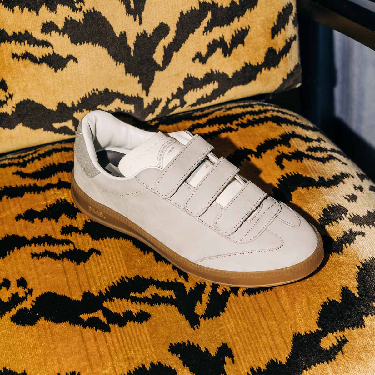 Slip into the Capri Glitter/Pearl for a sleek nubuck leather look. This effortless low top is wrapped in light grey nubuck leather, featuring an off-white suede tongue, all accented by a grey glitter heel tab. Grey suede straps and our signature P448 amber gum soles finish off the look.