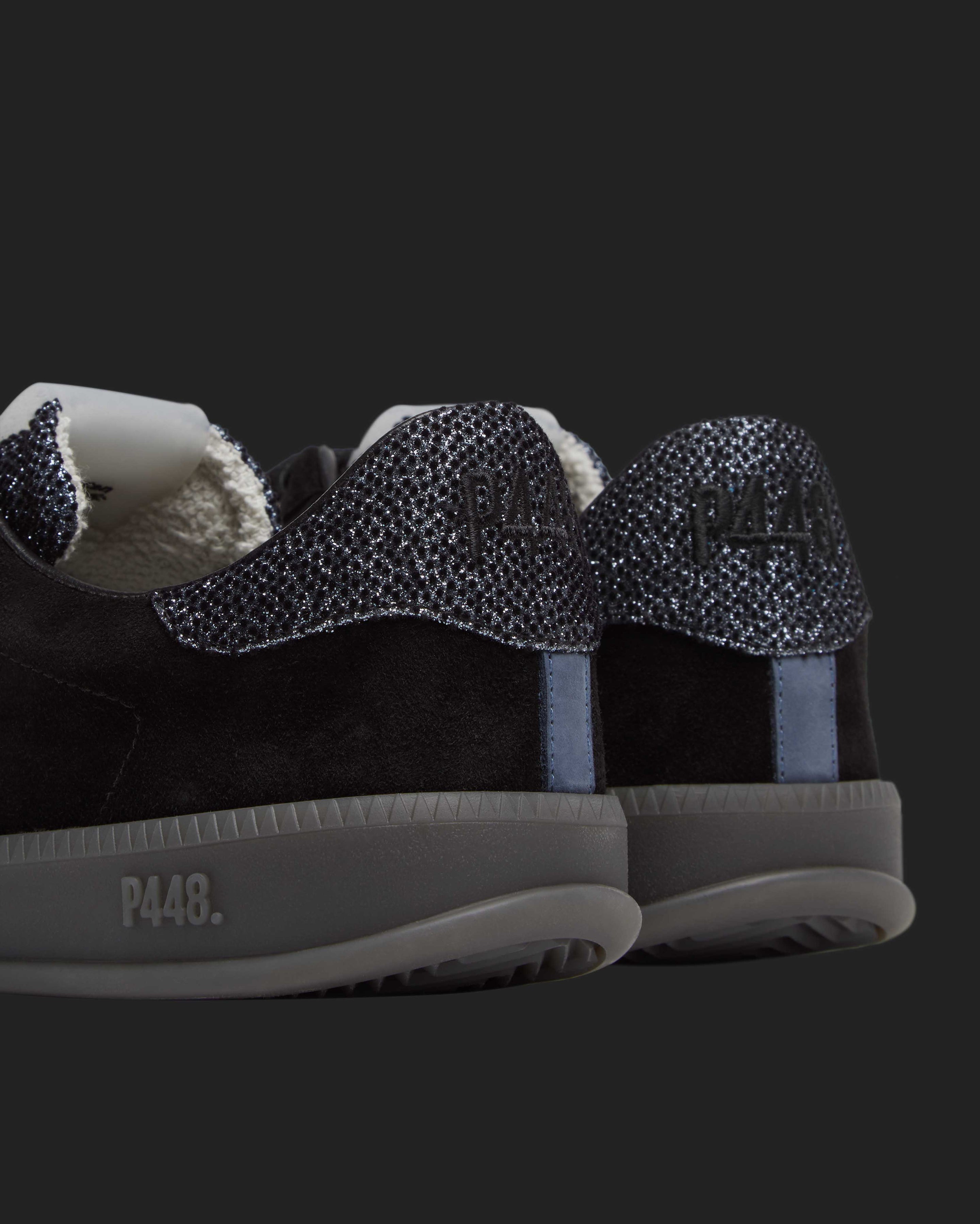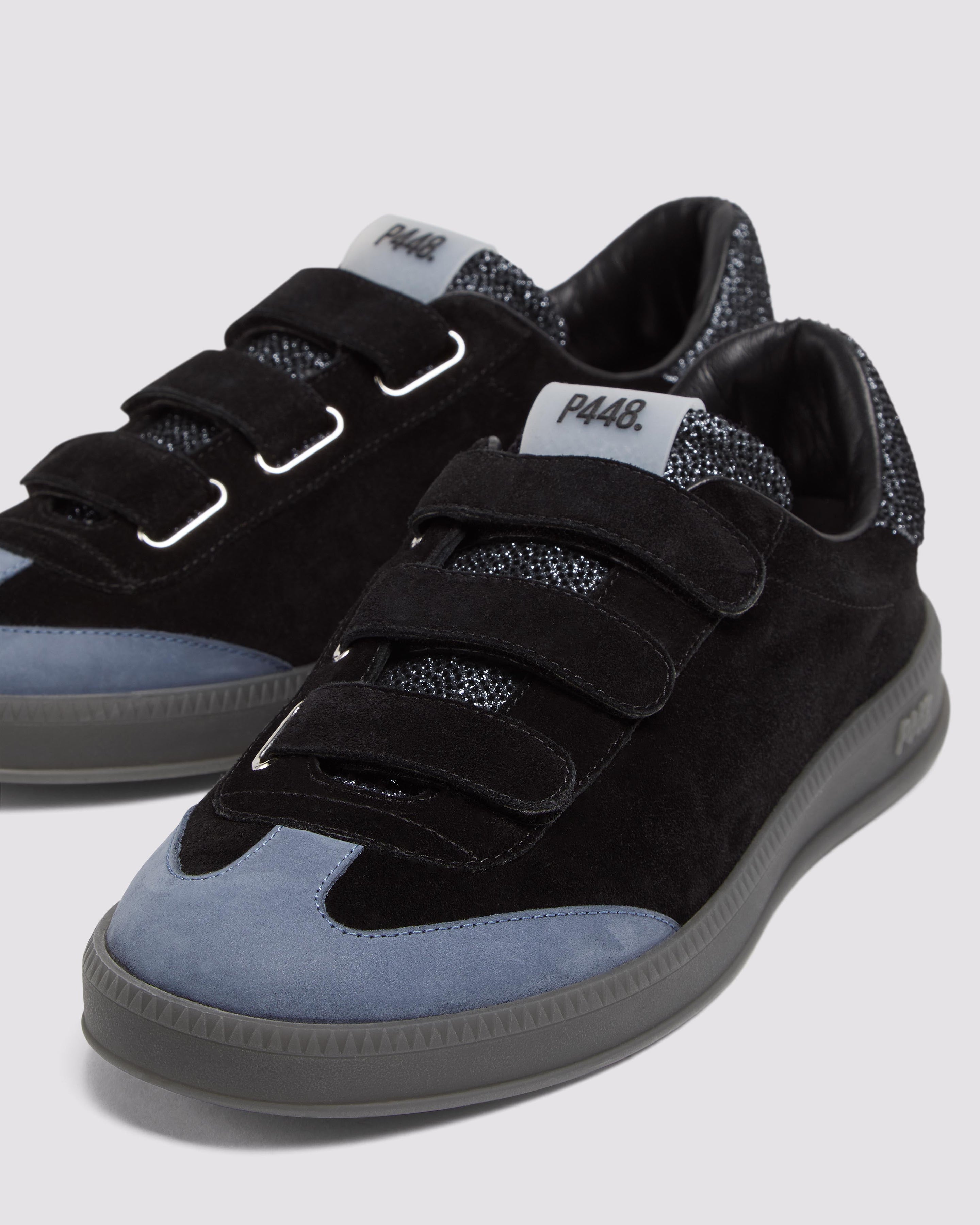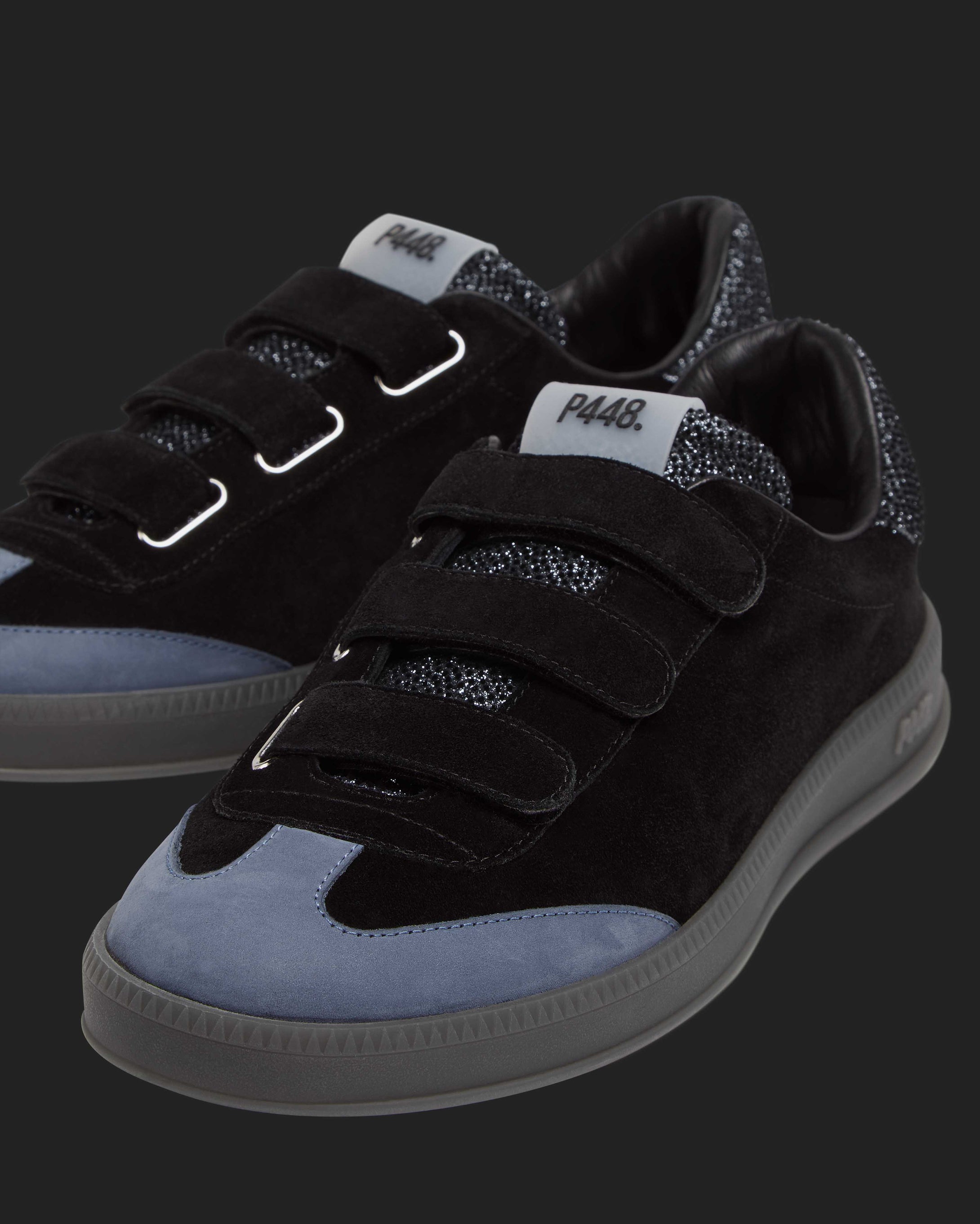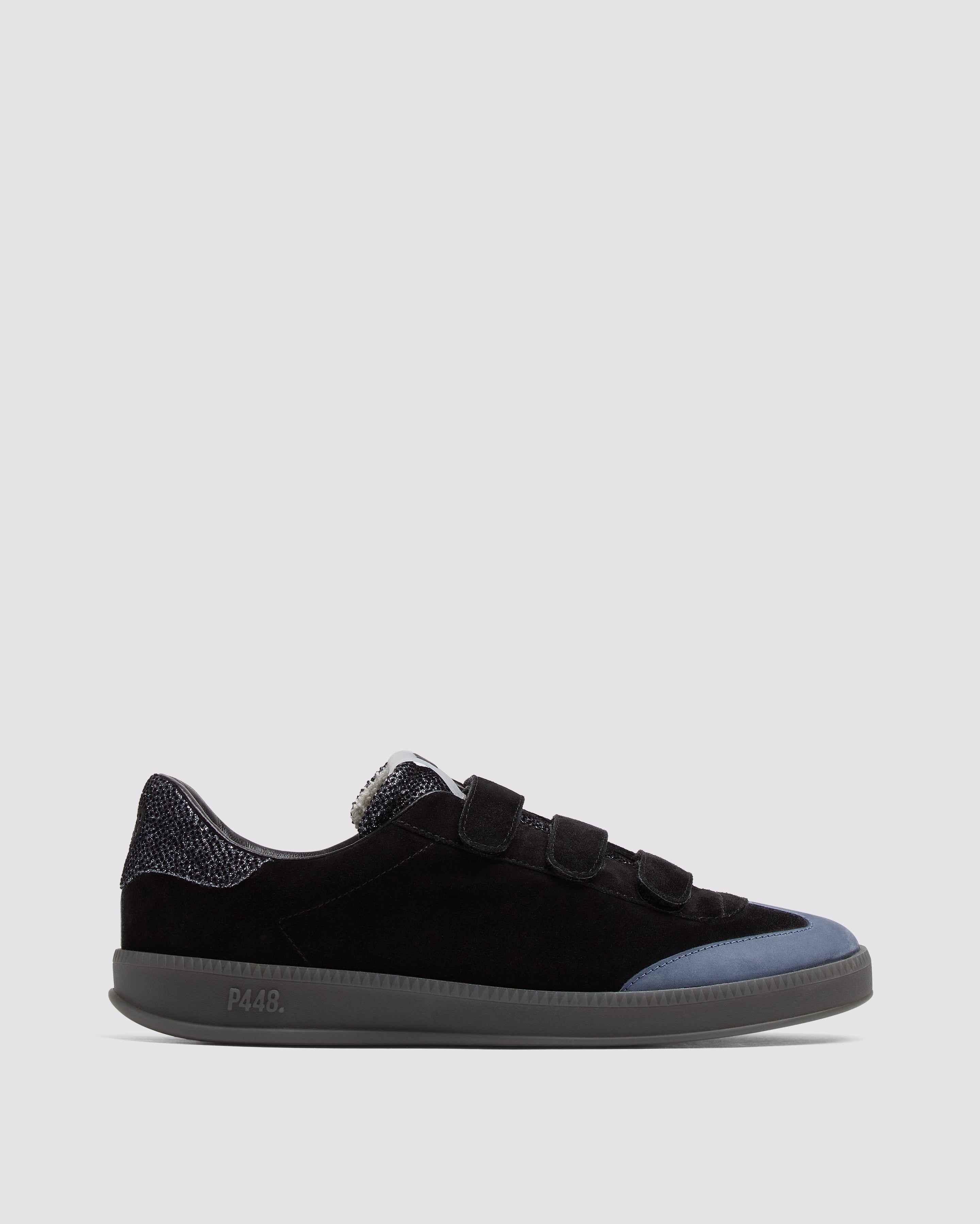 Slip into the Capri Phantom for a sleek suede look. This effortless low top is wrapped in black suede with contrasting silver glitter and velvet dot trims and accents. Black suede straps and our P448 semi-transparent black rubber soles finish off the look.