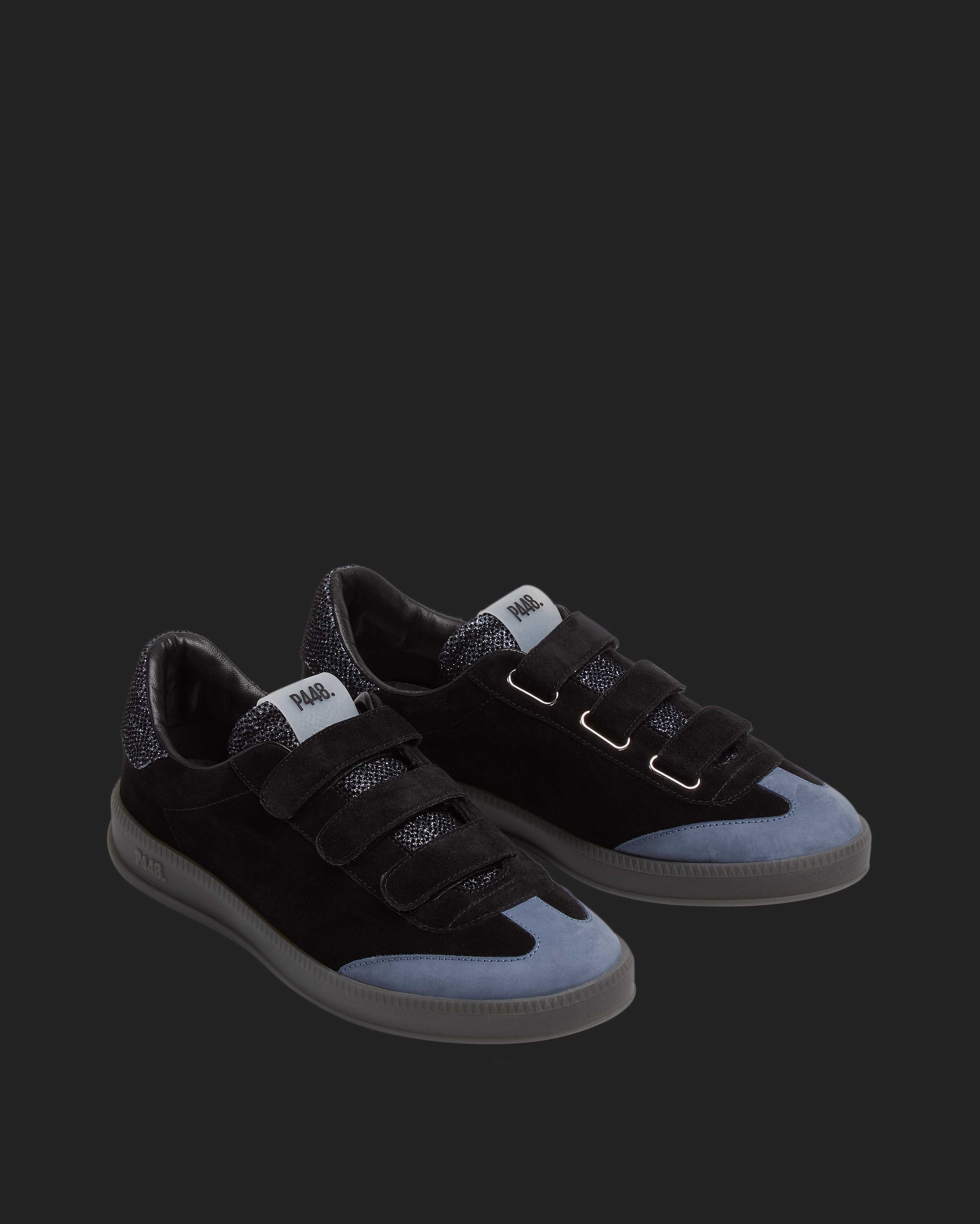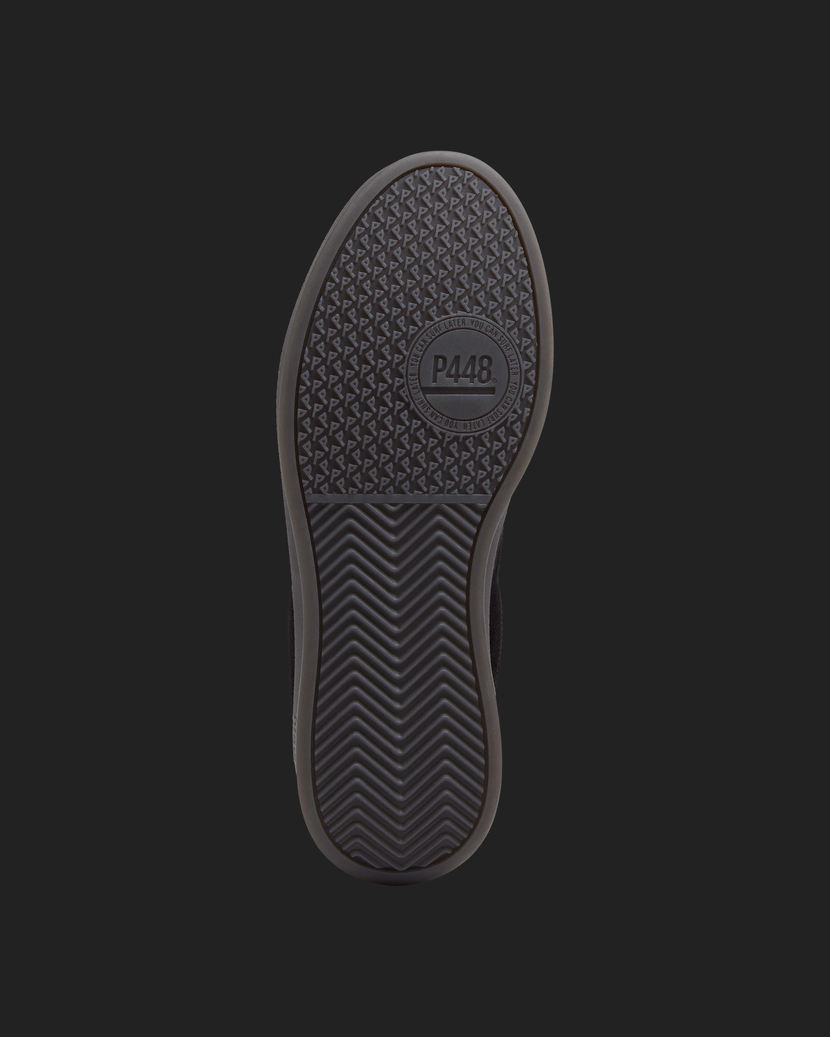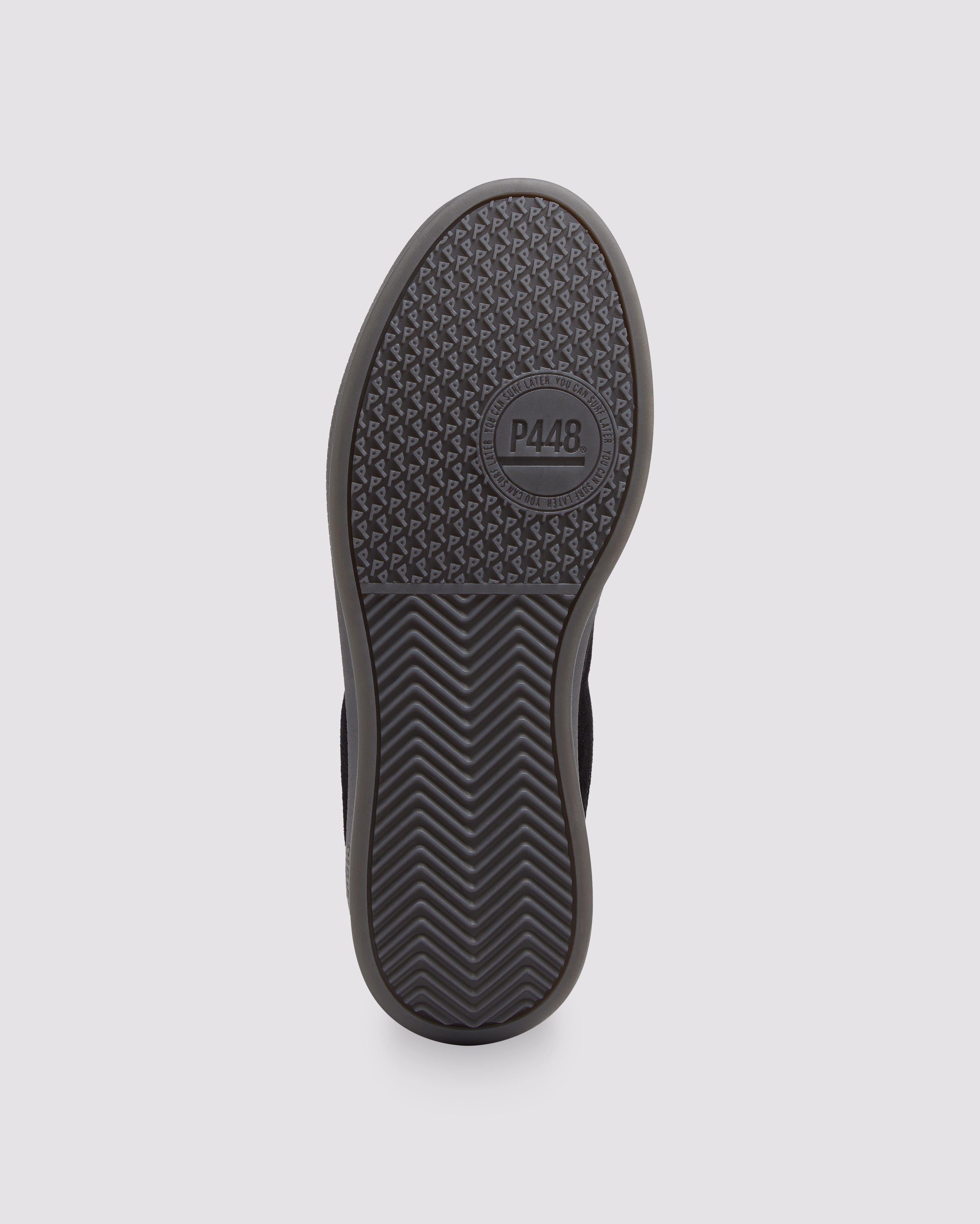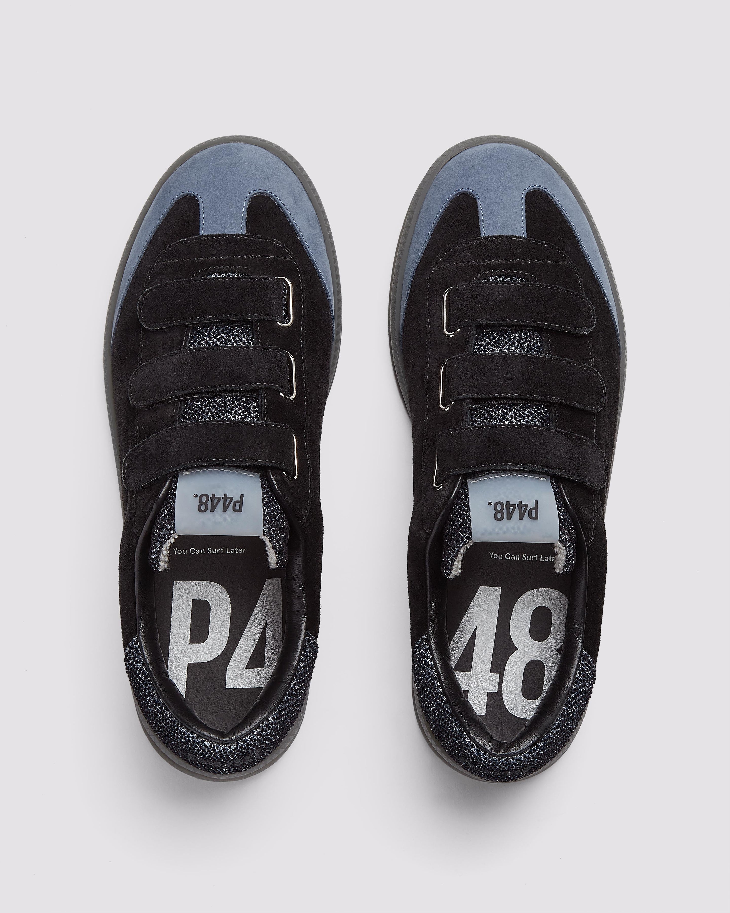 Slip into the Capri Phantom for a sleek suede look. This effortless low top is wrapped in black suede with contrasting silver glitter and velvet dot trims and accents. Black suede straps and our P448 semi-transparent black rubber soles finish off the look.
