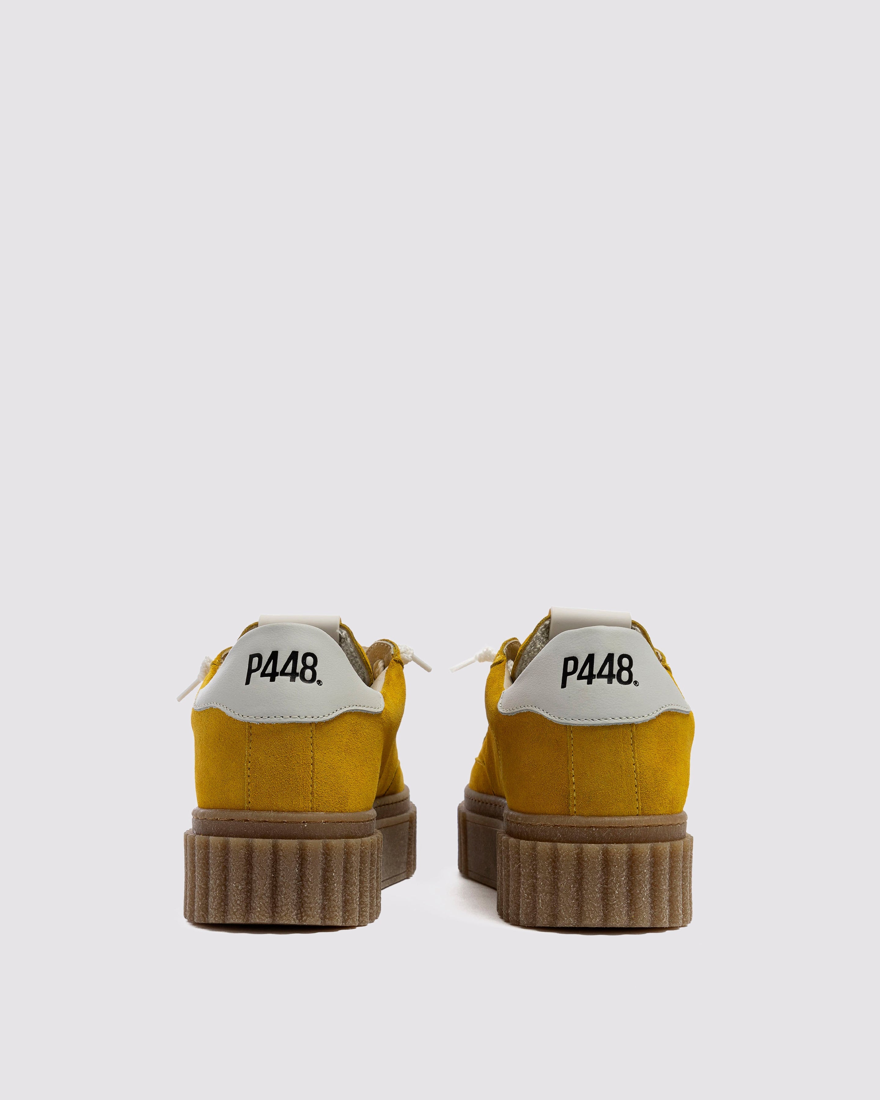 The Creeper Marigold is wrapped in yellow suede, grounded by a white leather heel tab and white laces. Our signature P448 amber gum soles get a statement sneaker update with the bold platform crepe design.