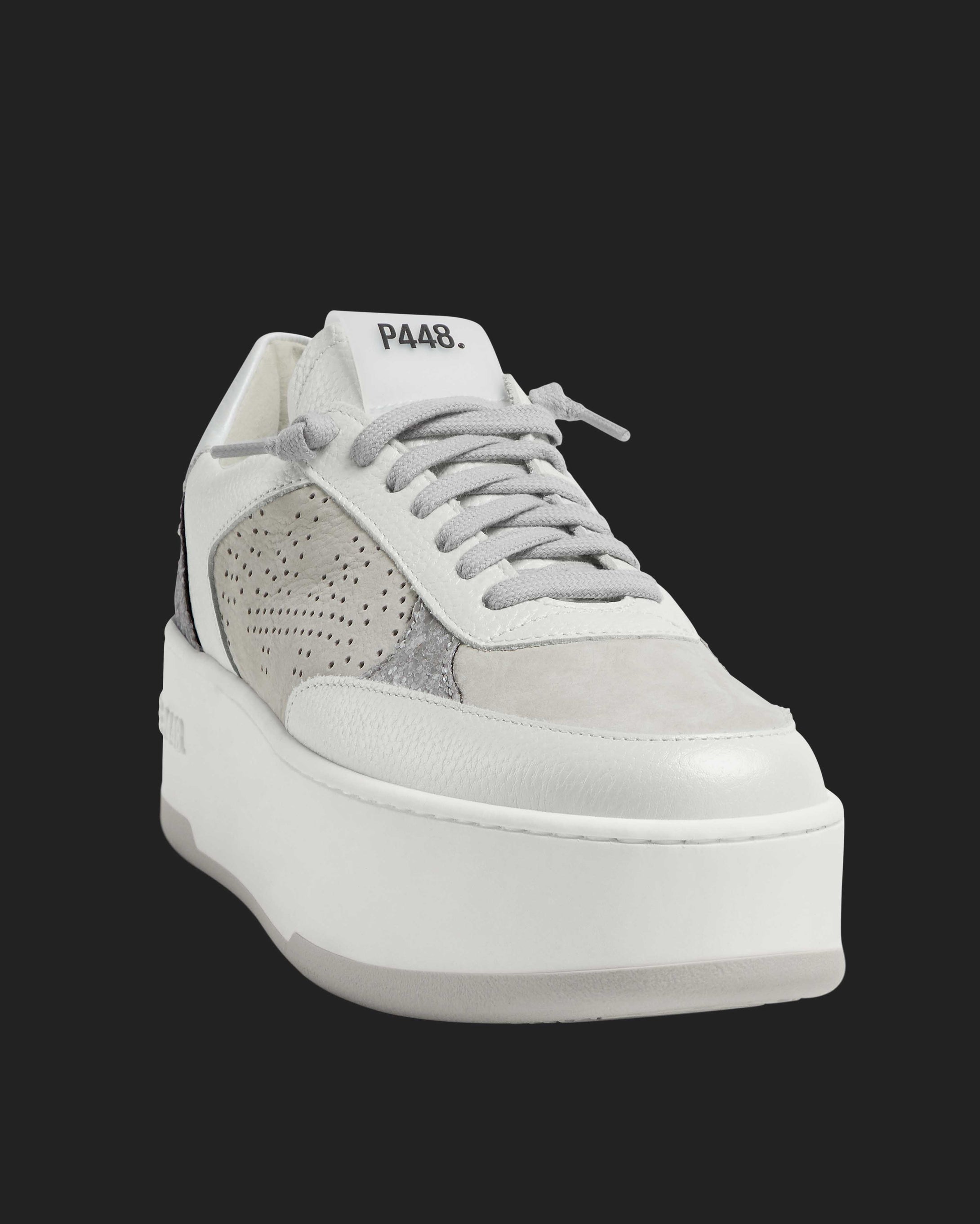 The Empire Phantom is wrapped in white pearl leather, accented by a grey glitter heel. Grey cotton laces, our signature ultra-high platform sole and grey tread heighten the look.