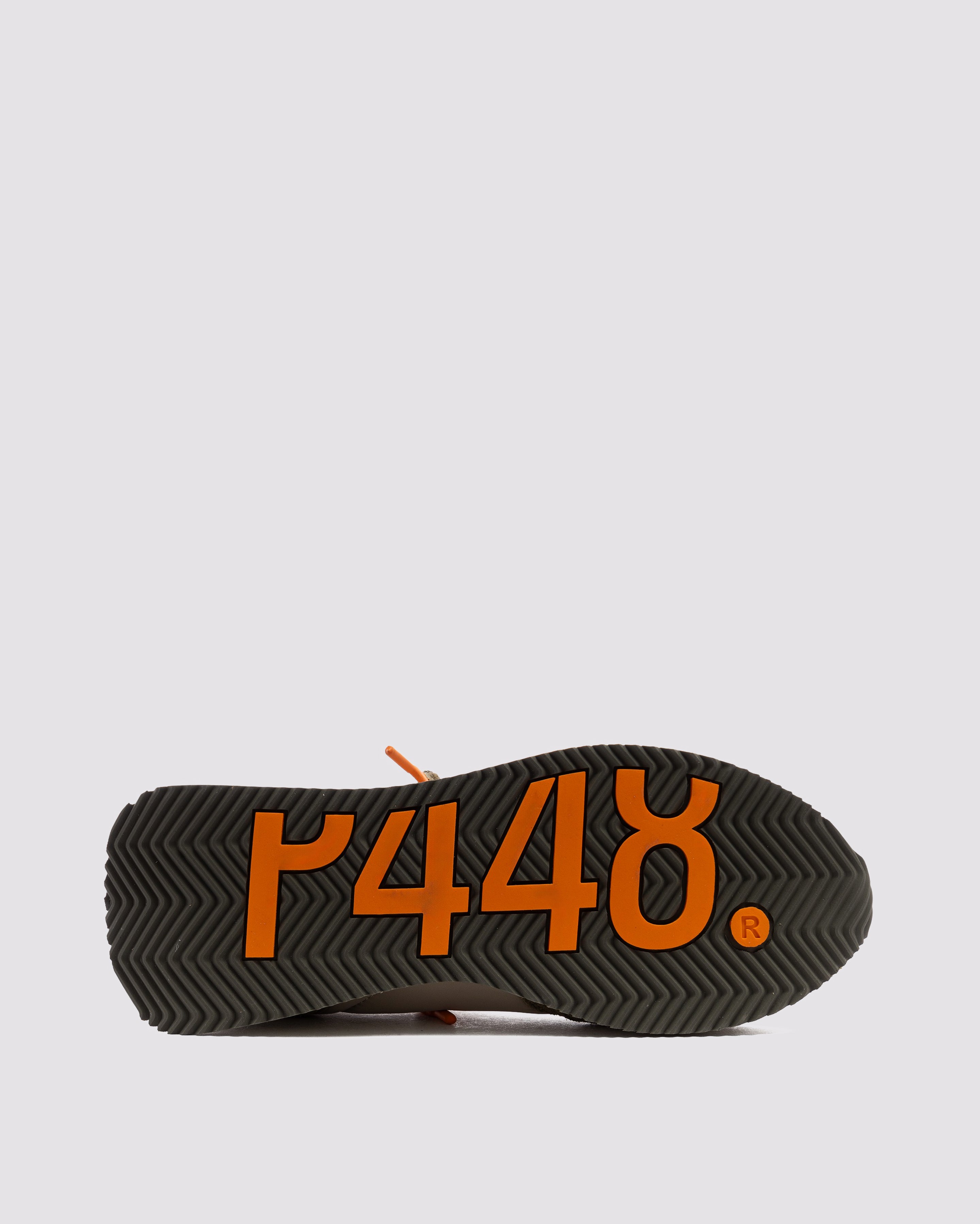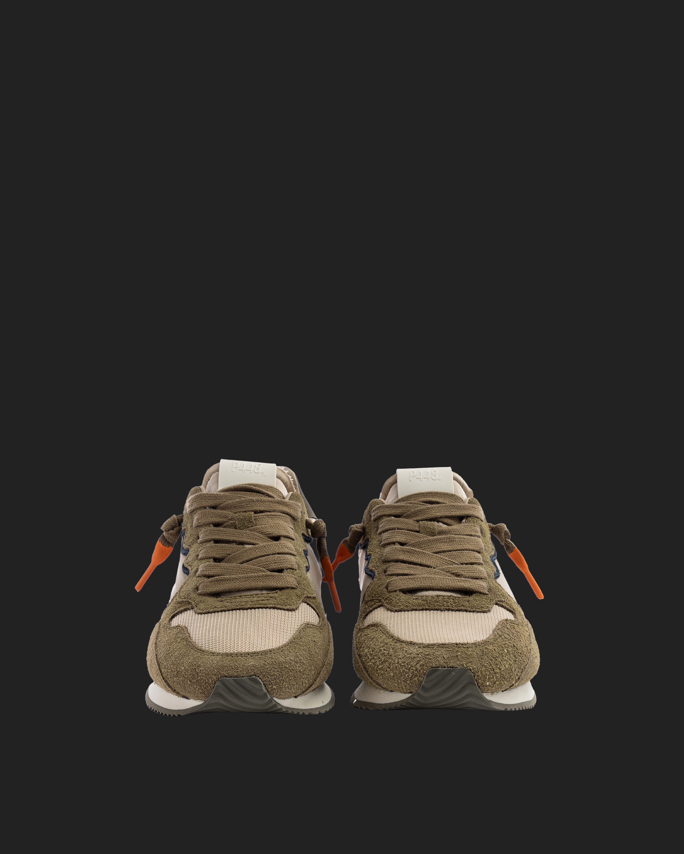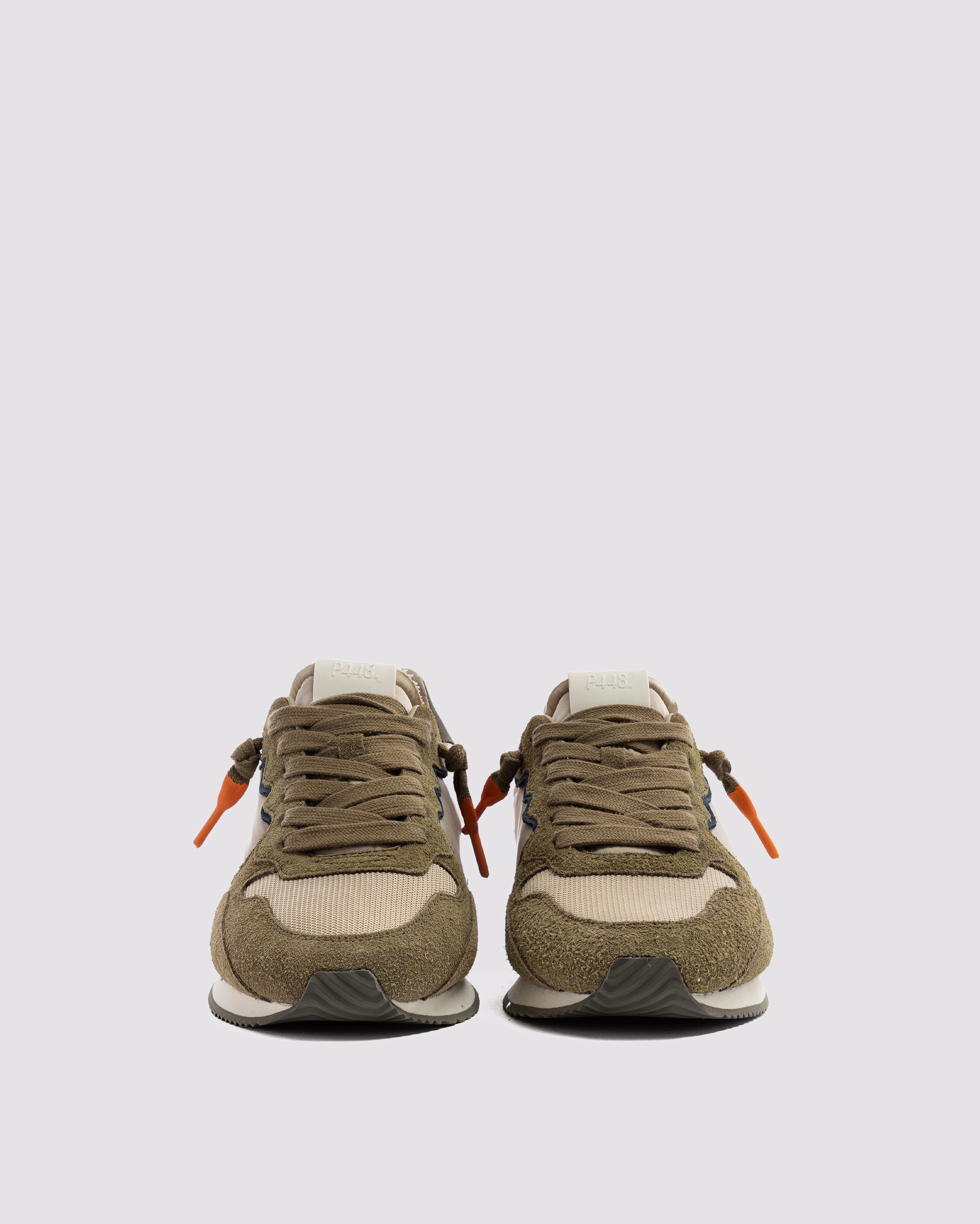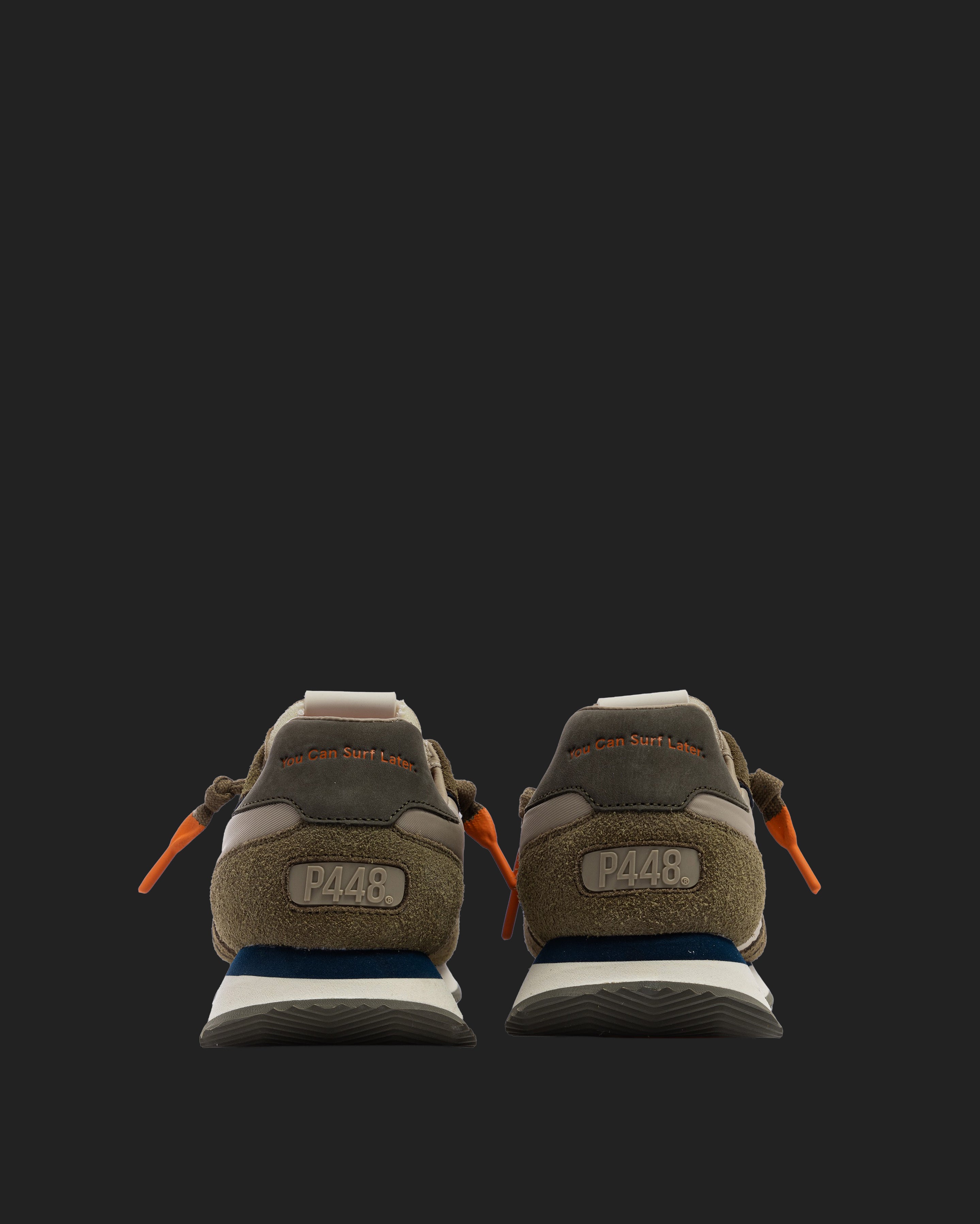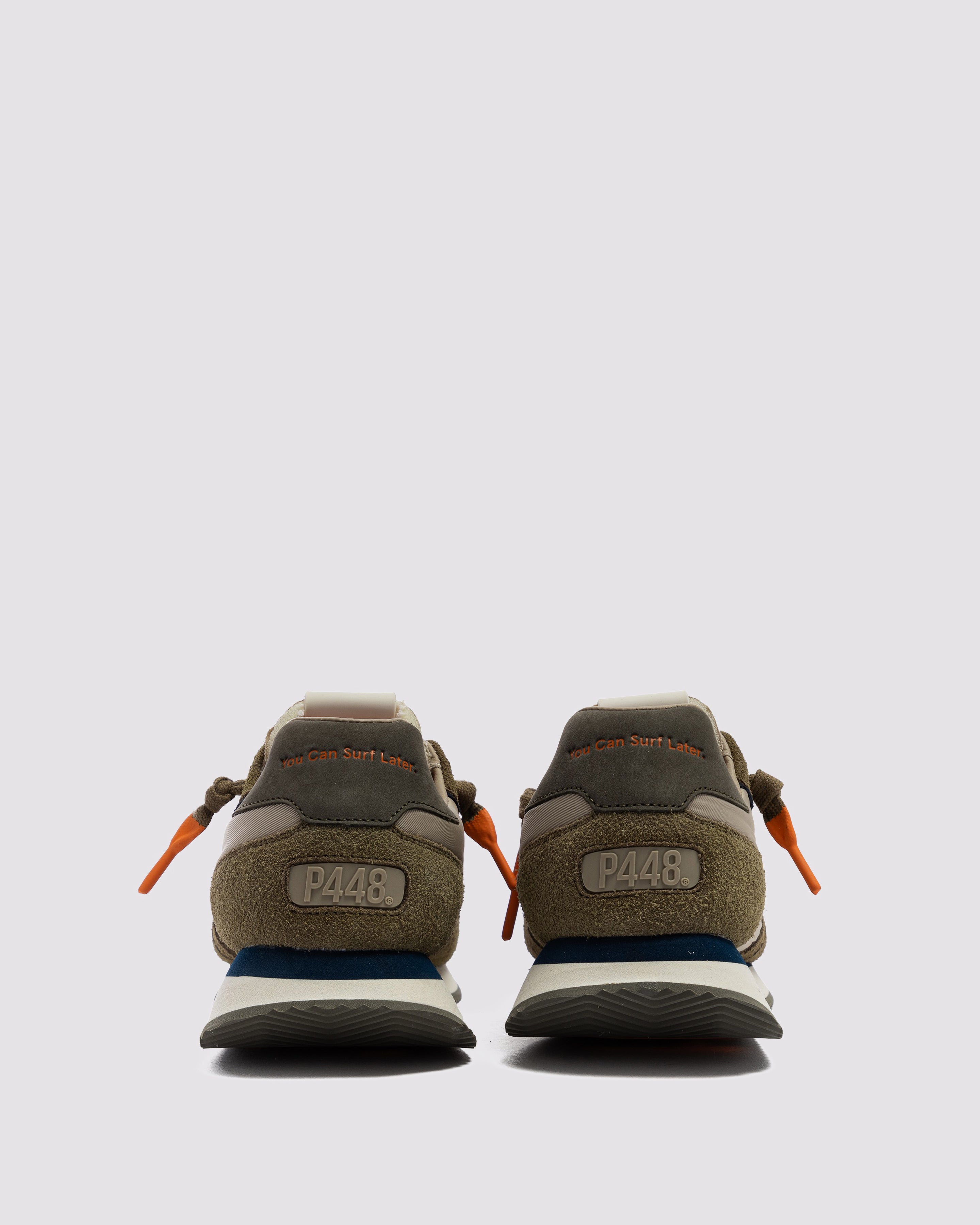 The Jesse Beige/Green features an army green suede and grey nylon design complemented by army green suede accents. Army green cotton laces with orange silicone aglets, Vibram Ecostep Natural rubber soles and our signature P448 amber treads finish off the sporty look.
