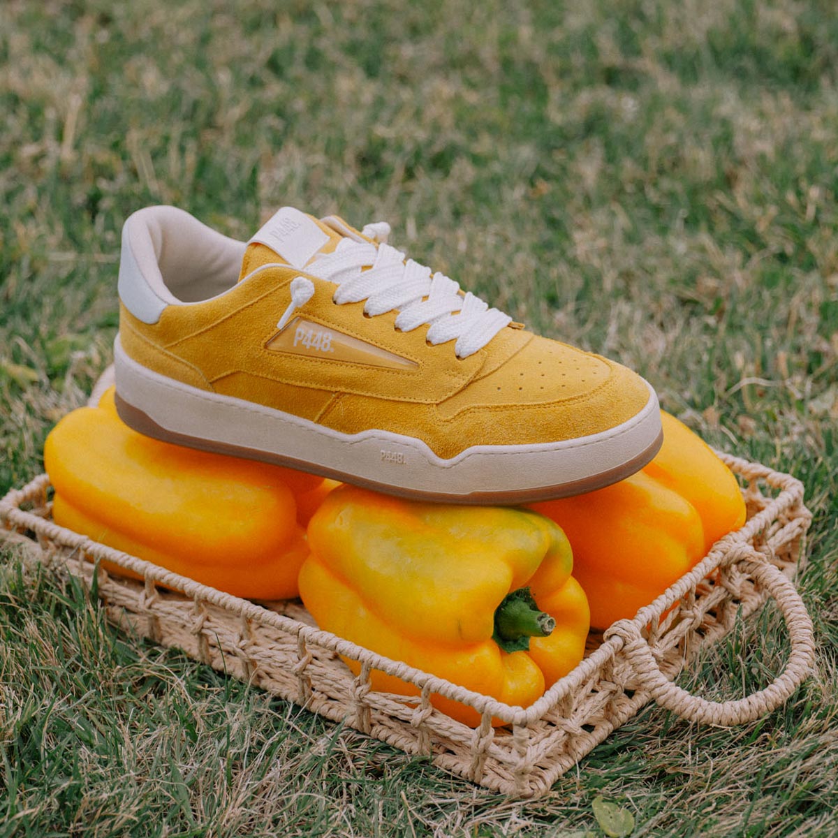 The John Ochre is wrapped in white leather, complemented by beige suede accents and a printed yellow suede heel tab. Cream cotton laces and our signature P448 hand-distressed rubber sole with neutral tread ground the look.