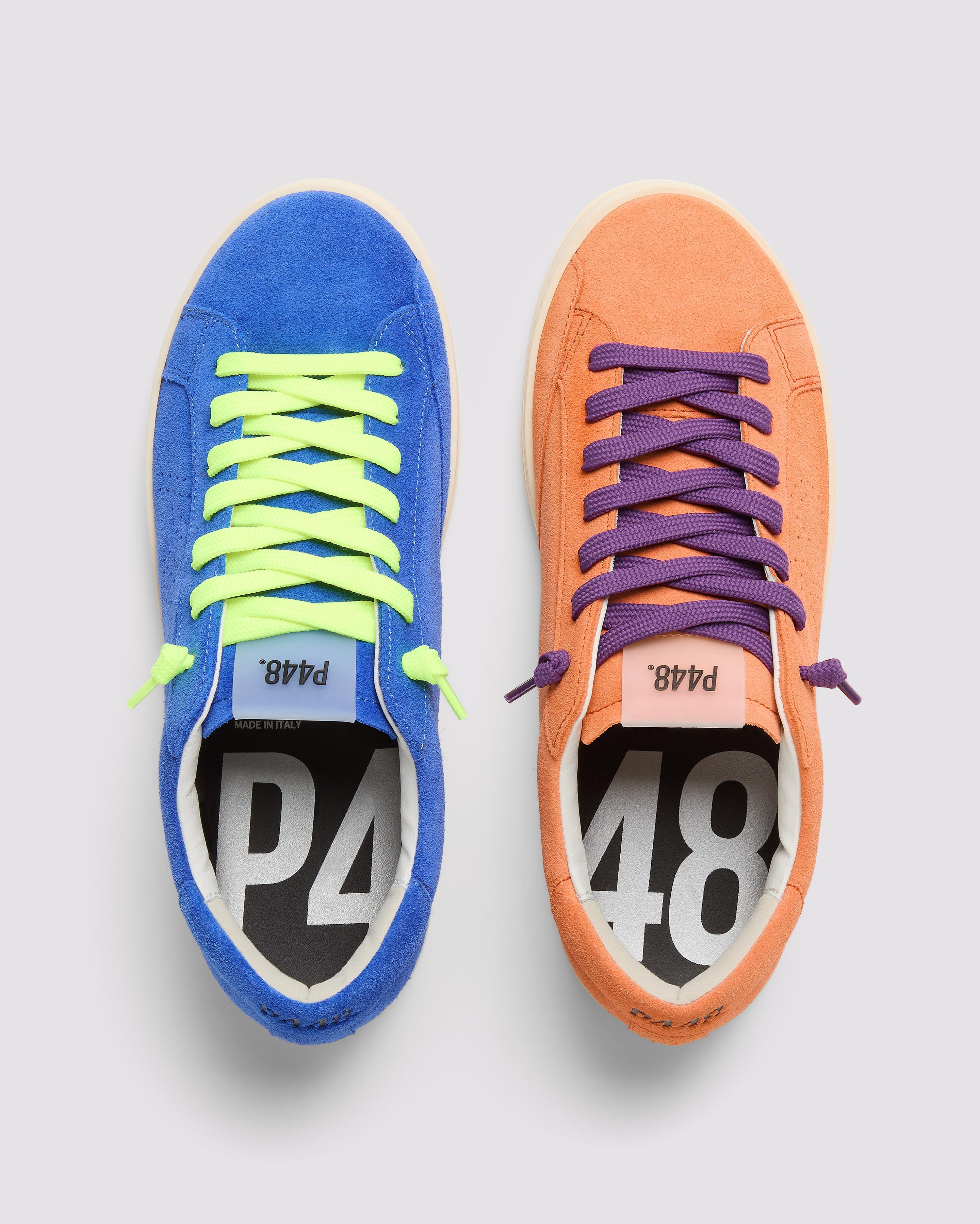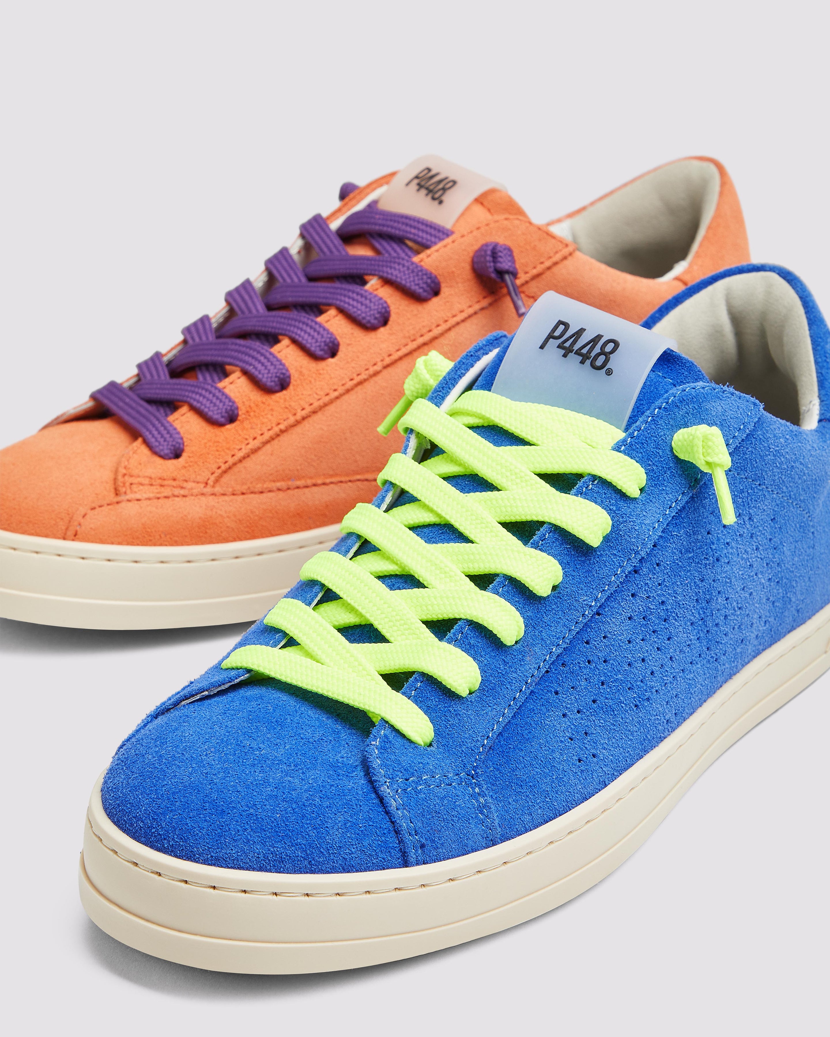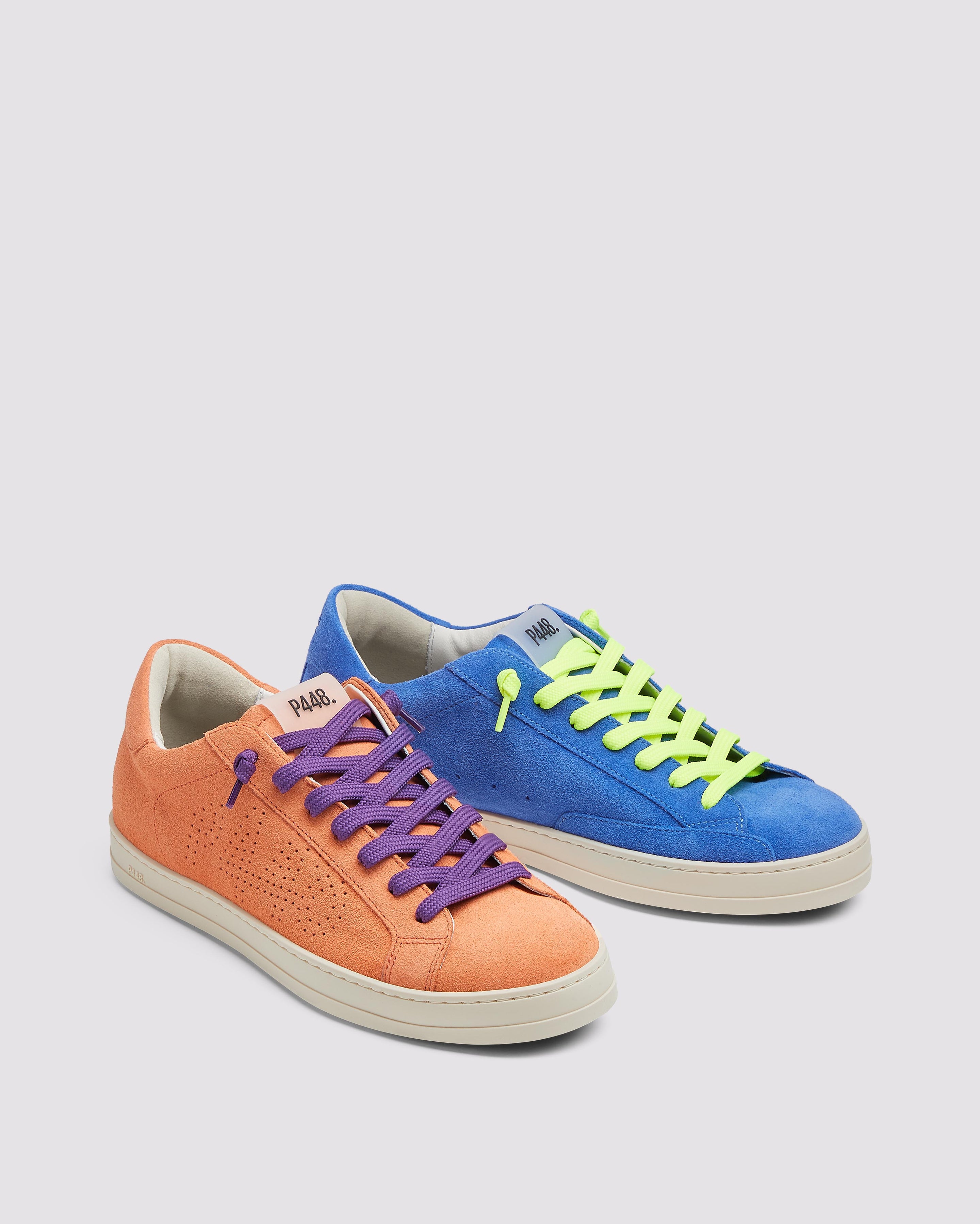 Both feature matching suede tongues, trims, toes, and heel accents. Violet laces on one and yellow laces on the other, along with our signature P448 rubber soles finished with black treads, tie it all together.