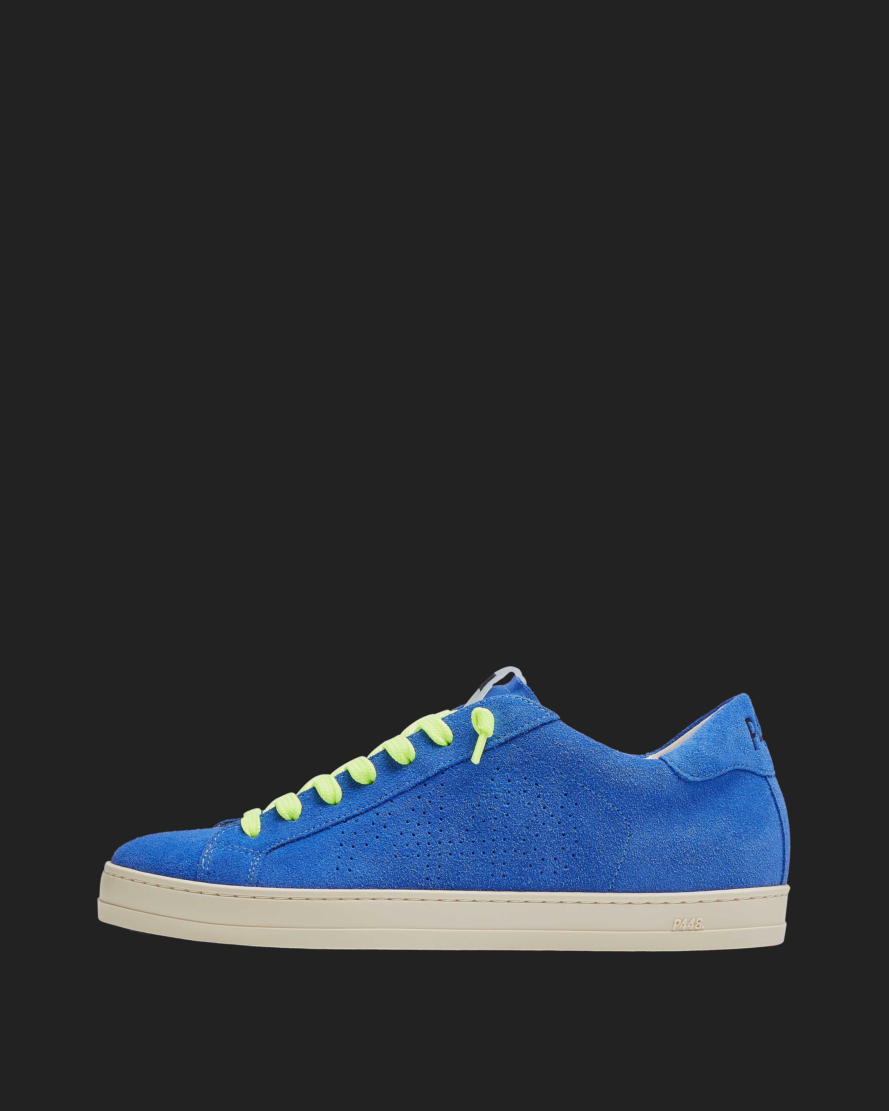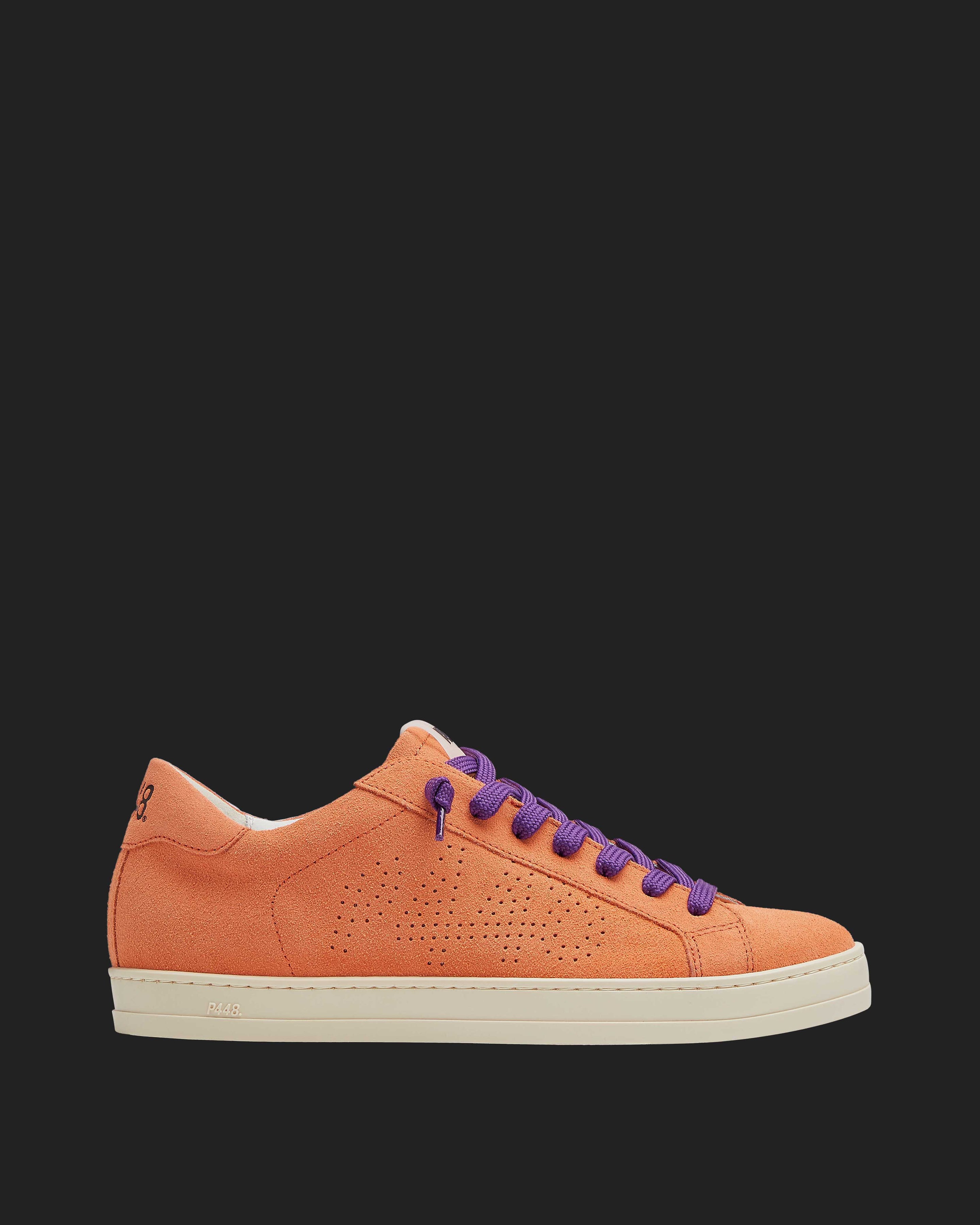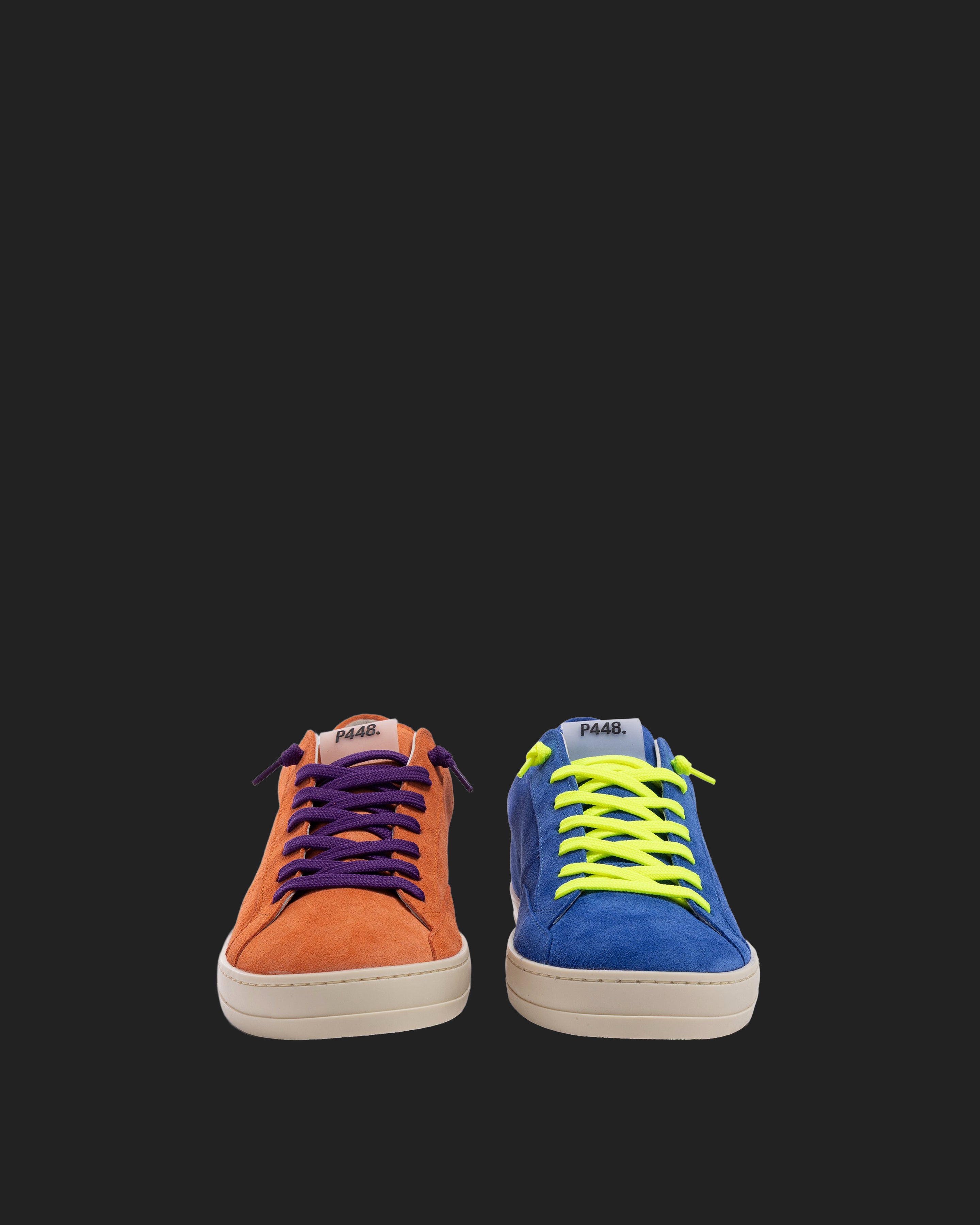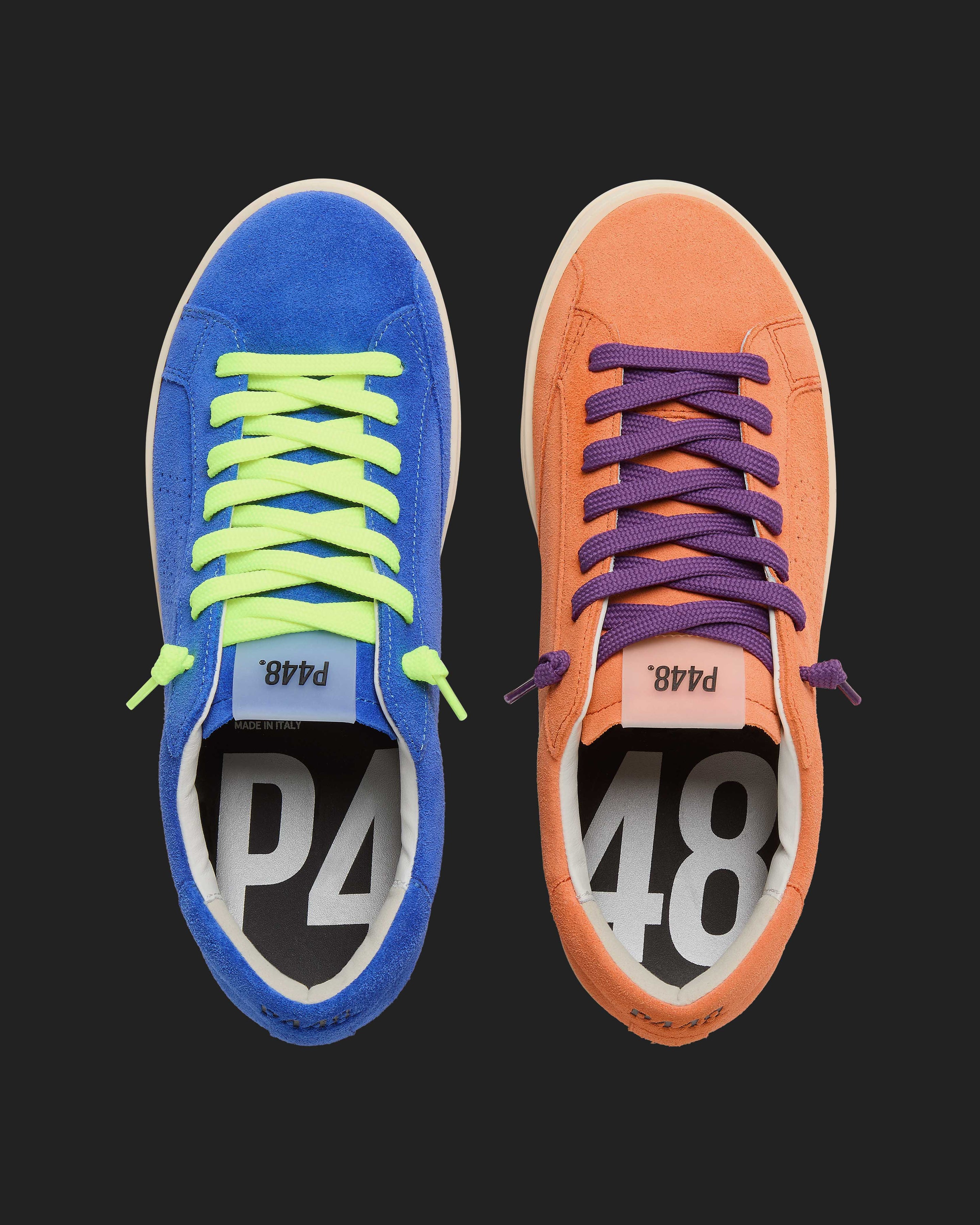 Both feature matching suede tongues, trims, toes, and heel accents. Violet laces on one and yellow laces on the other, along with our signature P448 rubber soles finished with black treads, tie it all together.