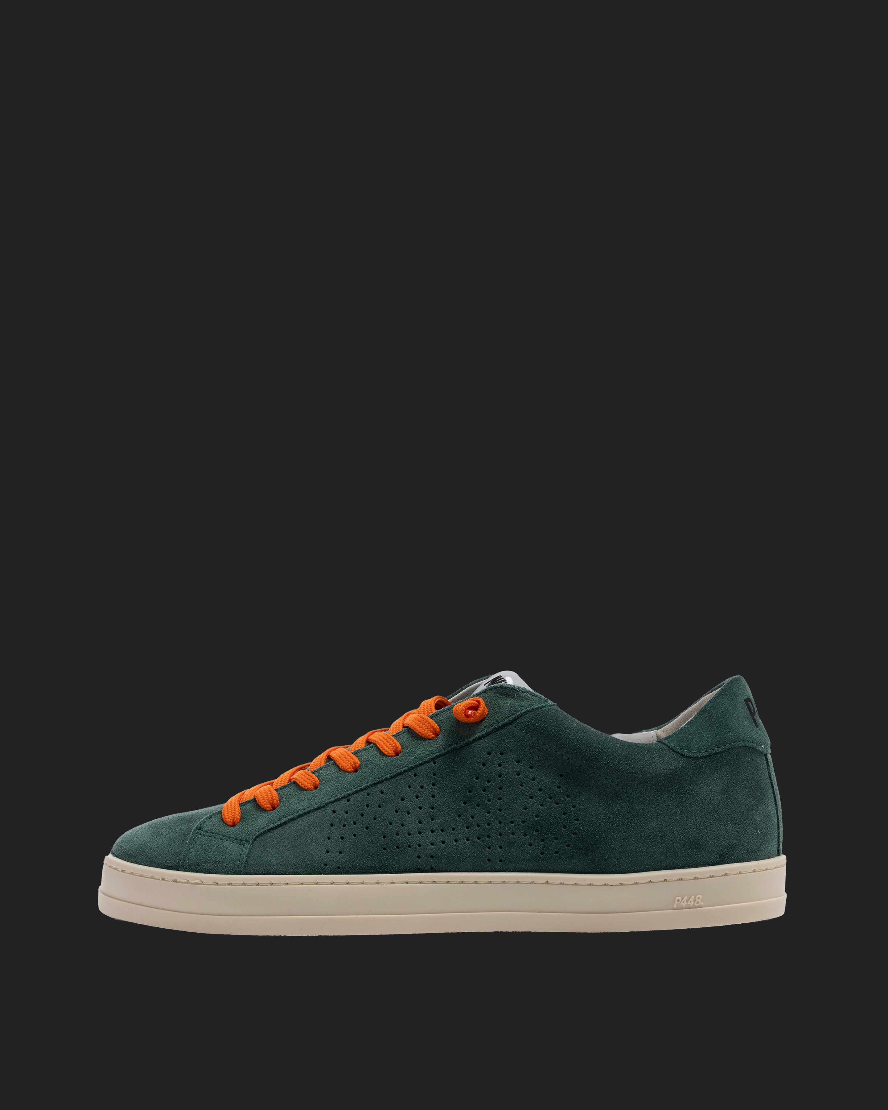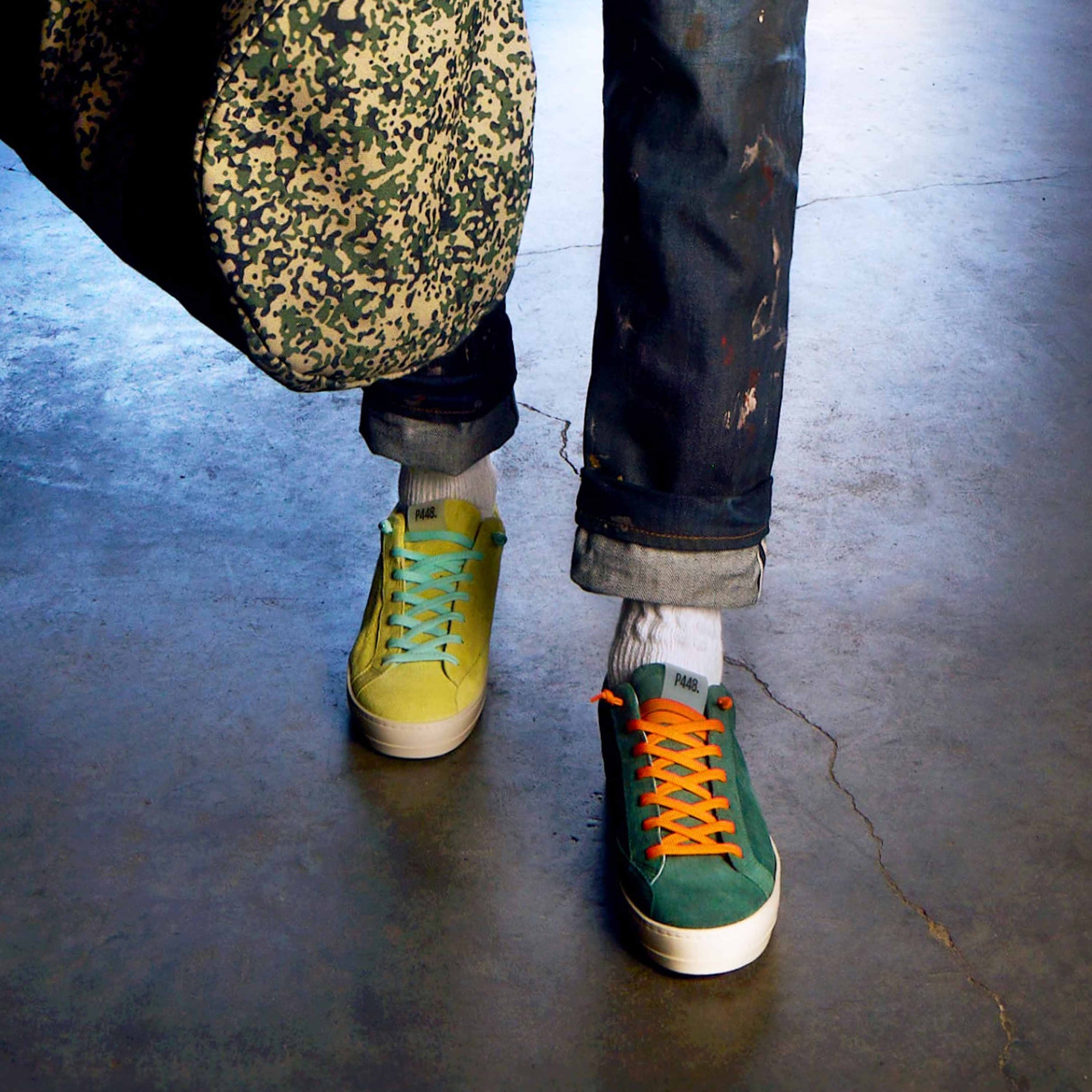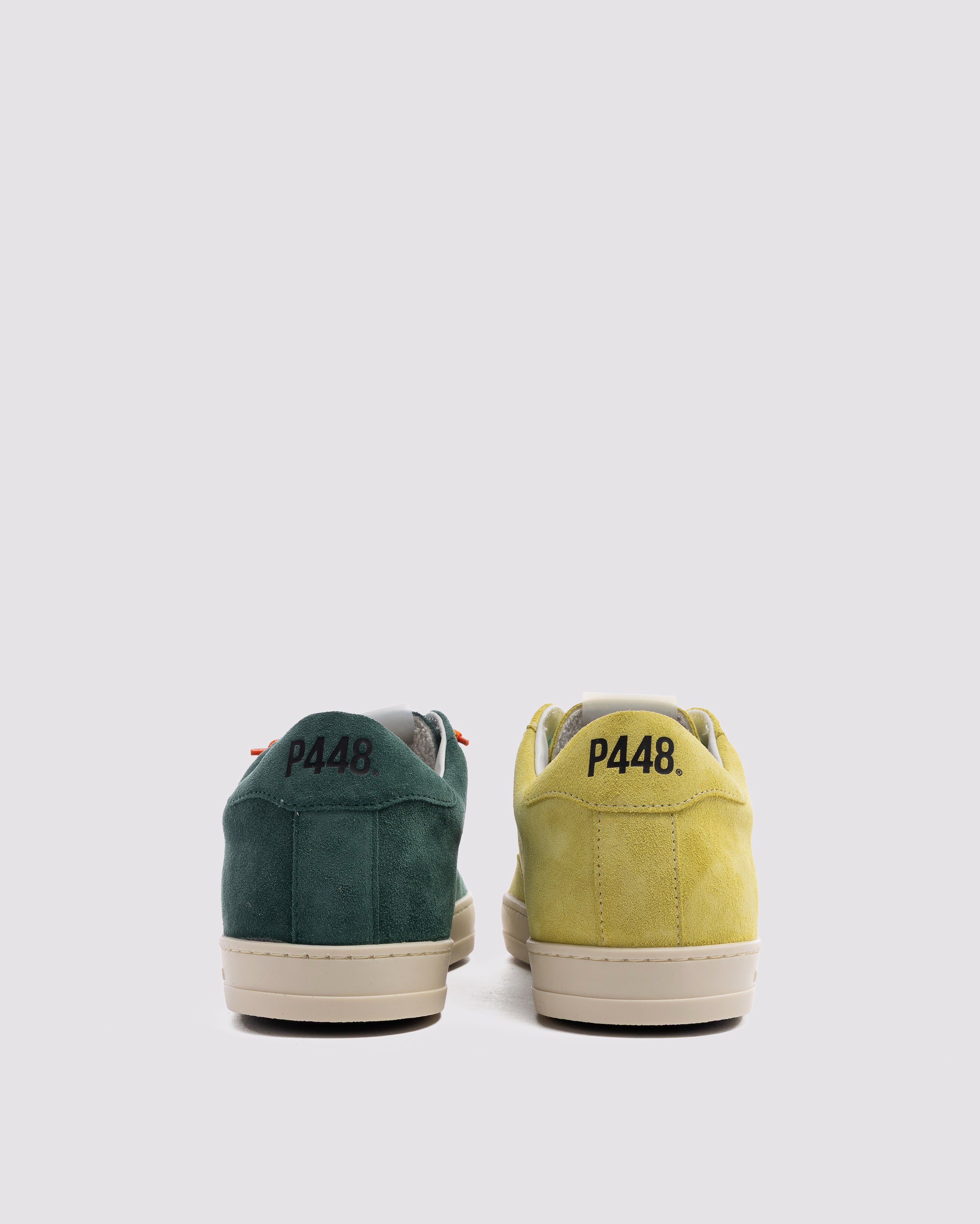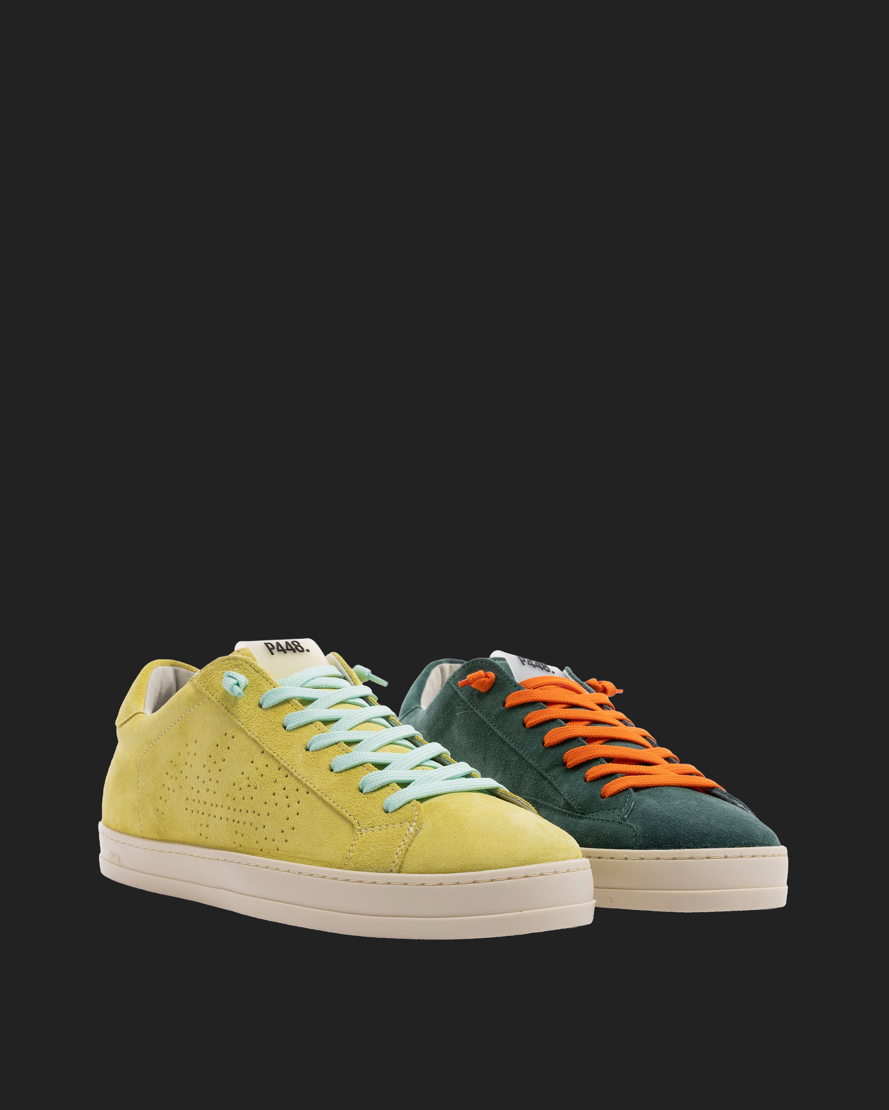 Both feature matching suede tongues, trims, toes, and heel accents. Light blue laces on one and orange laces on the other, along with our signature P448 rubber soles finished with black treads, tie it all together.