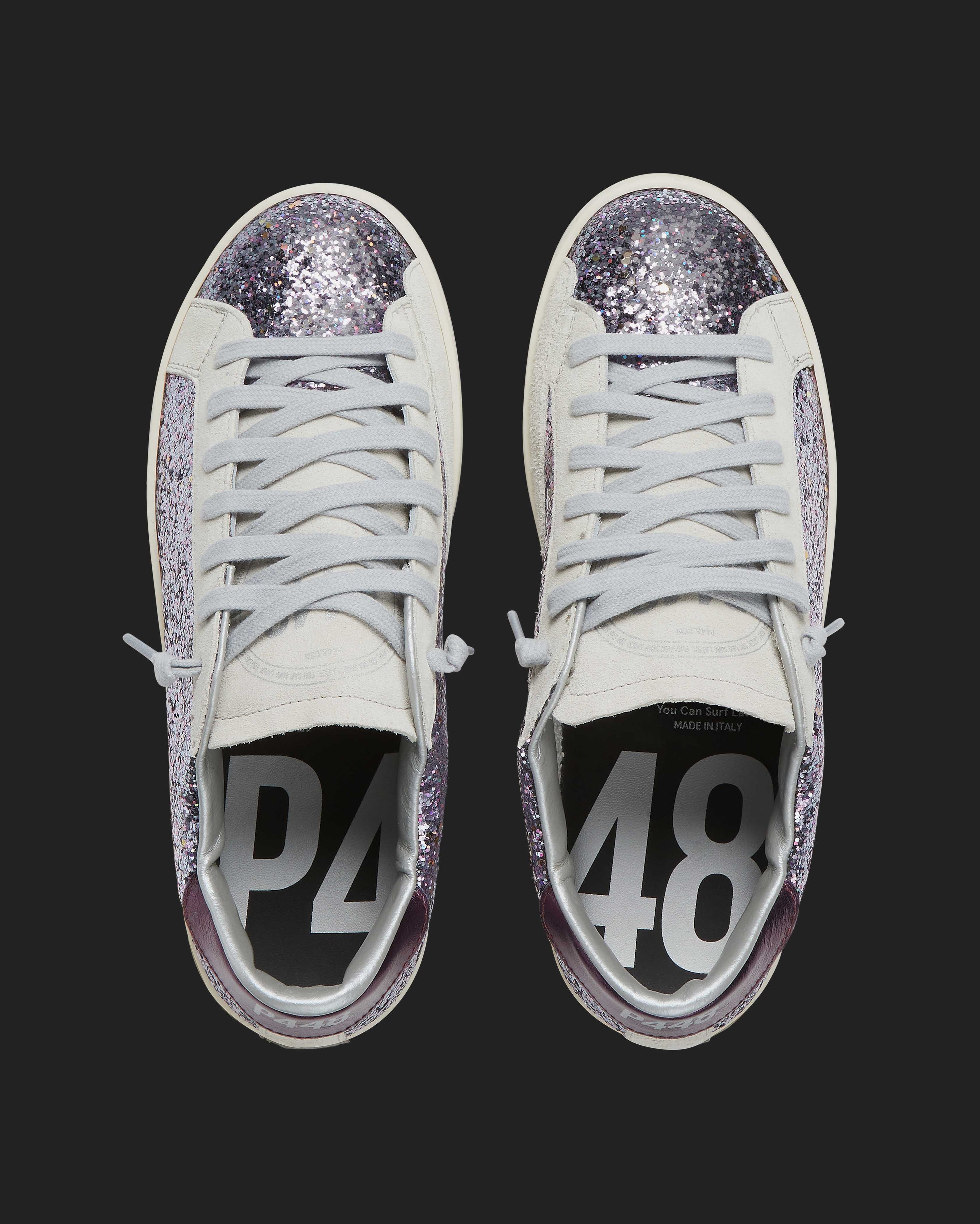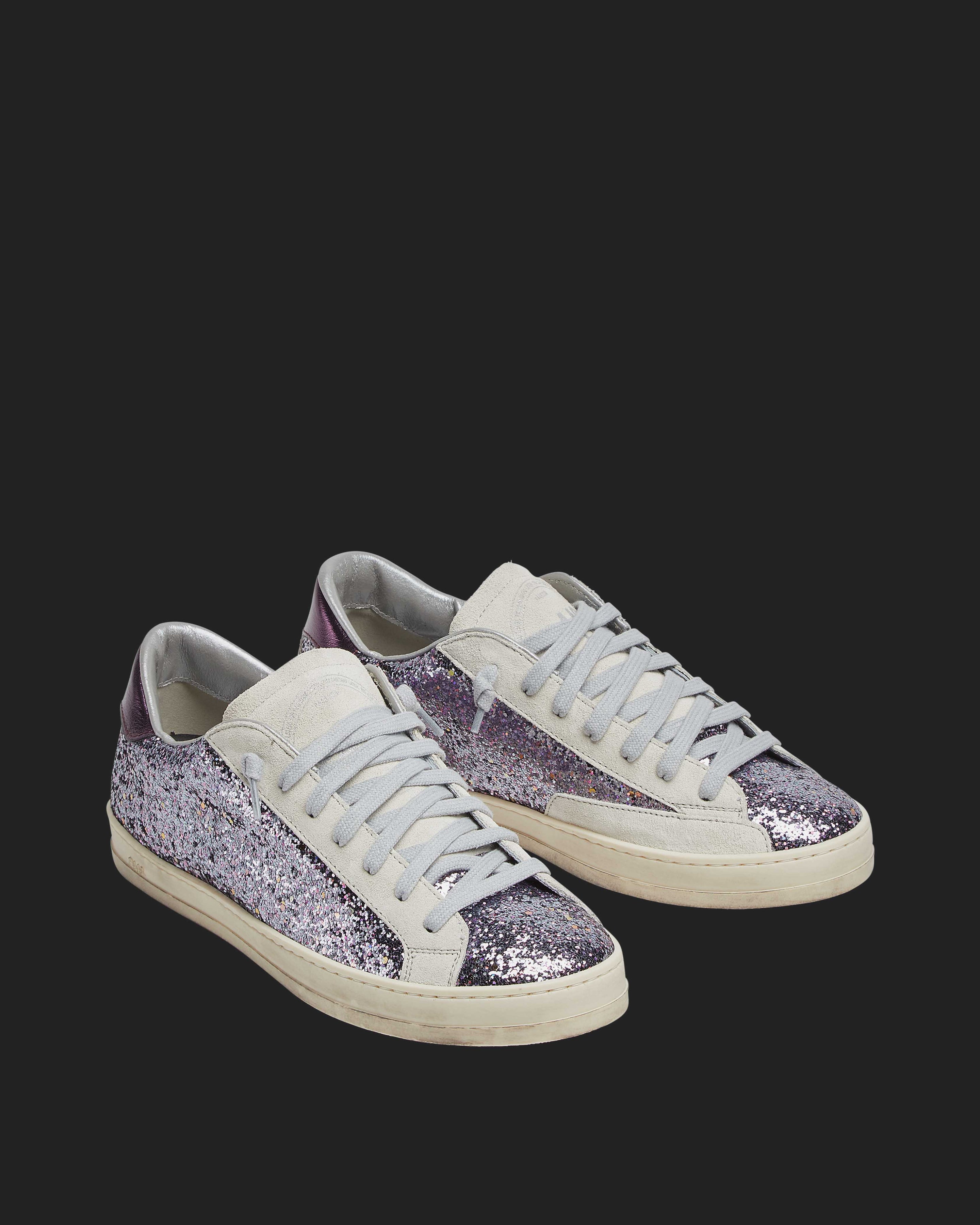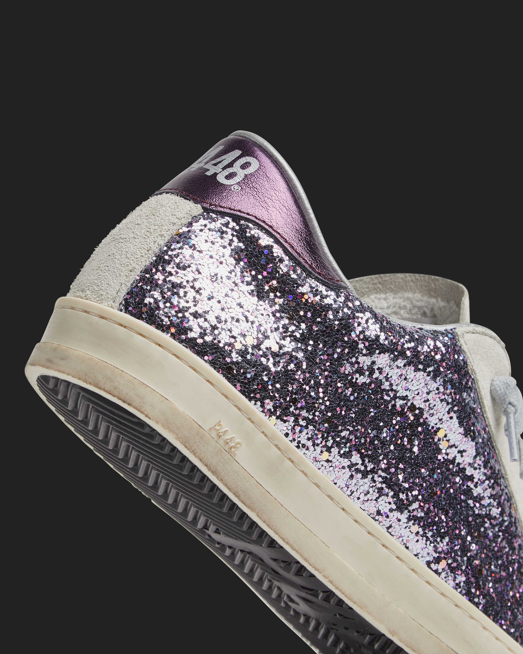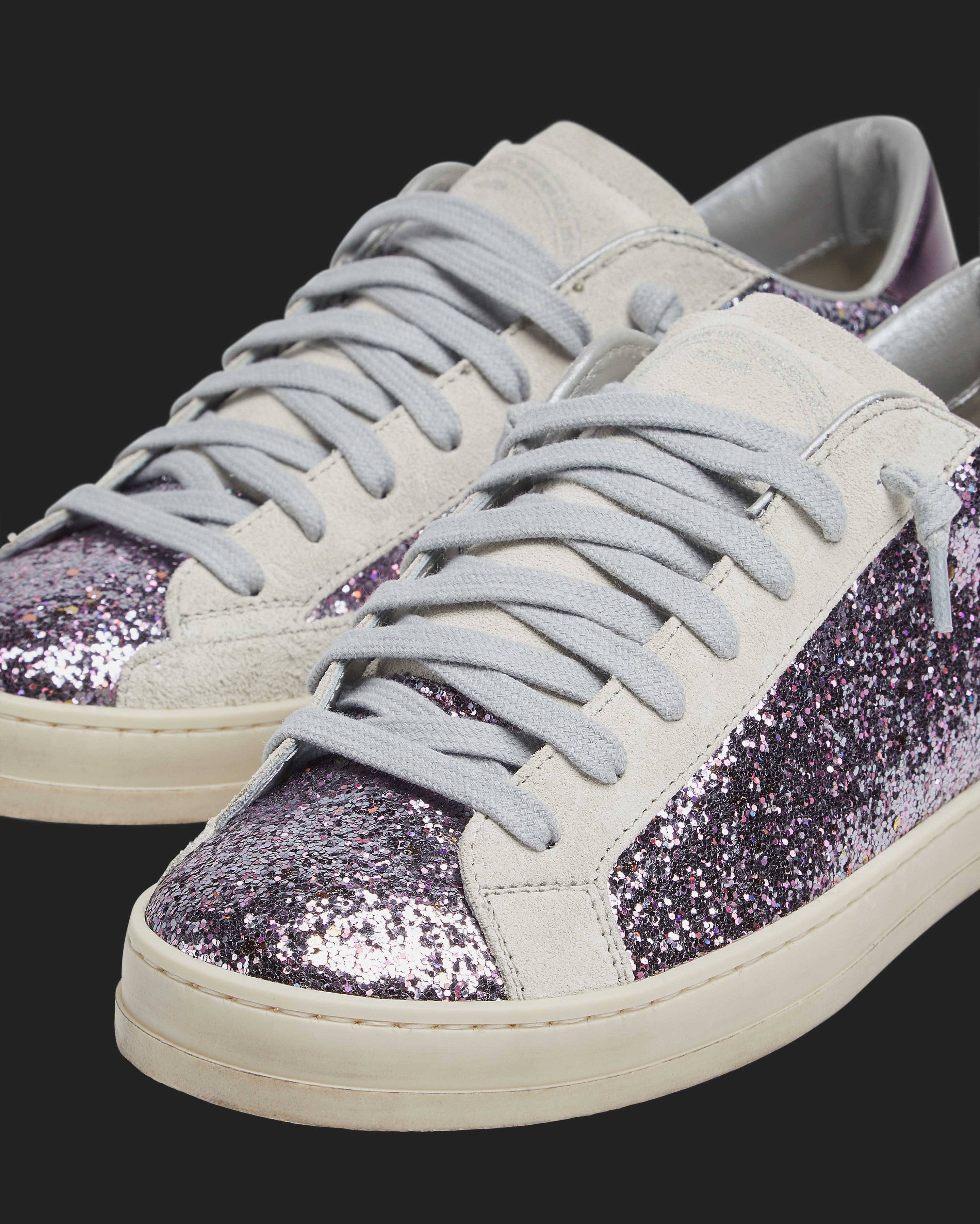 The John Glitter/Purple is wrapped in sparkly light purple glitter, grounded by beige suede accents and a matching purple metallic heel tab. Grey cotton laces and our signature P448 hand-distressed rubber soles with black treads tie it all together.