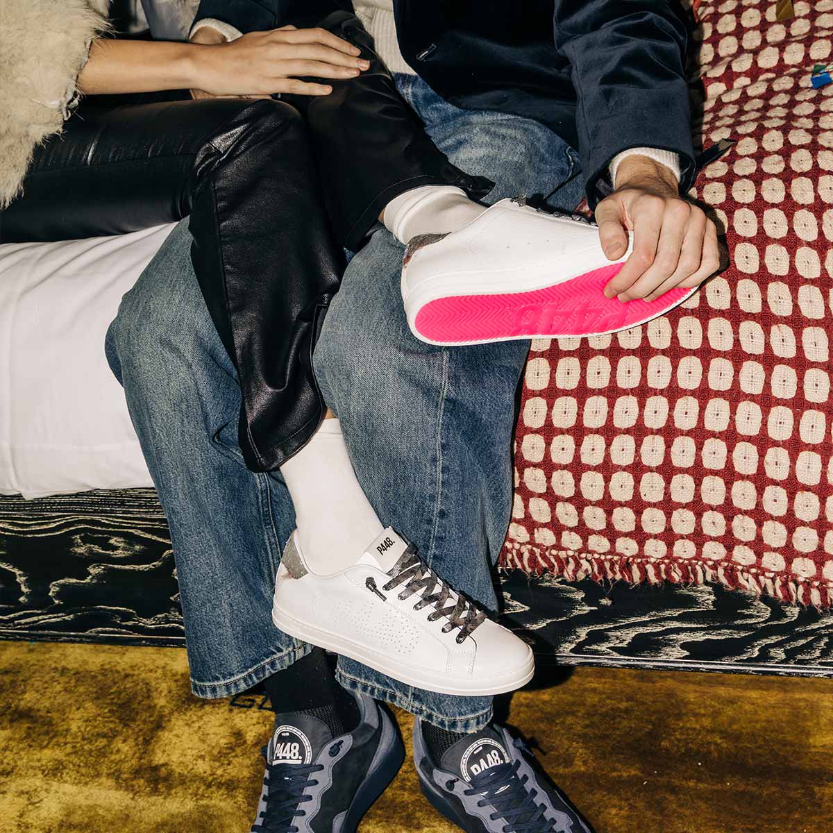 The John Matte/Glitter is wrapped in white leather and suede, accented by a silver glitter heel tab. Fuchsia cotton laces and our signature P448 hand-distressed rubber soles with fuchsia treads tie it all together.