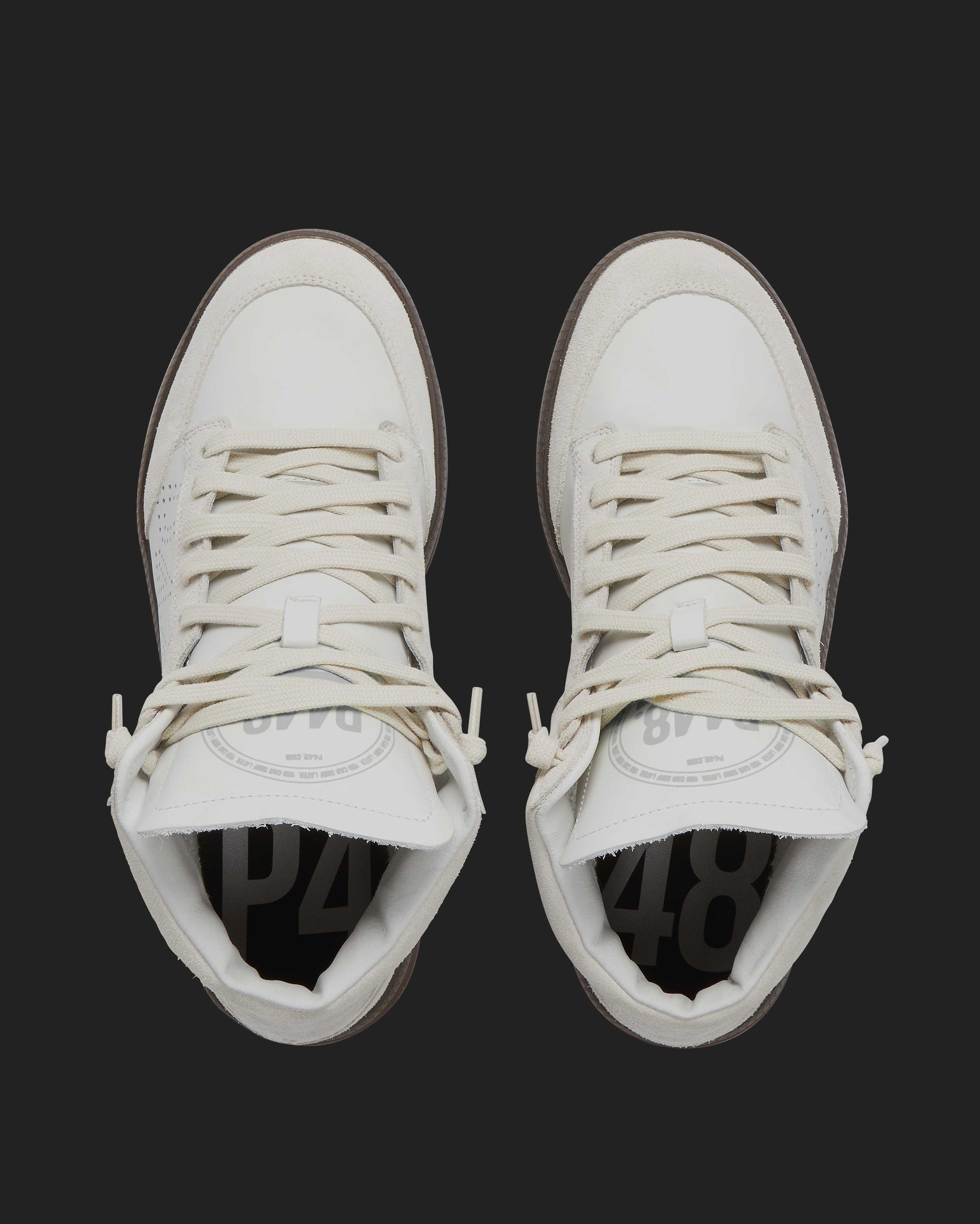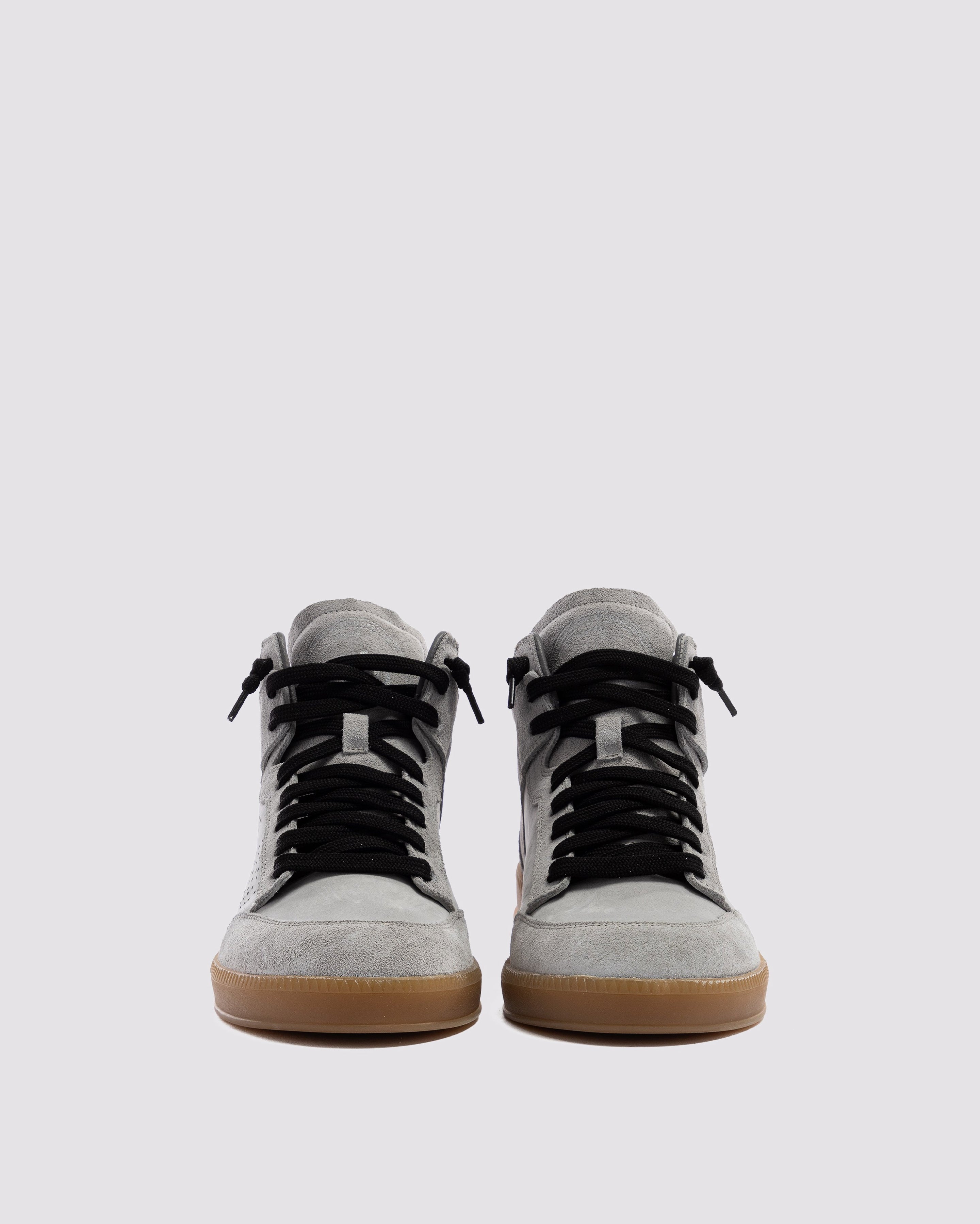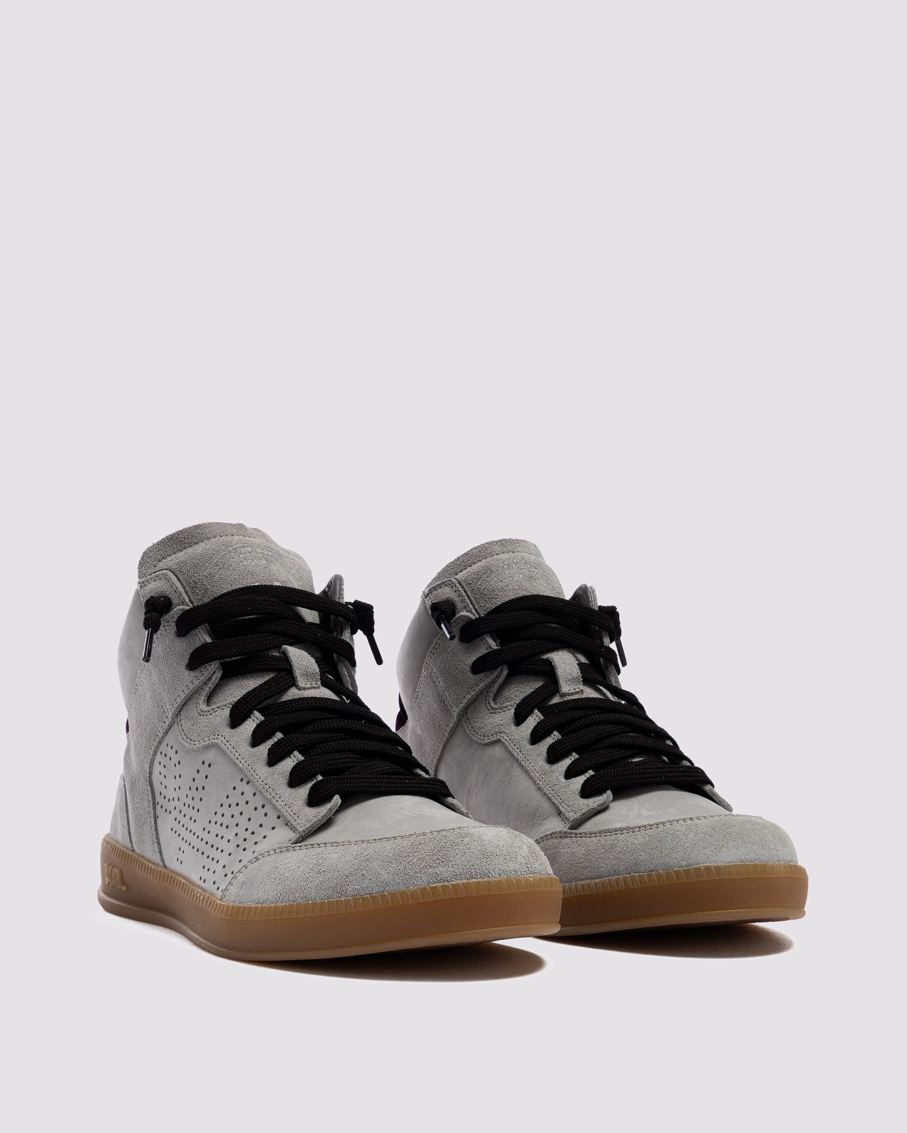 The London Grey features all-over light grey nubuck leather and suede accented by a burgundy velvet heel tab. Black laces and our signature P448 amber gum soles tie it all together.