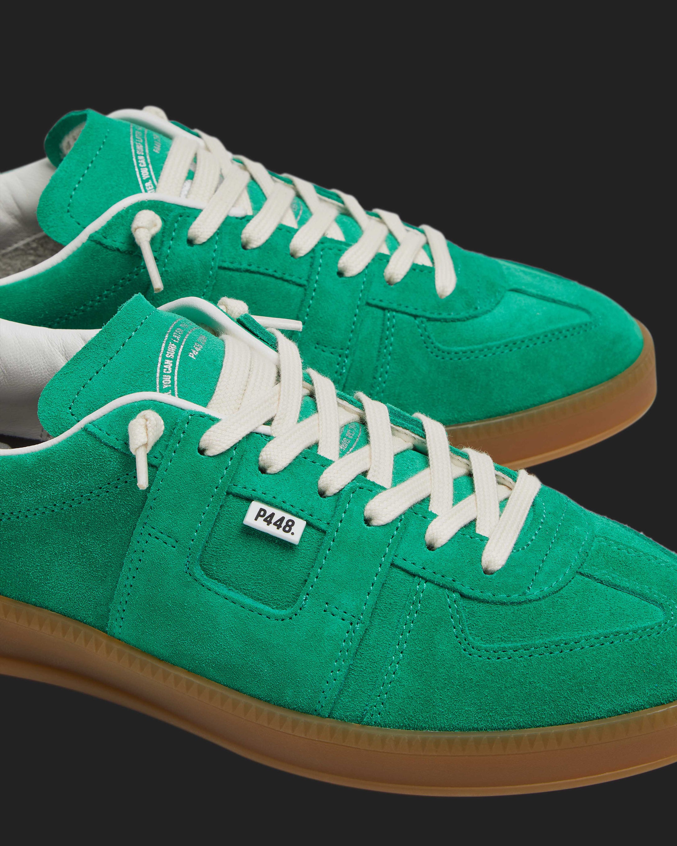 The Monza Green features all-over green suede finished with our signature P448 amber gum soles. Off-white cotton laces finish off the look.
