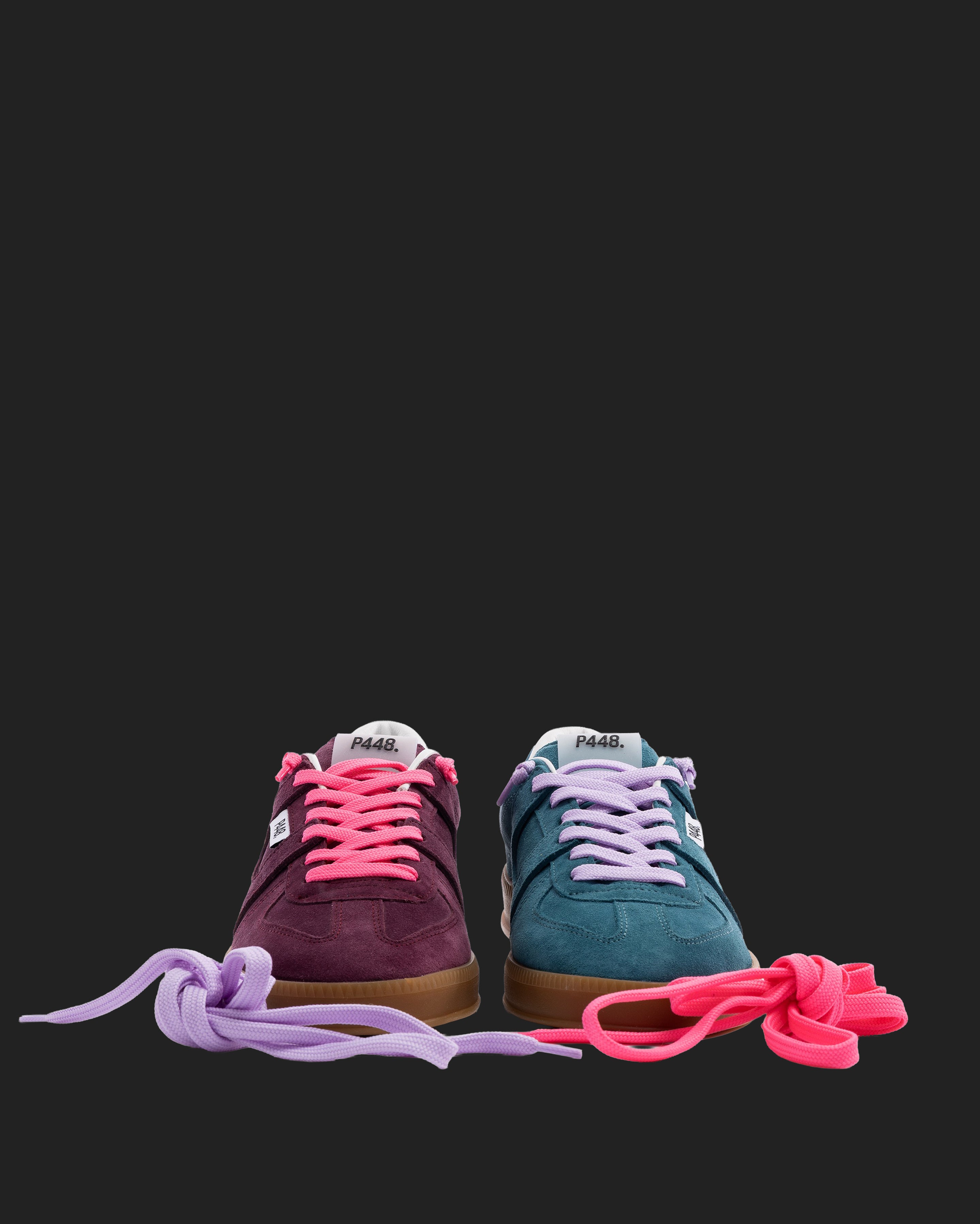 Both feature matching suede tongues, trims, toes, and heel accents. Light blue laces on one and orange laces on the other, along with our signature P448 rubber soles finished with black treads, tie it all together.