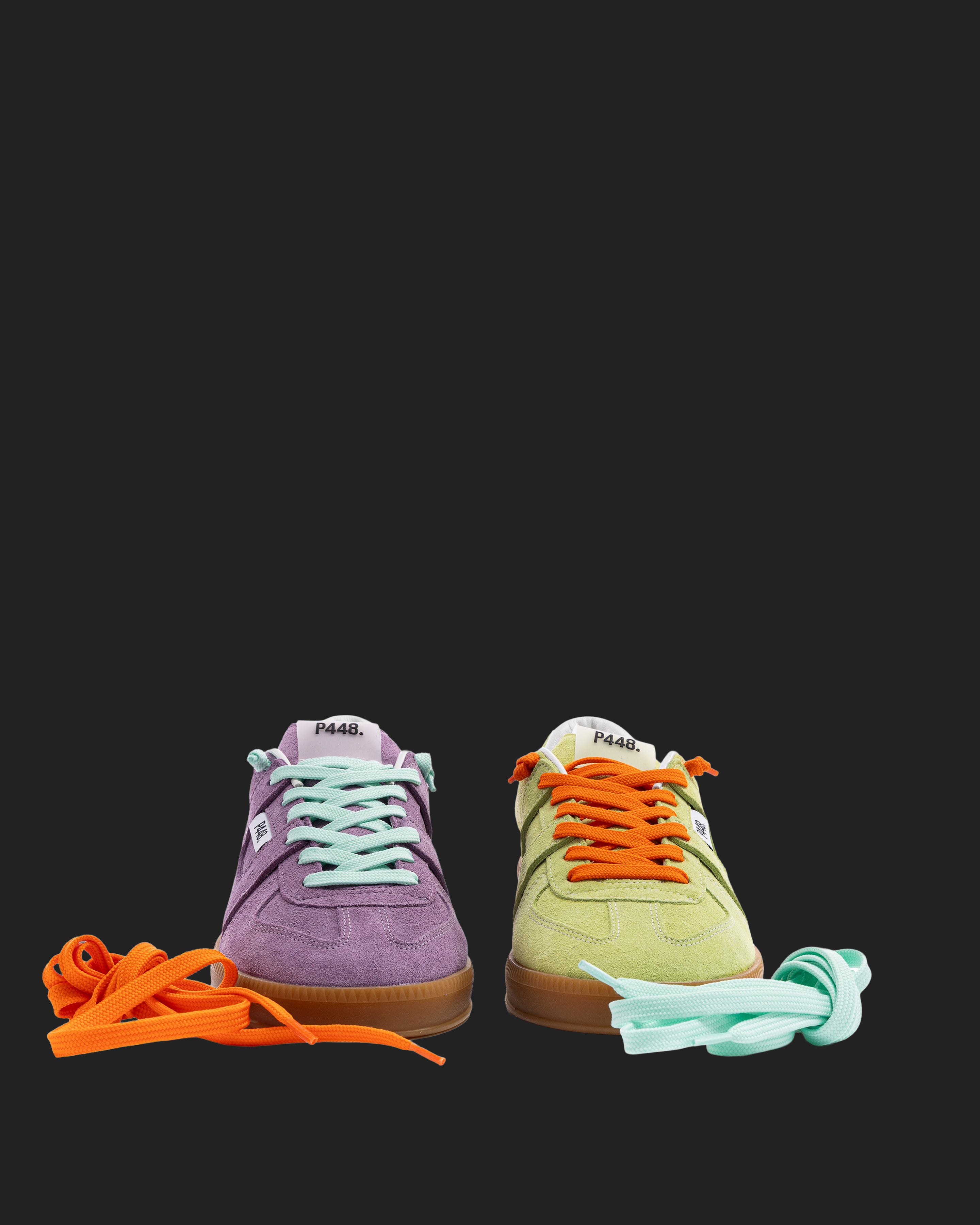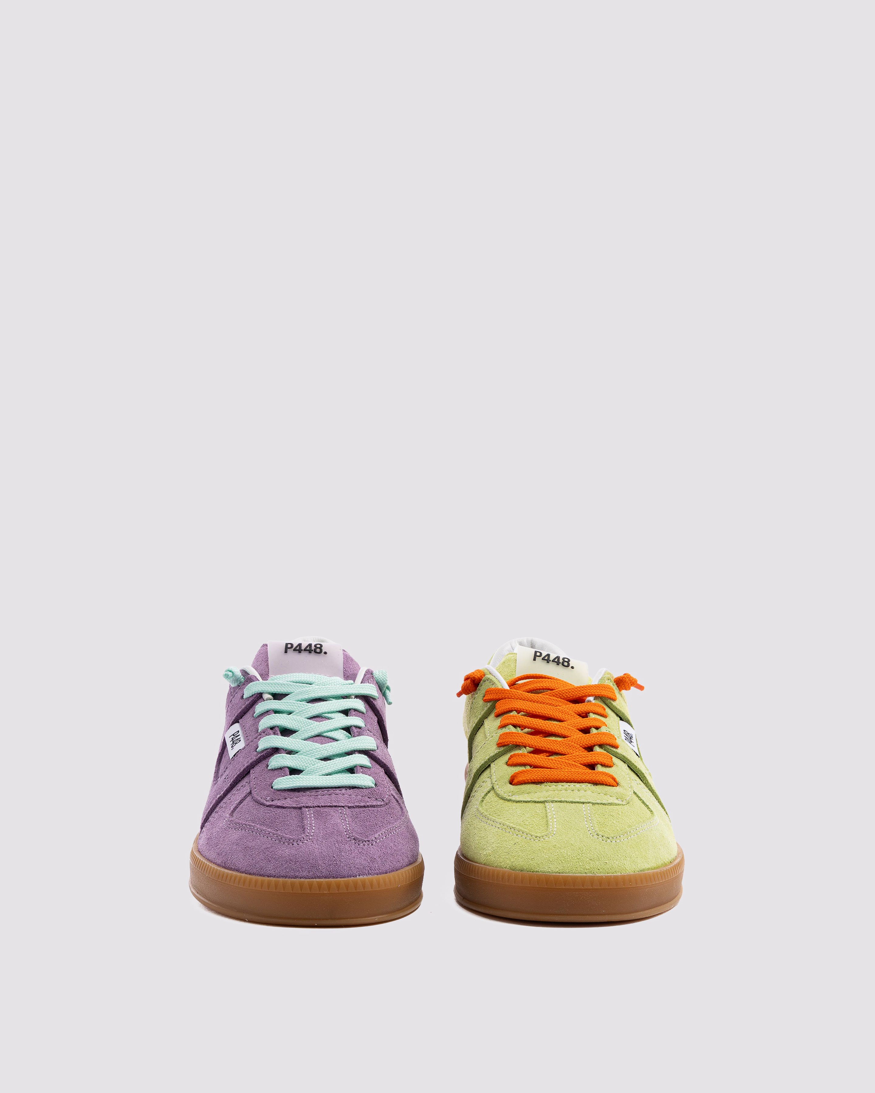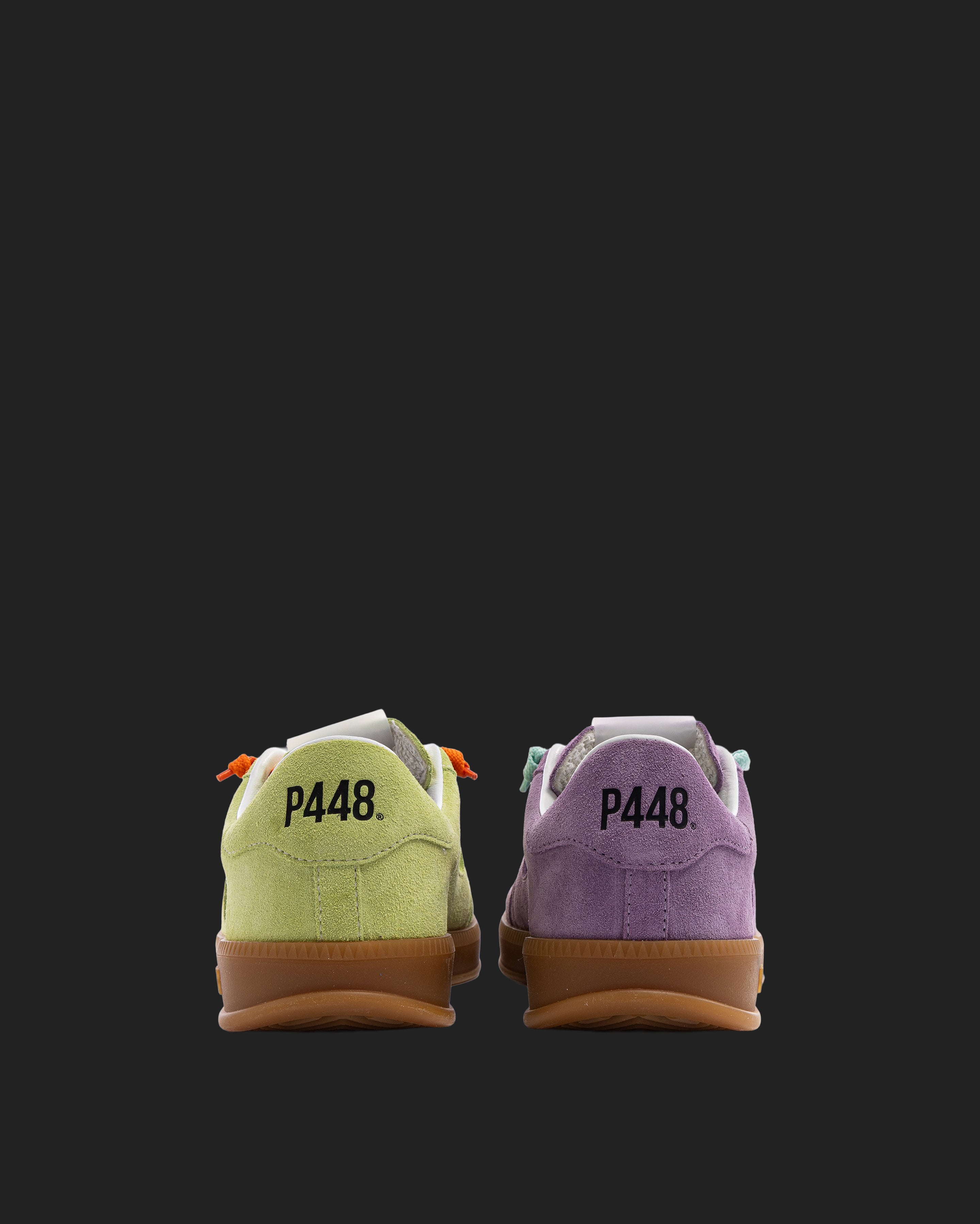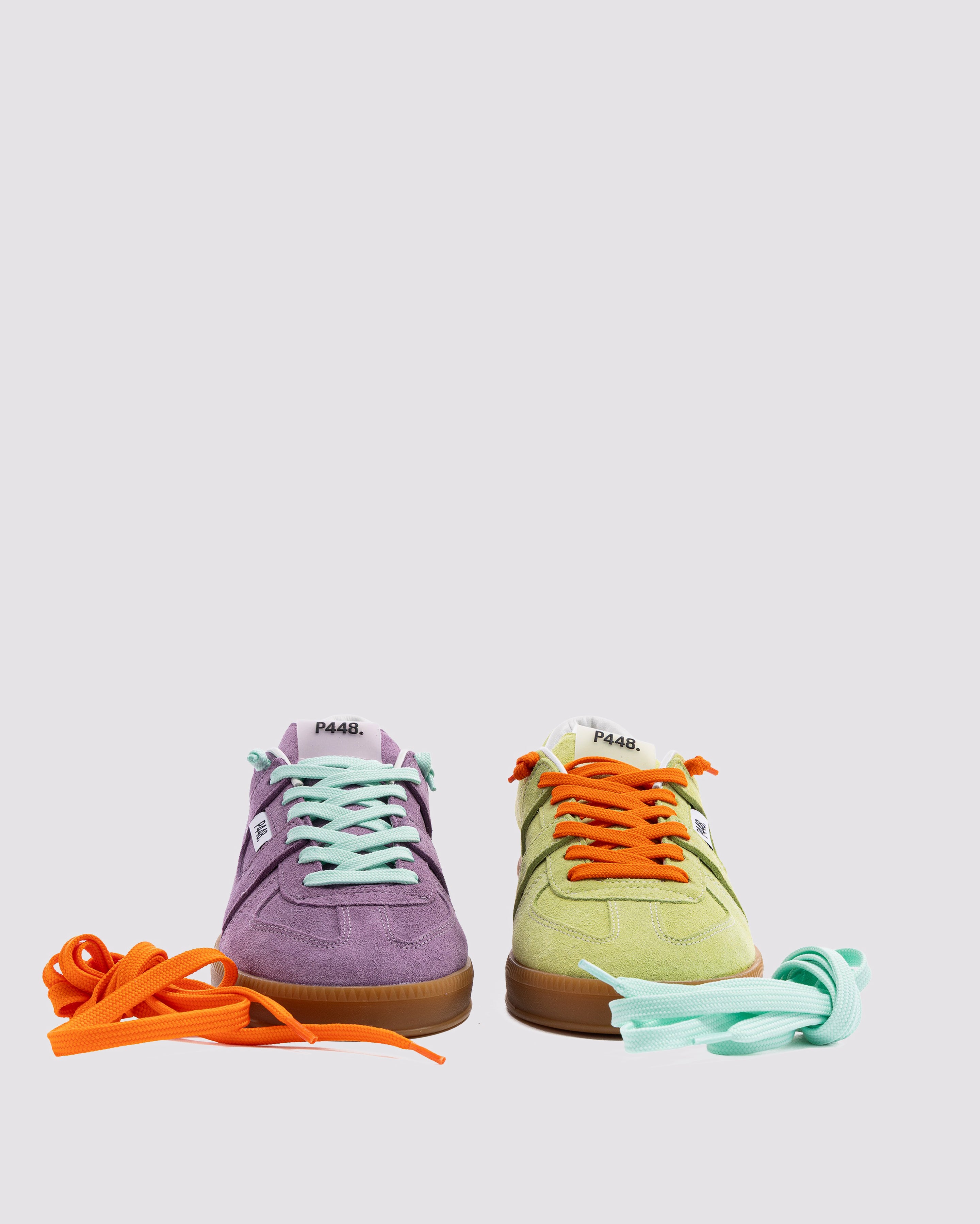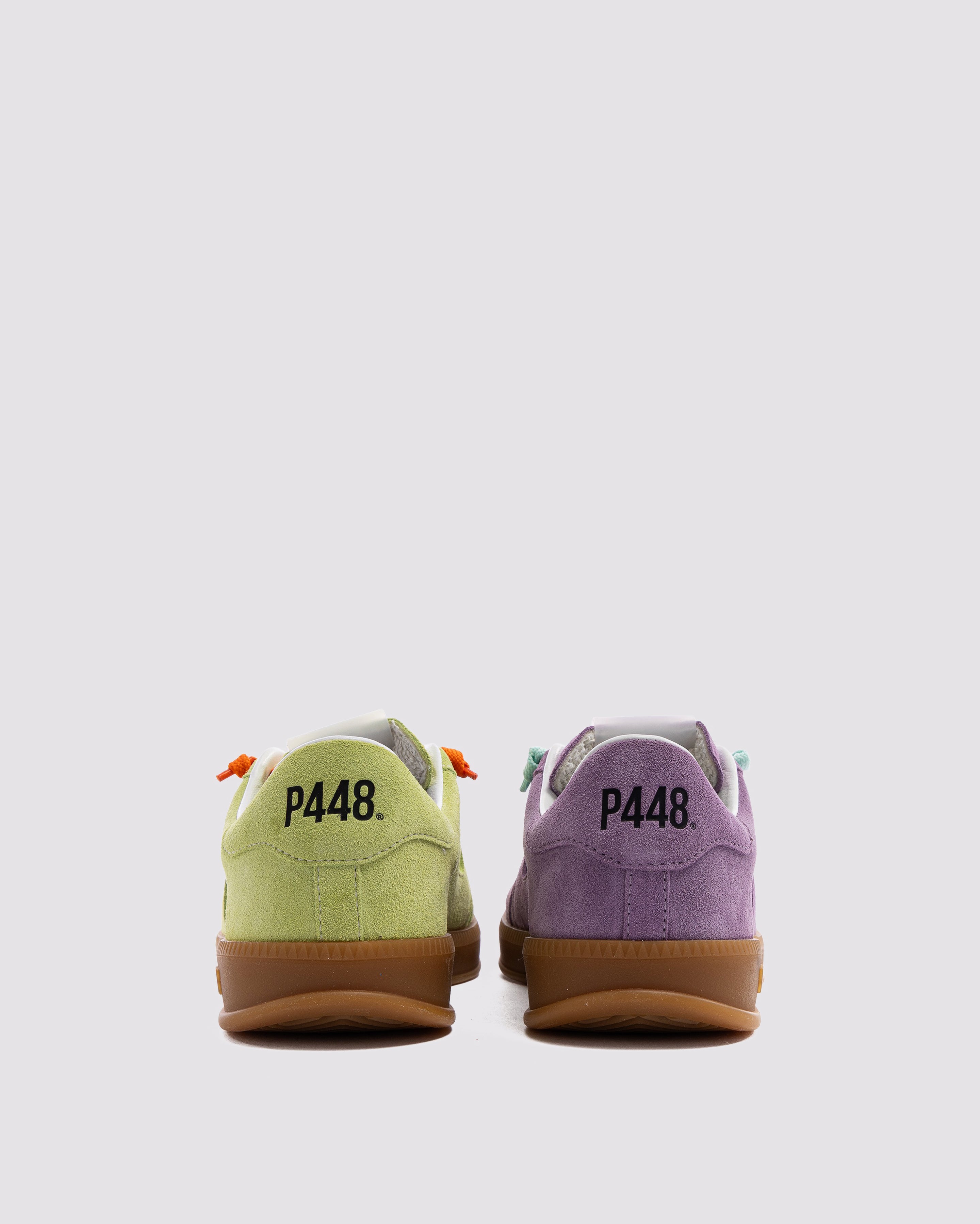 Both feature matching suede tongues, trims, toes, and heel accents. Light blue laces on one and orange laces on the other, along with our signature P448 rubber soles finished with black treads, tie it all together.
