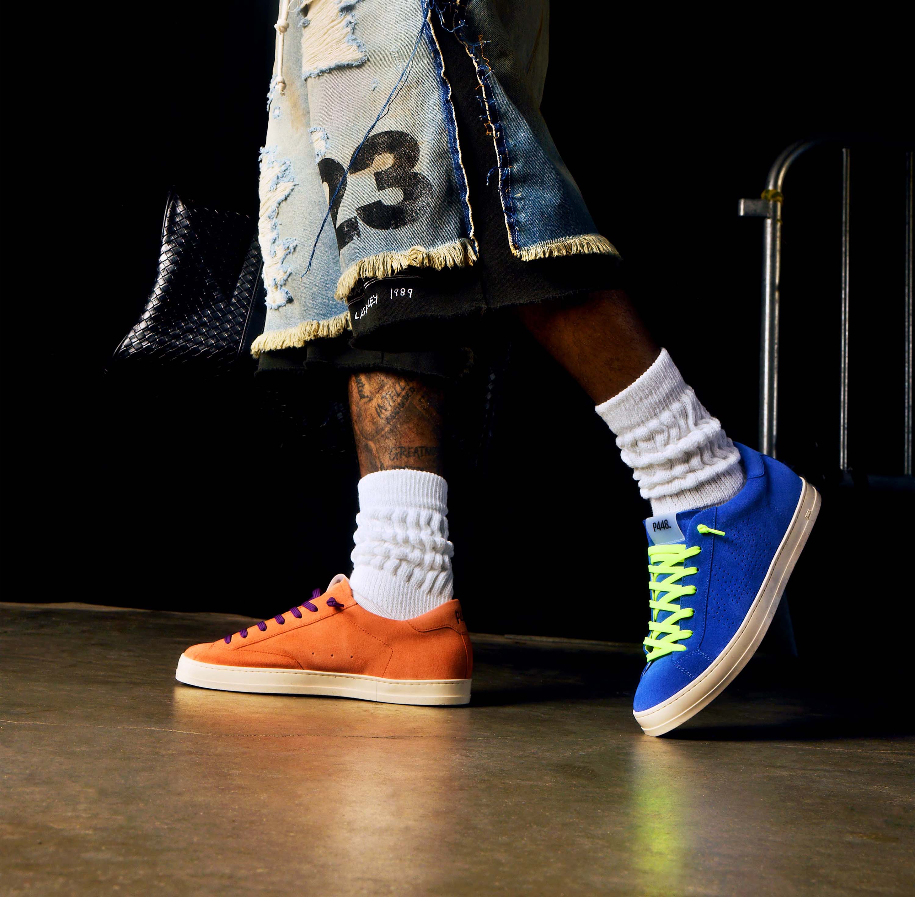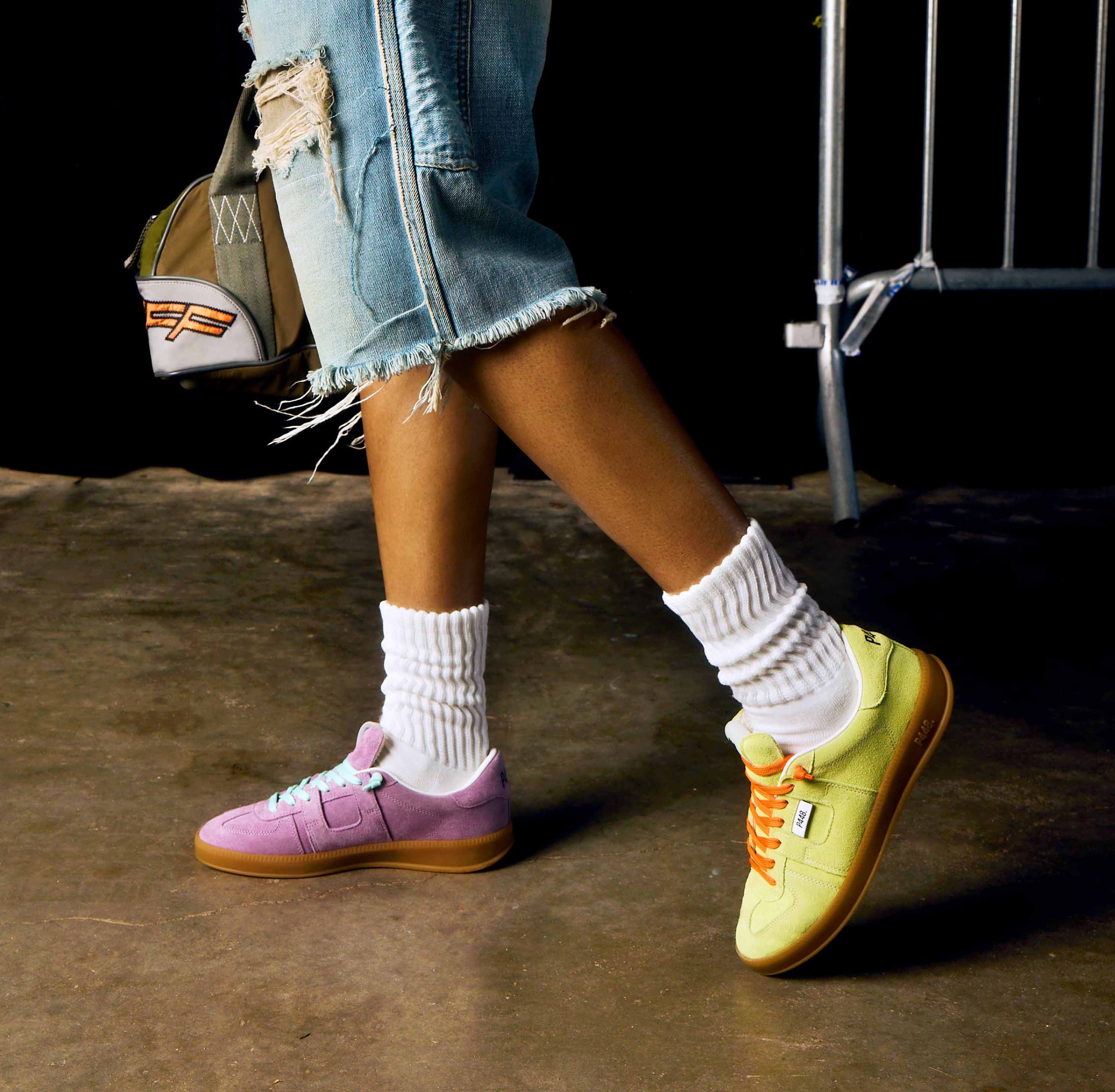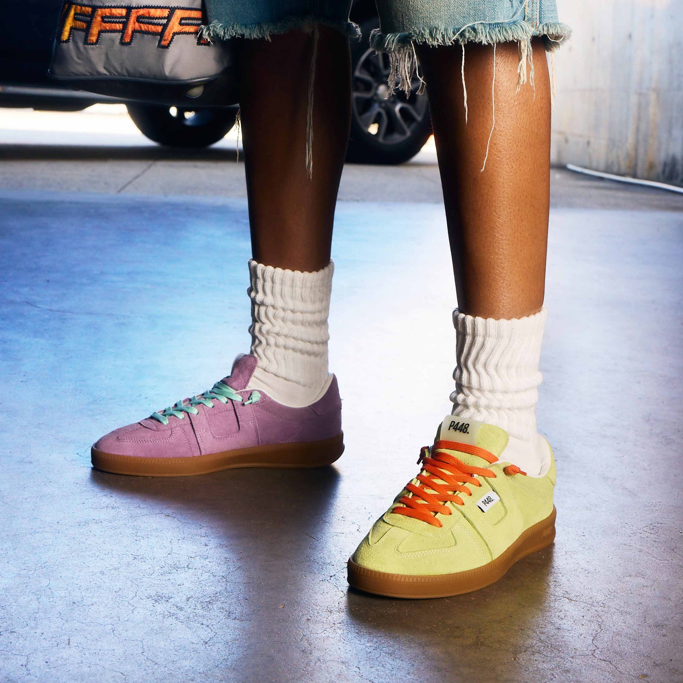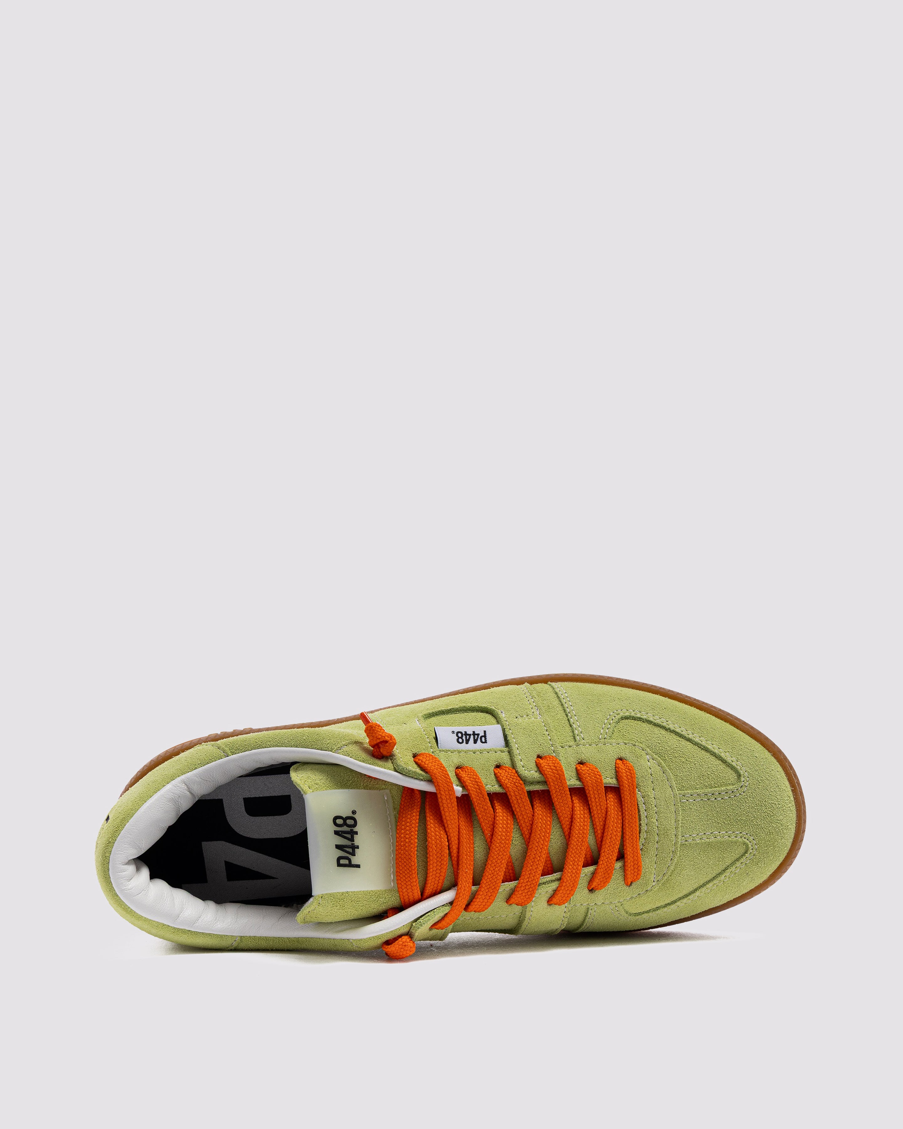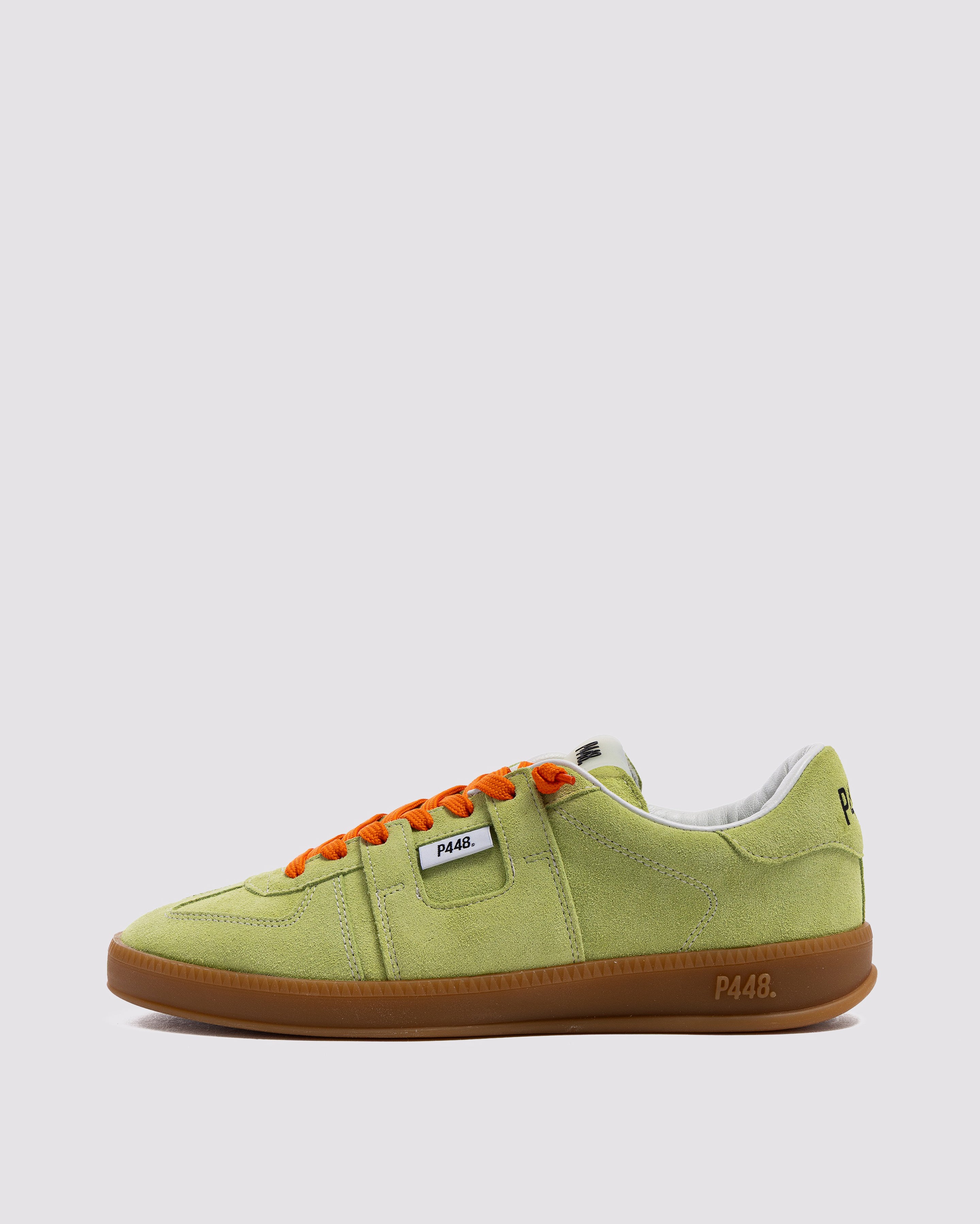 Both feature matching suede tongues, trims, toes, and heel accents. Light blue laces on one and orange laces on the other, along with our signature P448 rubber soles finished with black treads, tie it all together.