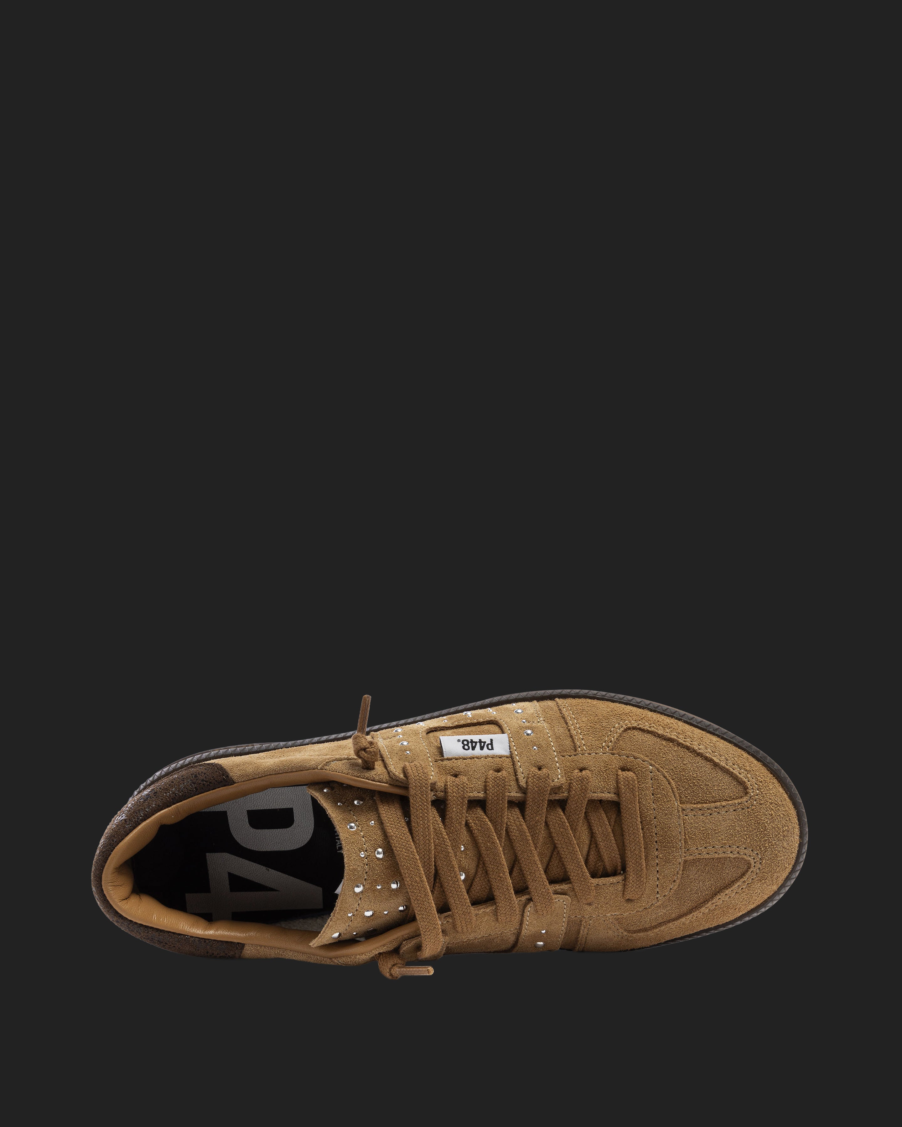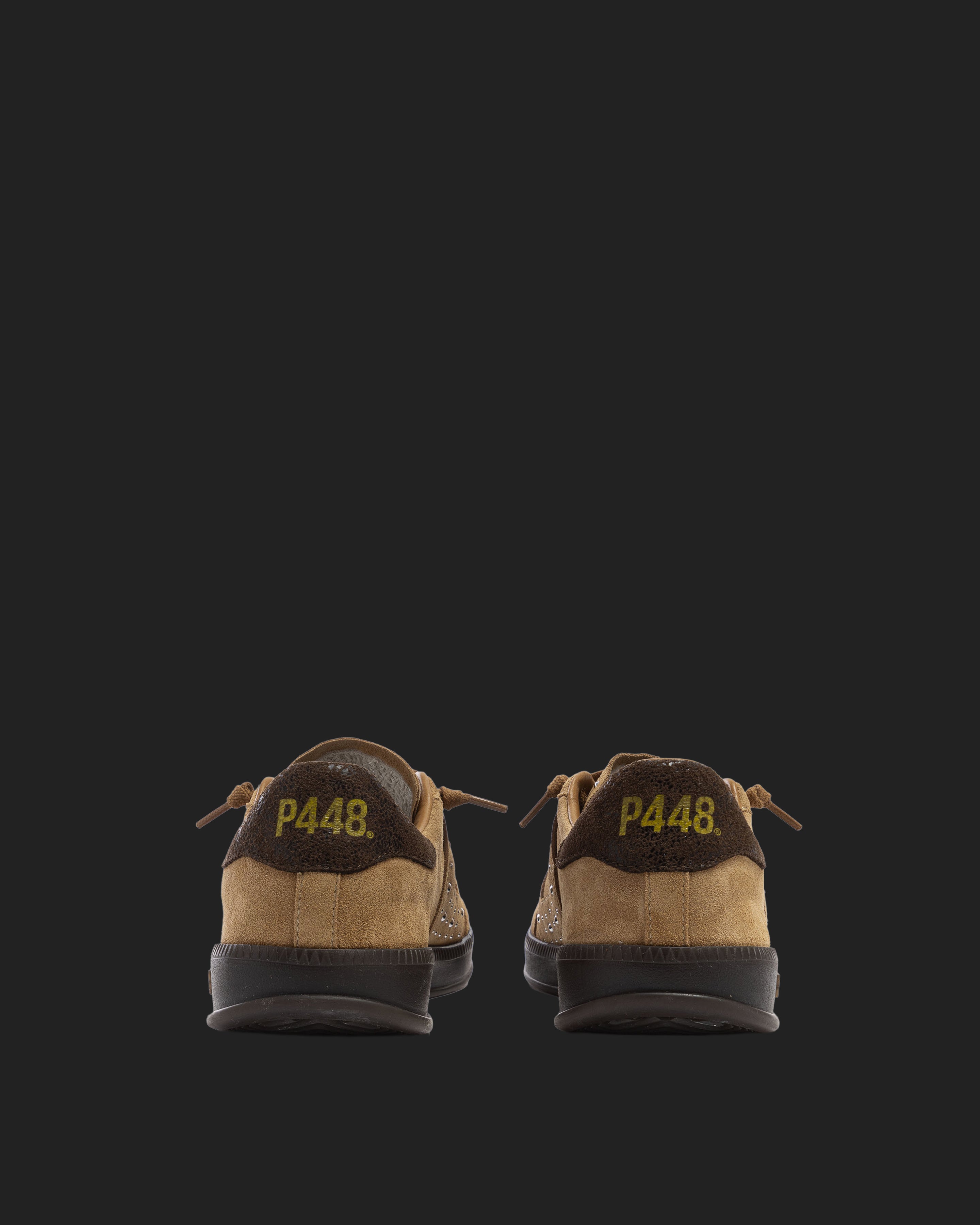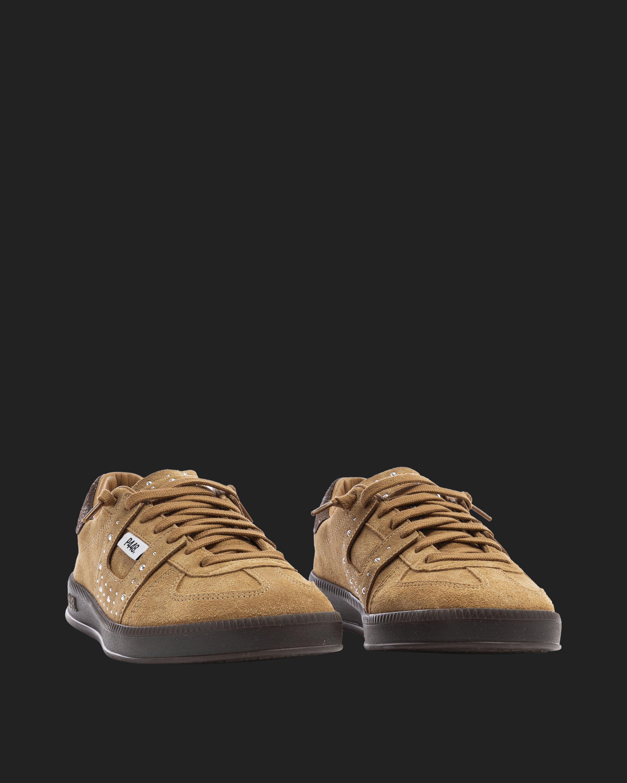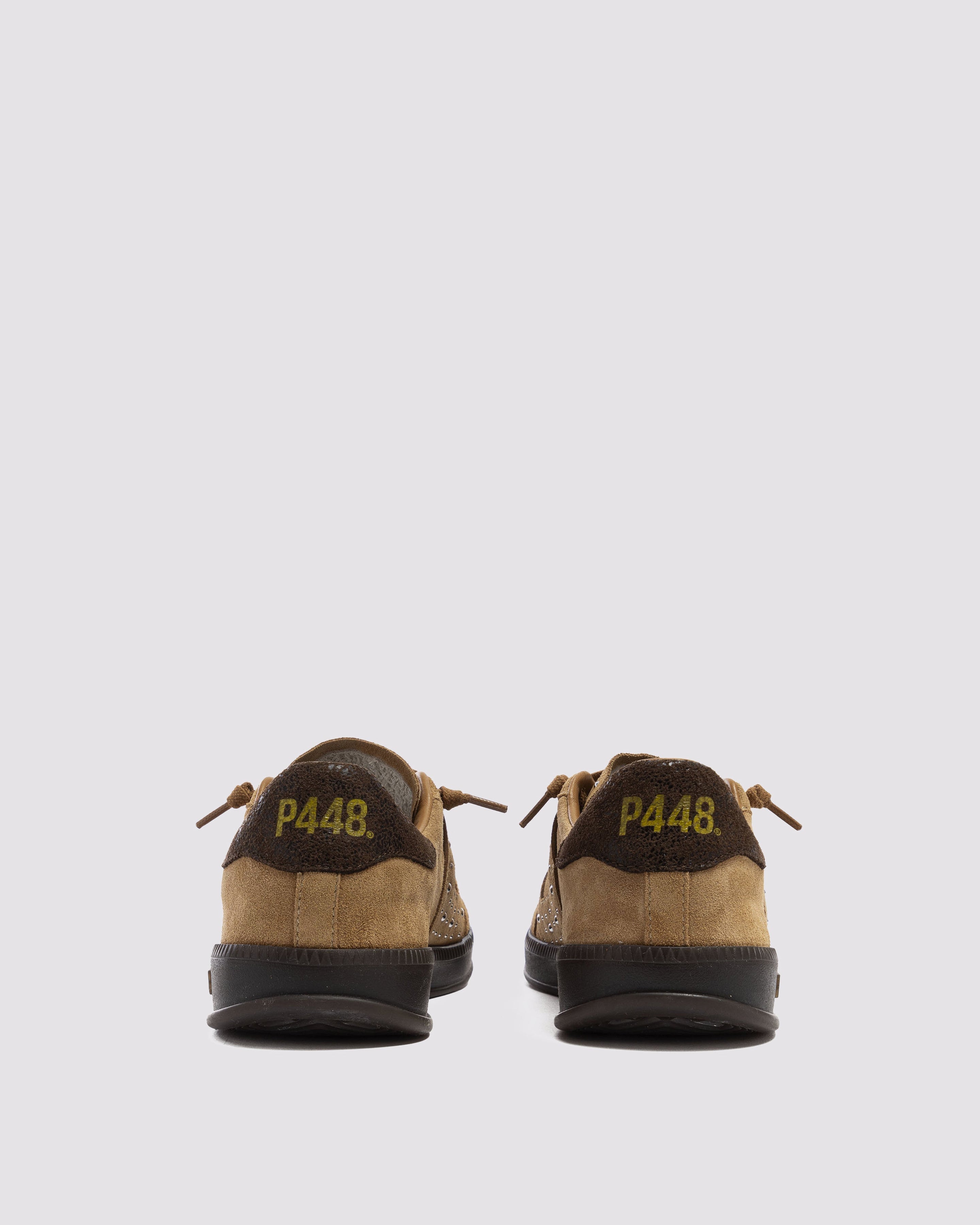 The Monza Brown/Stud features all-over brown suede complemented by a brown suede heel tab. Embellished silver studs, Brown cotton laces and our P448 dark brown rubber soles tie it all together.