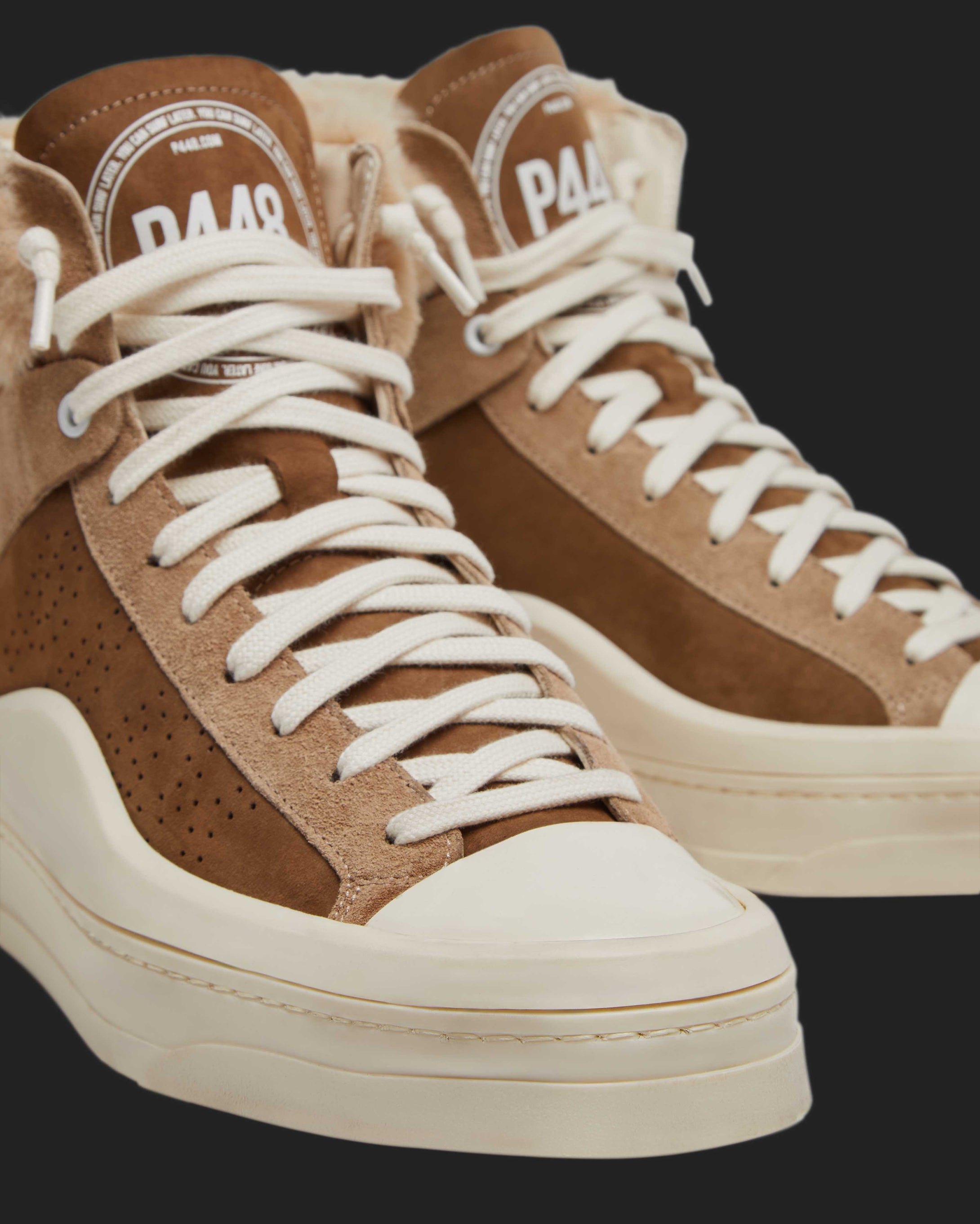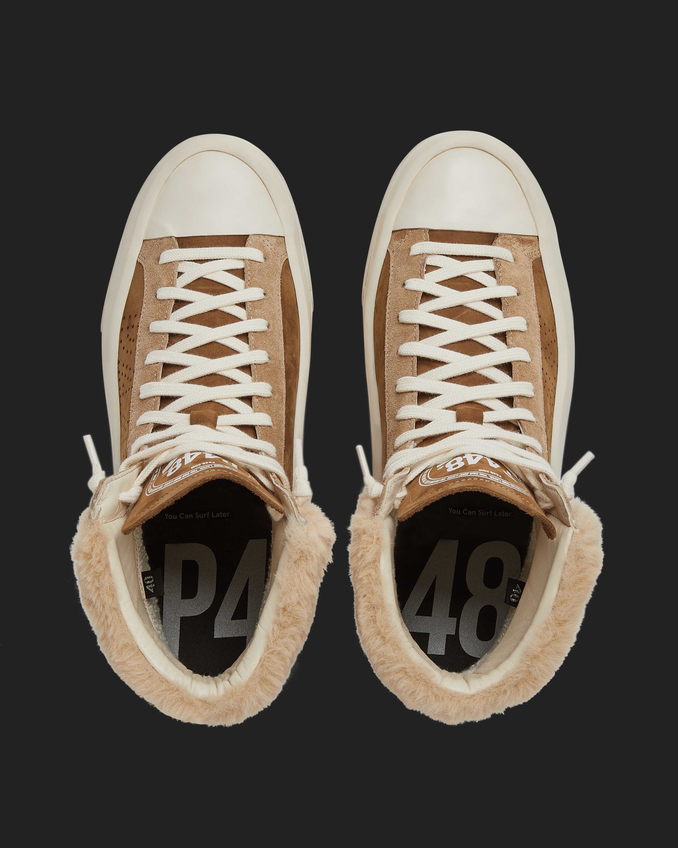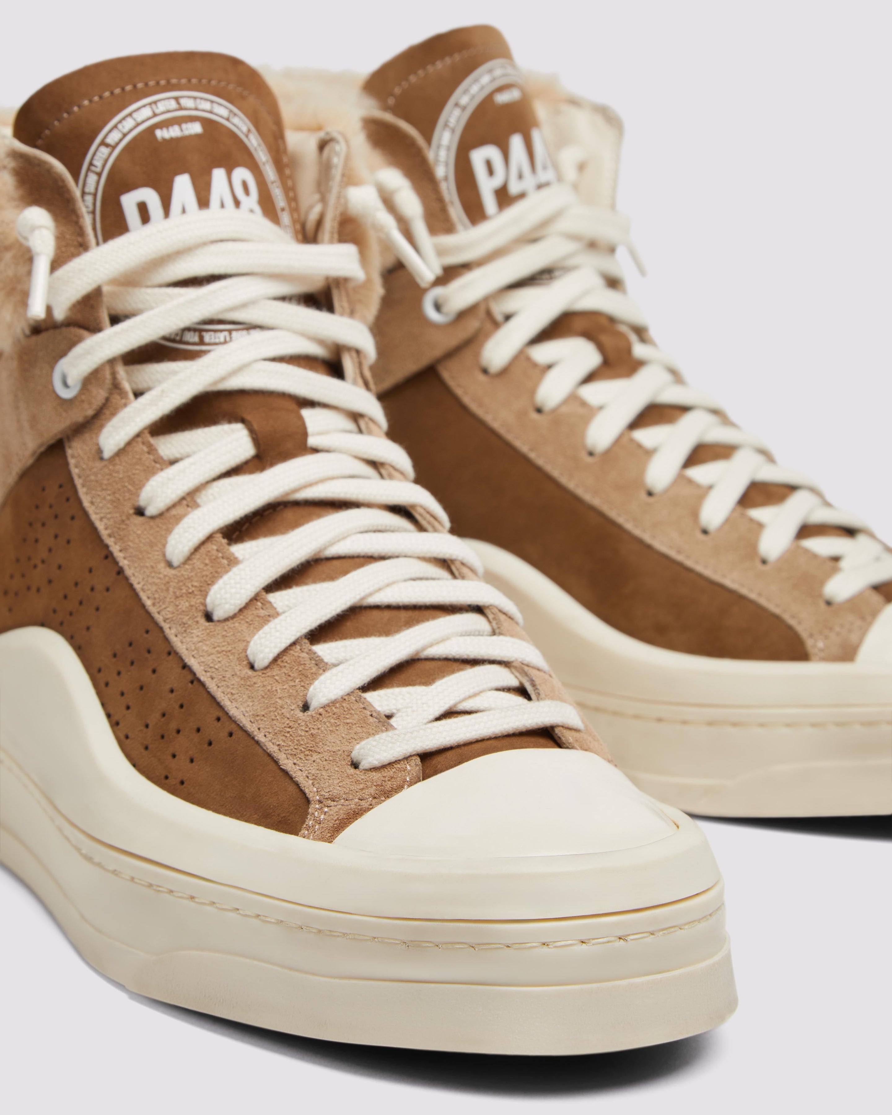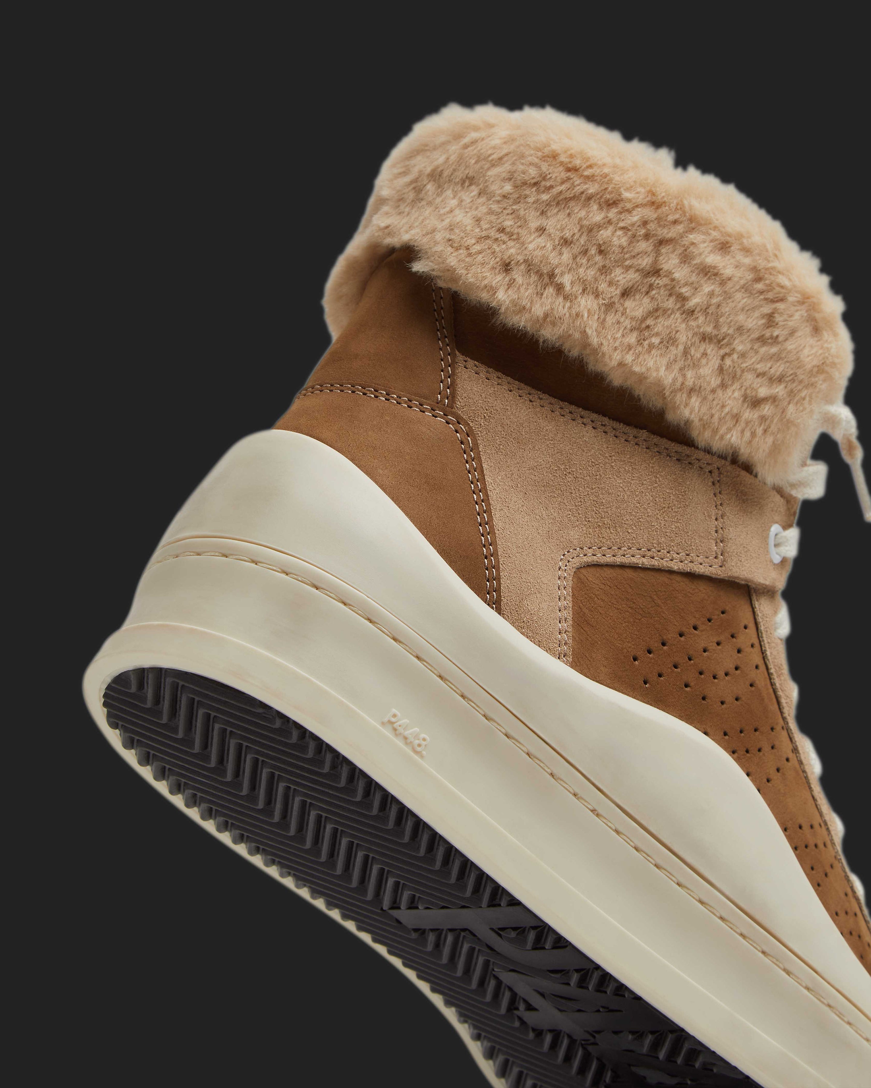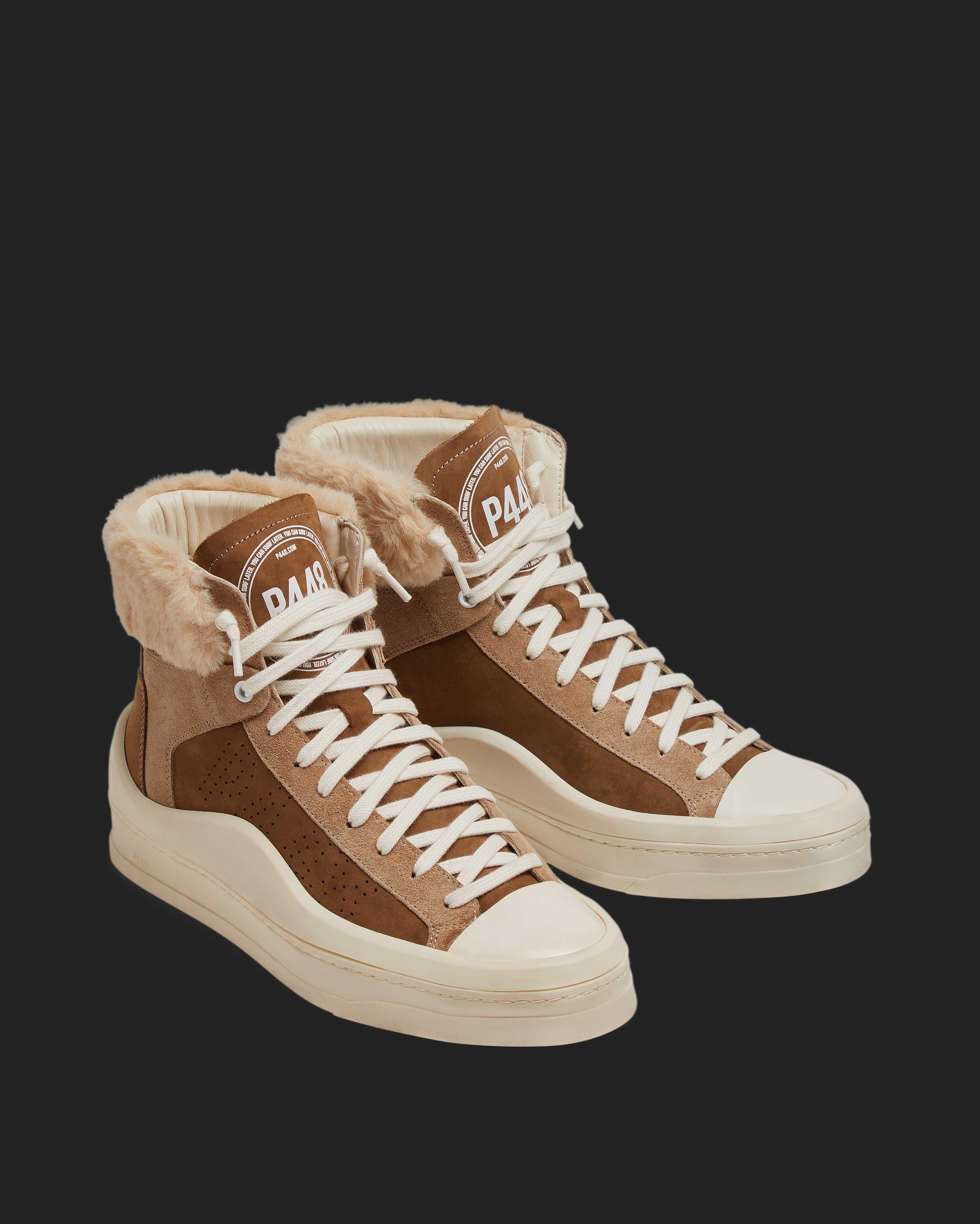 The Rail Coco is the faux fur trim high top your sneaker rotation needs, featuring an all-over brown nubuck leather and brown suede design with beige recycled faux fur trims. White laces and our bold hand-distressed soles with black treads finish off the look.