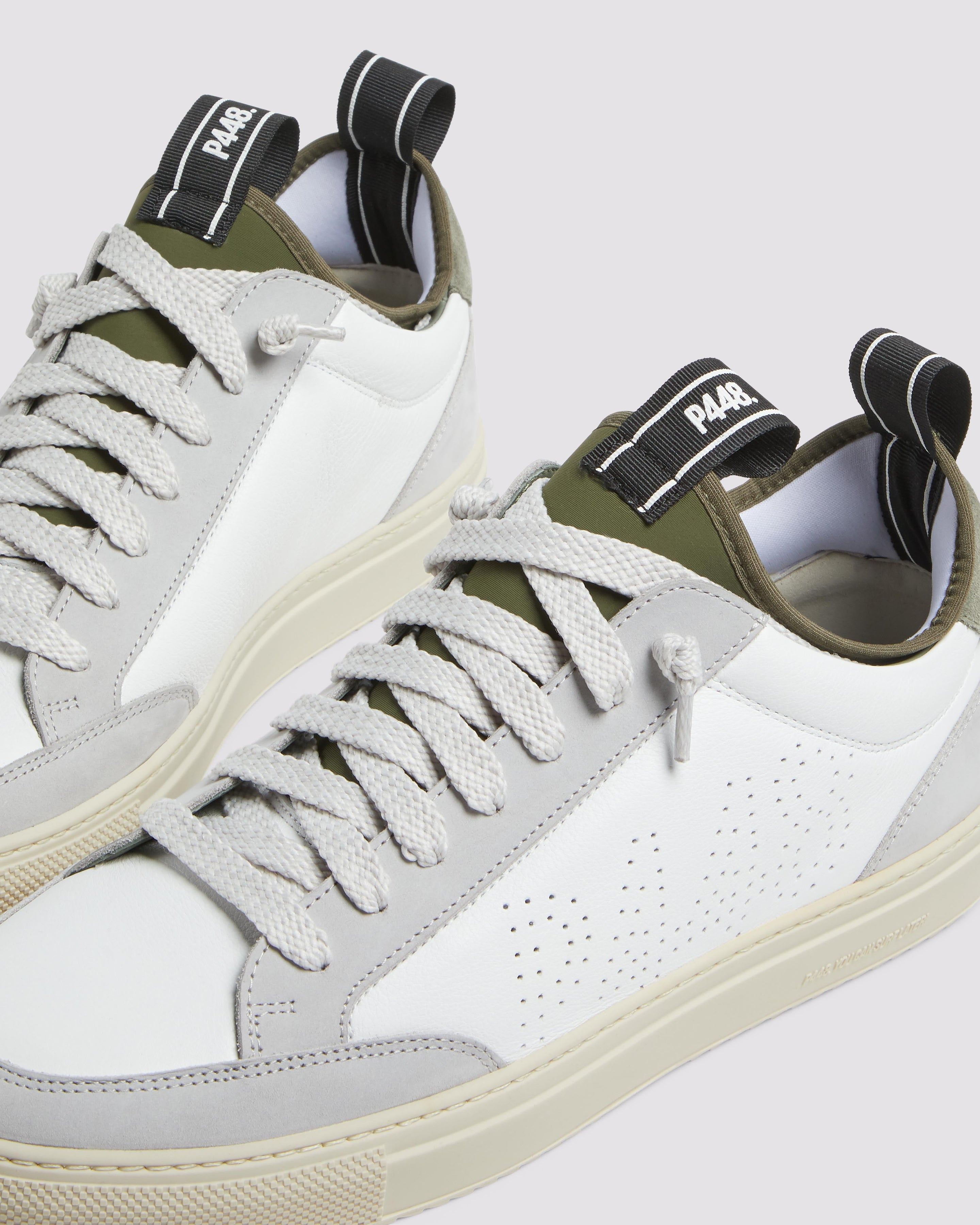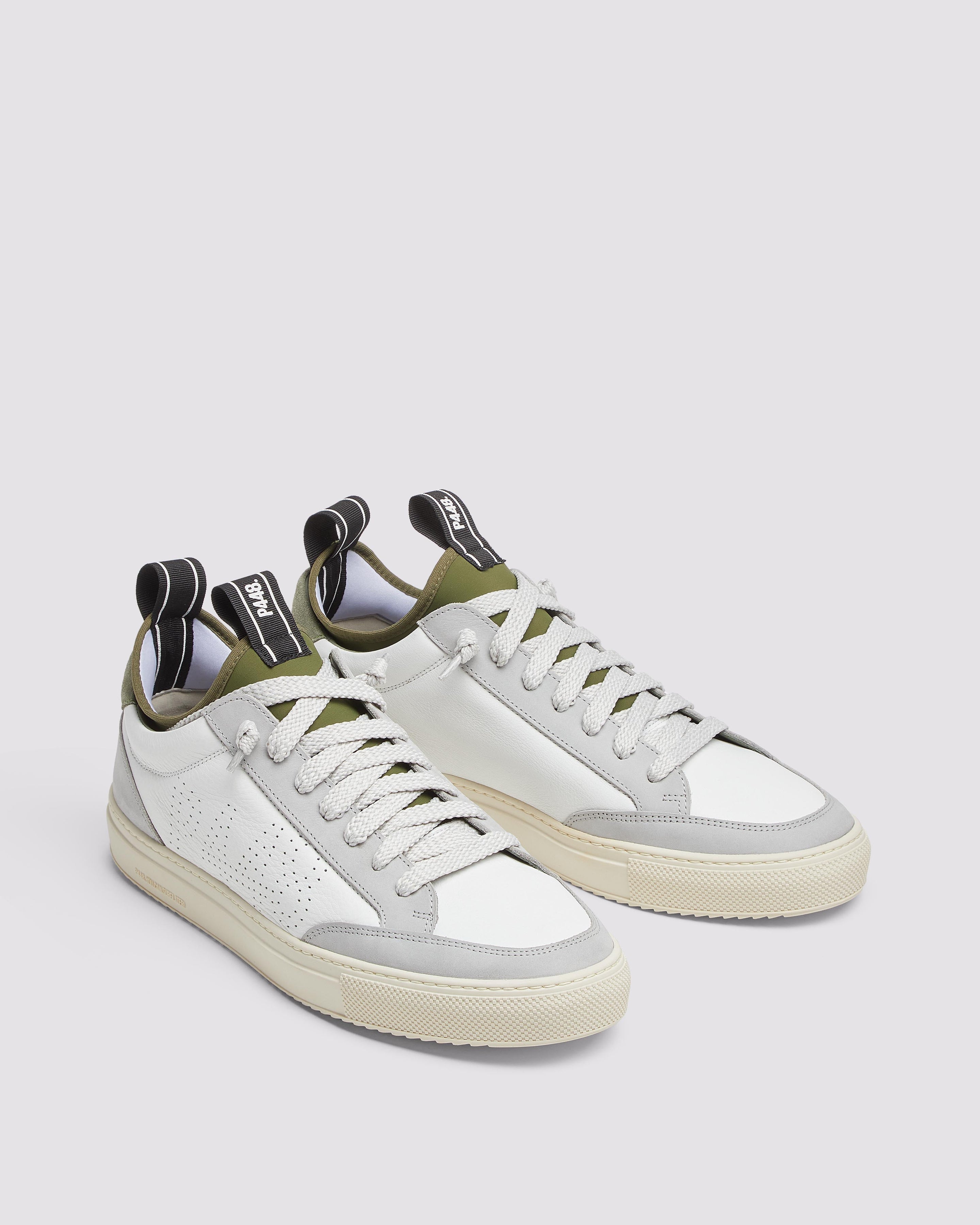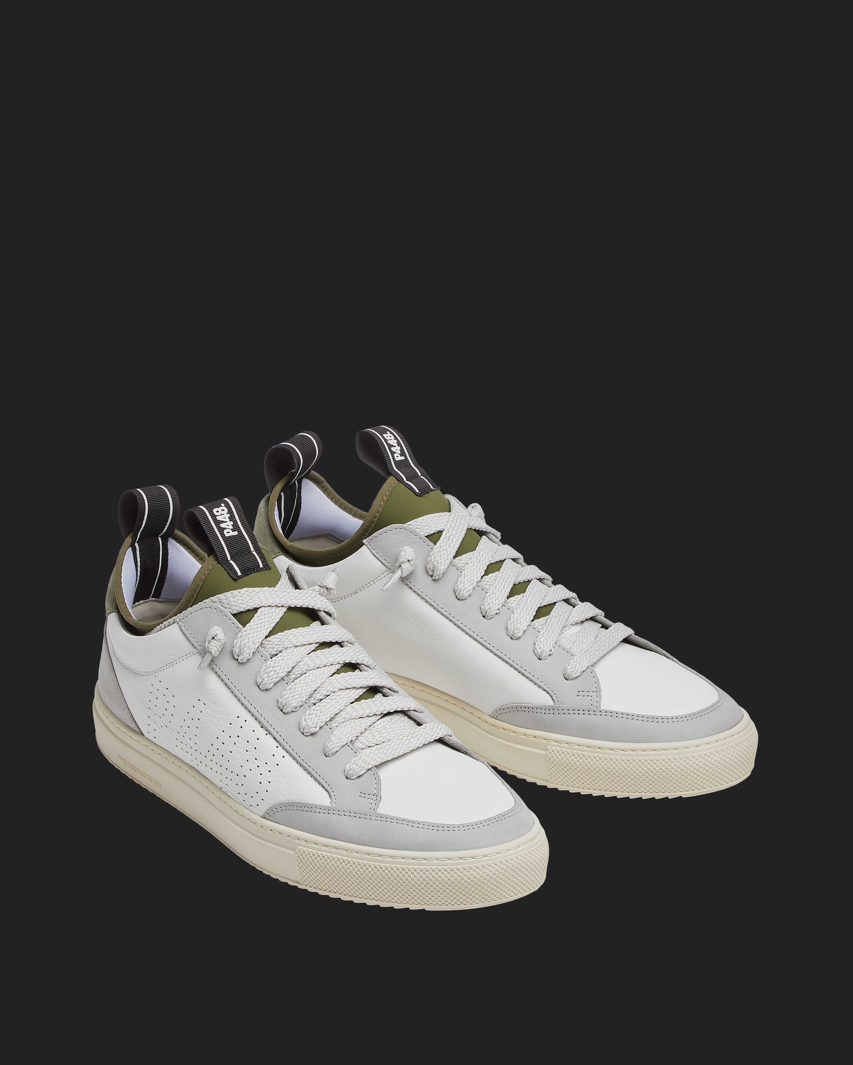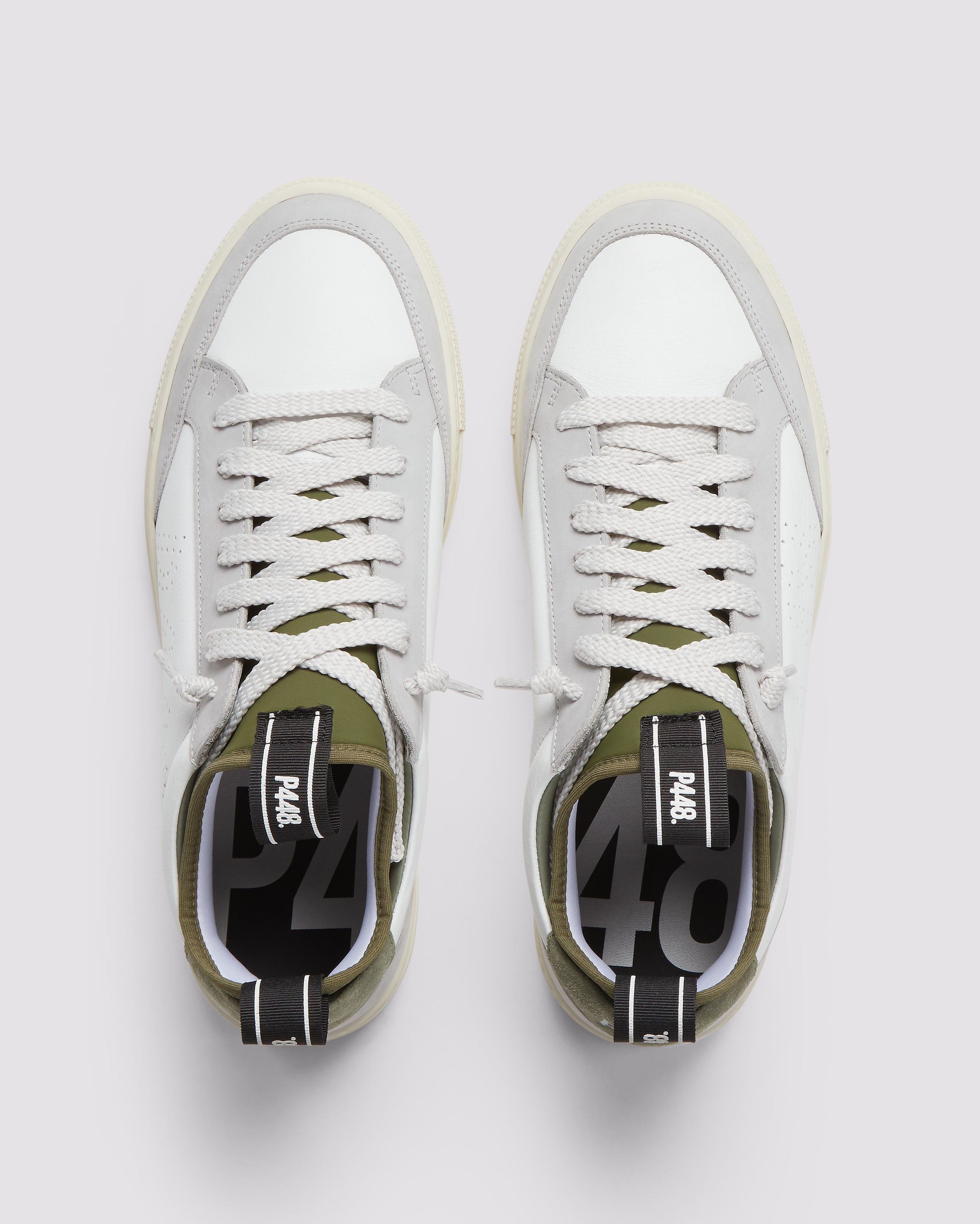 The easygoing Sohosocks Shadow is wrapped in white leather, grounded by a light grey nubuck leather heel accent and trim, finished with an army green heel tab and sock lining. White and silver laces and our signature P448 rubber soles with white treads tie it all together.