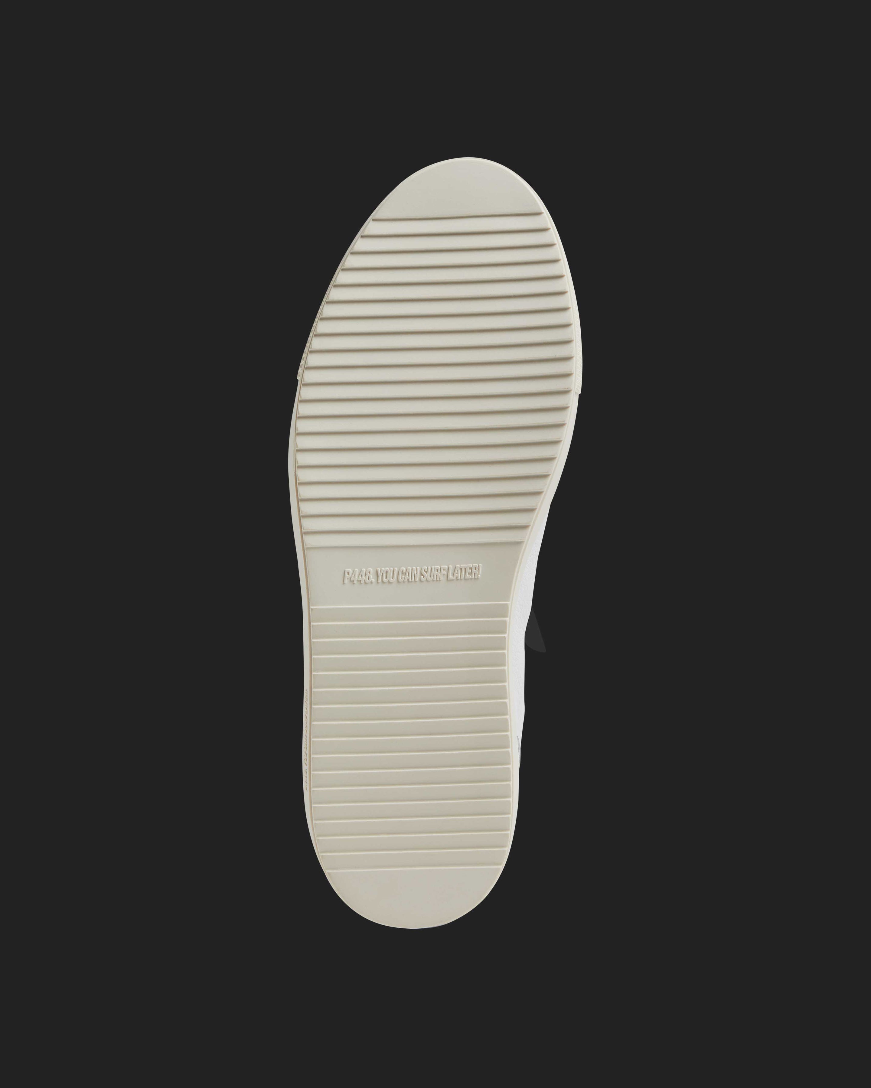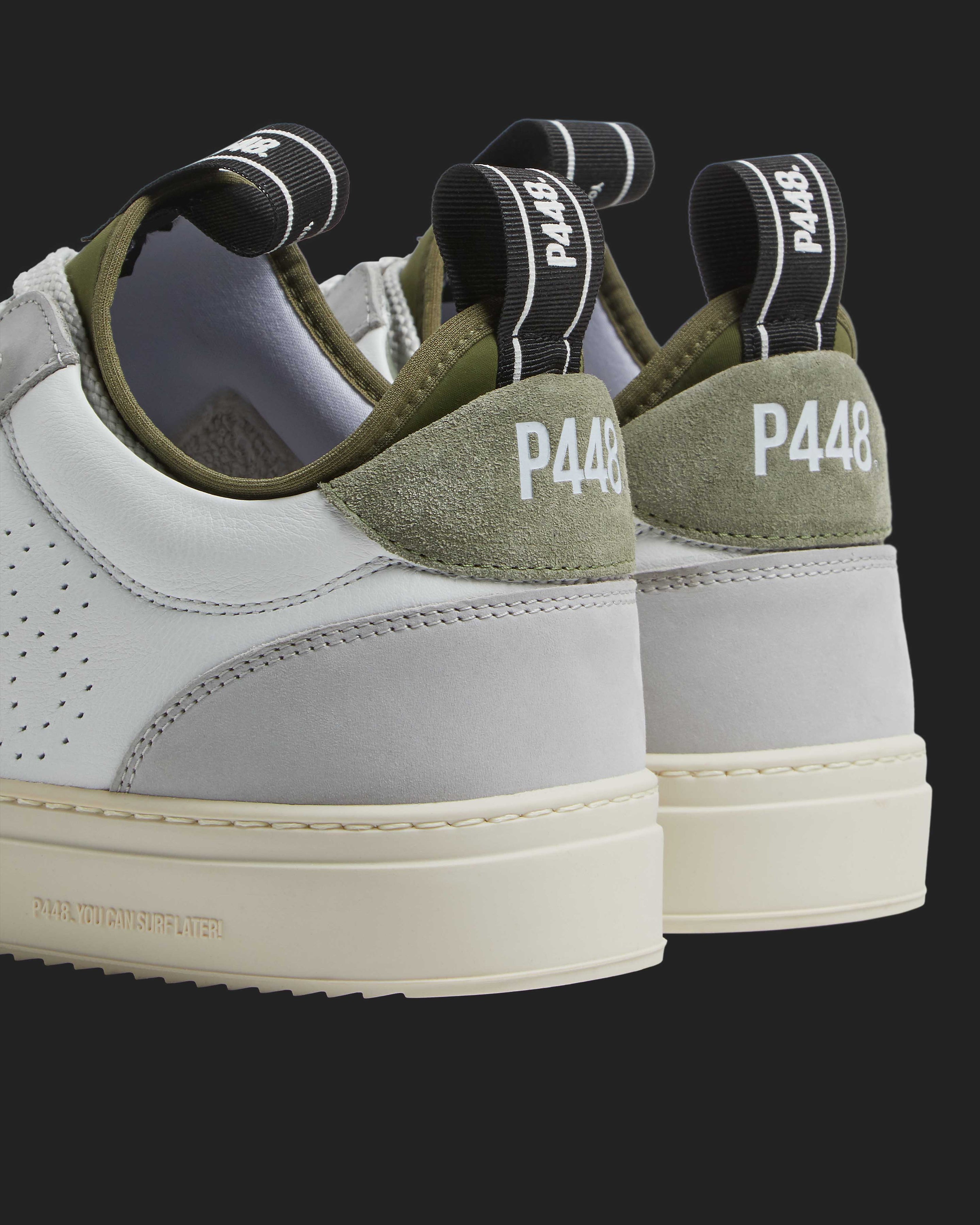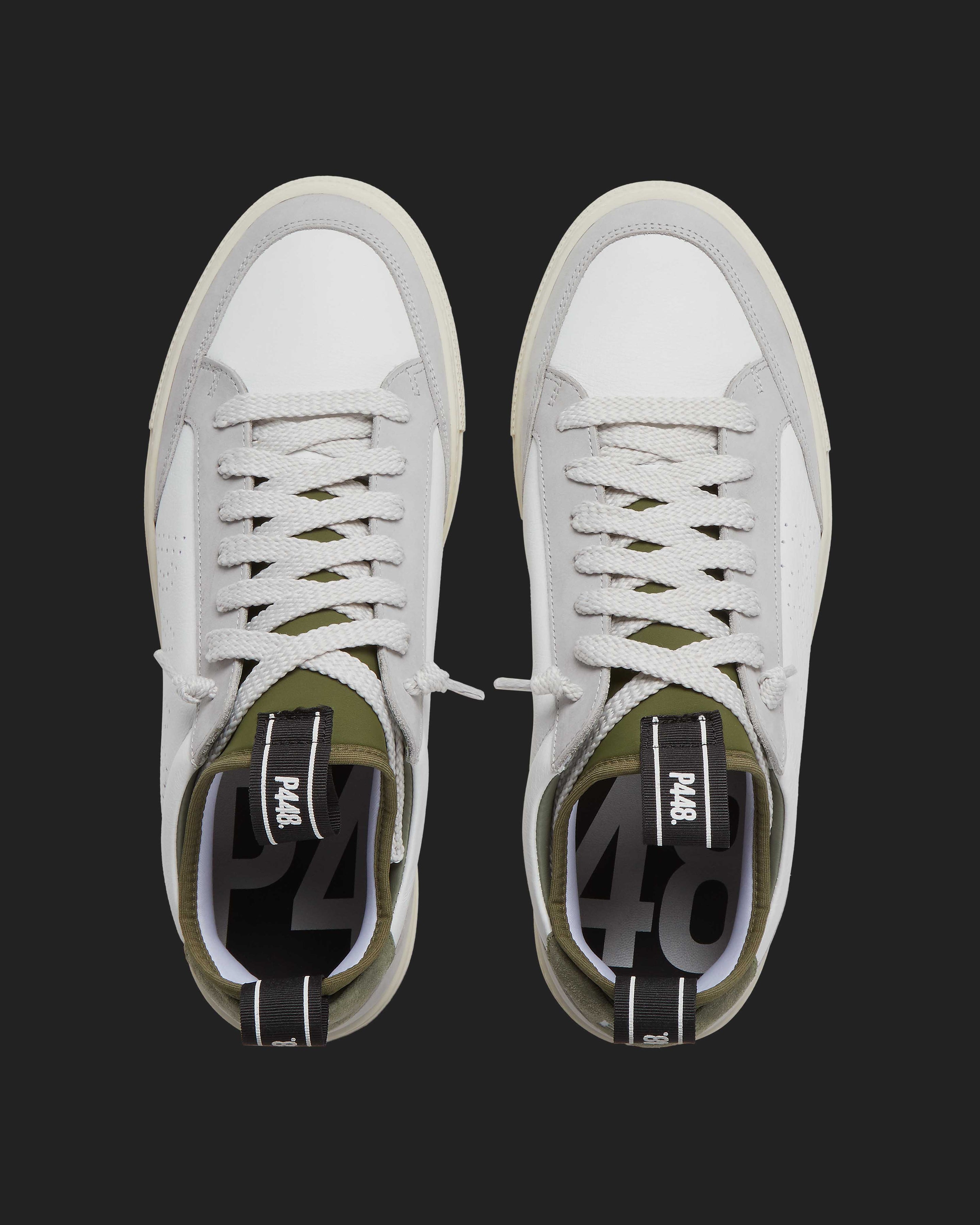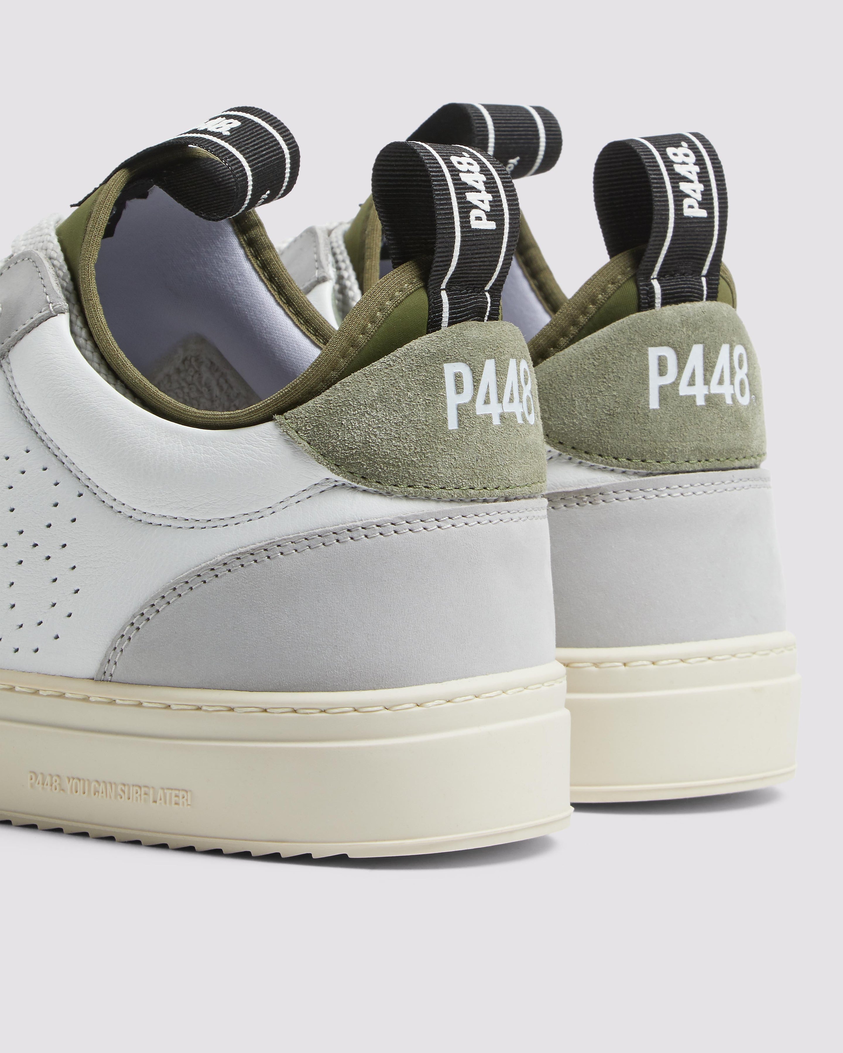 The easygoing Sohosocks Shadow is wrapped in white leather, grounded by a light grey nubuck leather heel accent and trim, finished with an army green heel tab and sock lining. White and silver laces and our signature P448 rubber soles with white treads tie it all together.