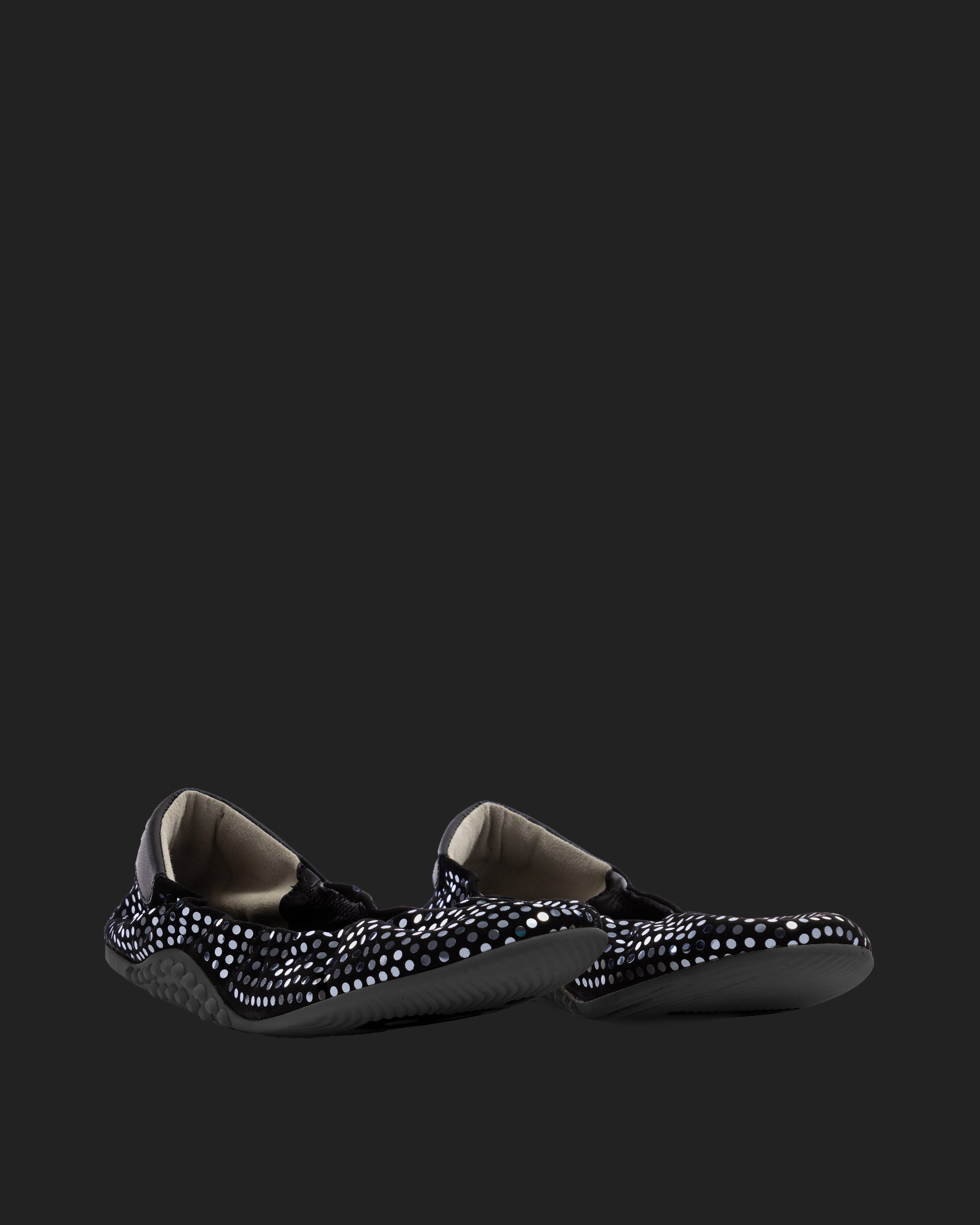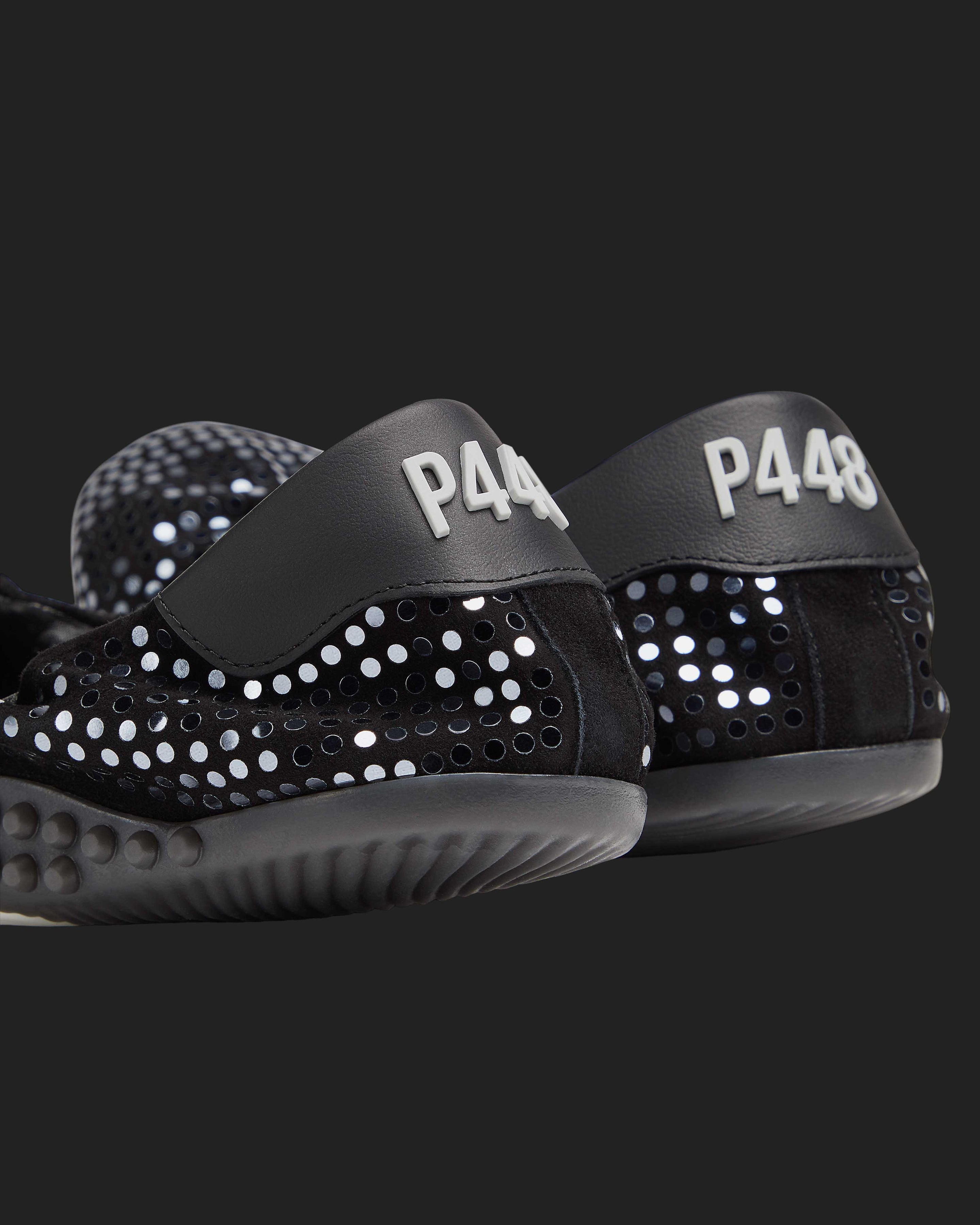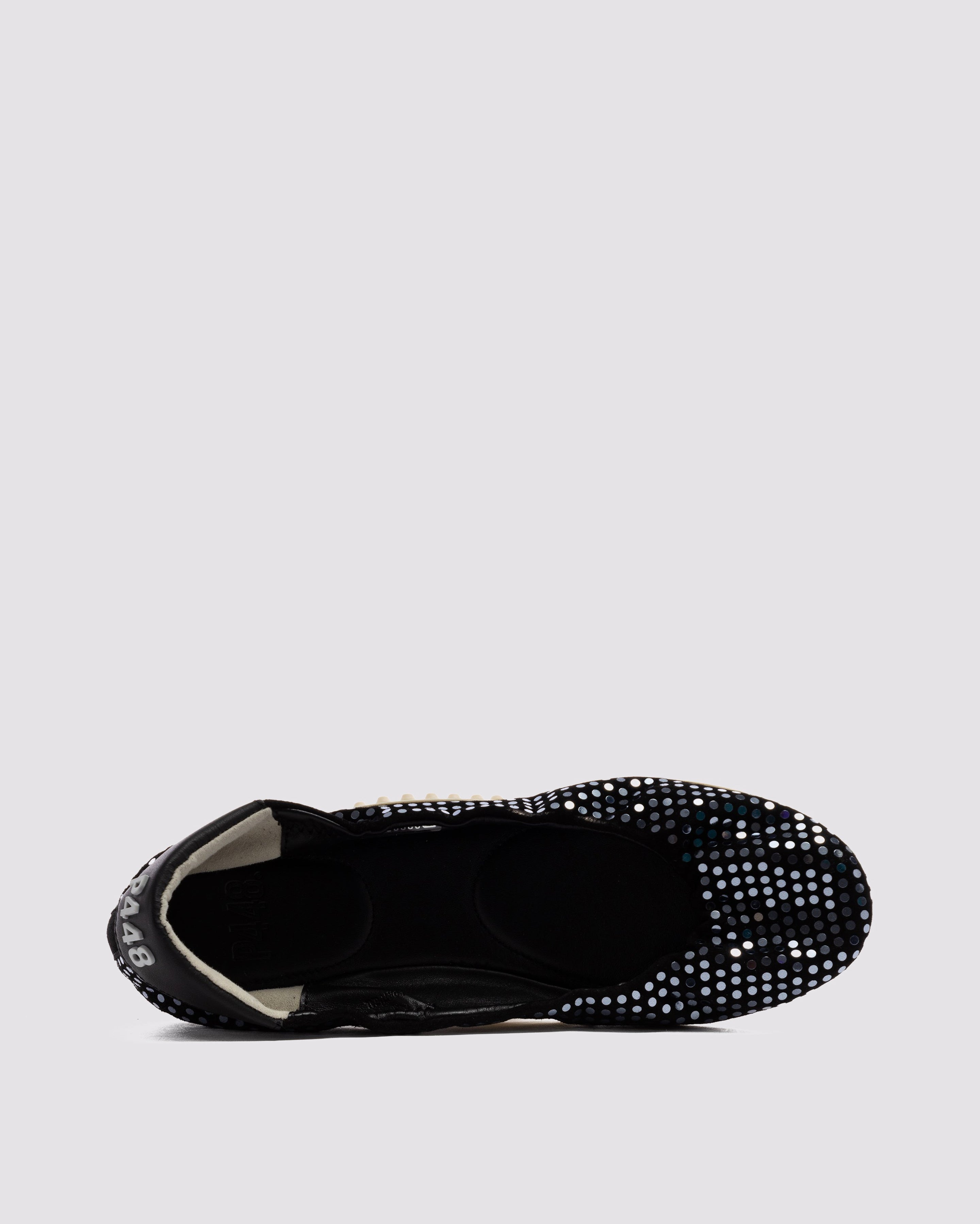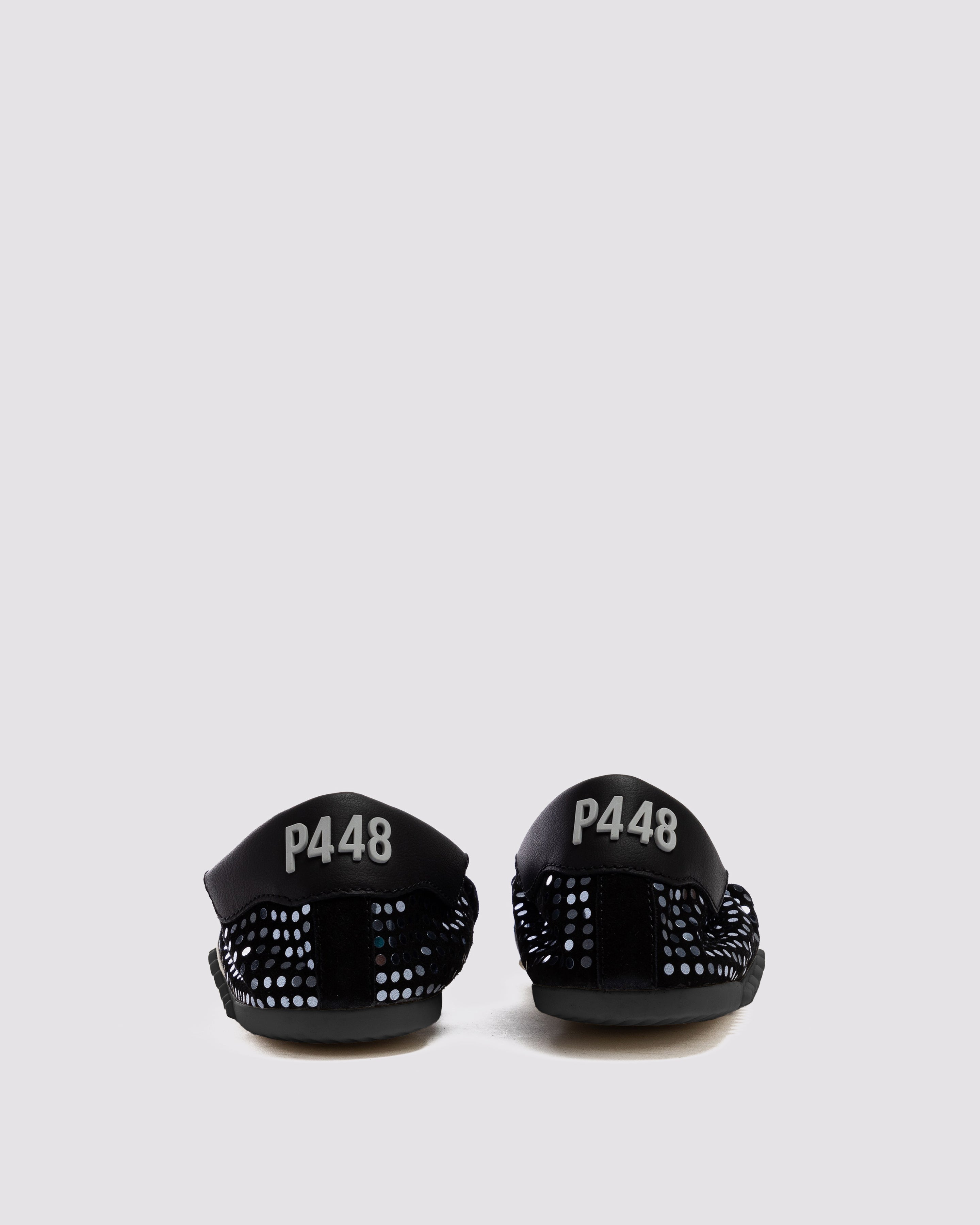 The Stella Black/Silver is the studded flat that always makes a statement. It features an all-over black suede design embellished with silver paillettes and a black leather heel tab. Our P448 raised black rubber soles finish off the look.