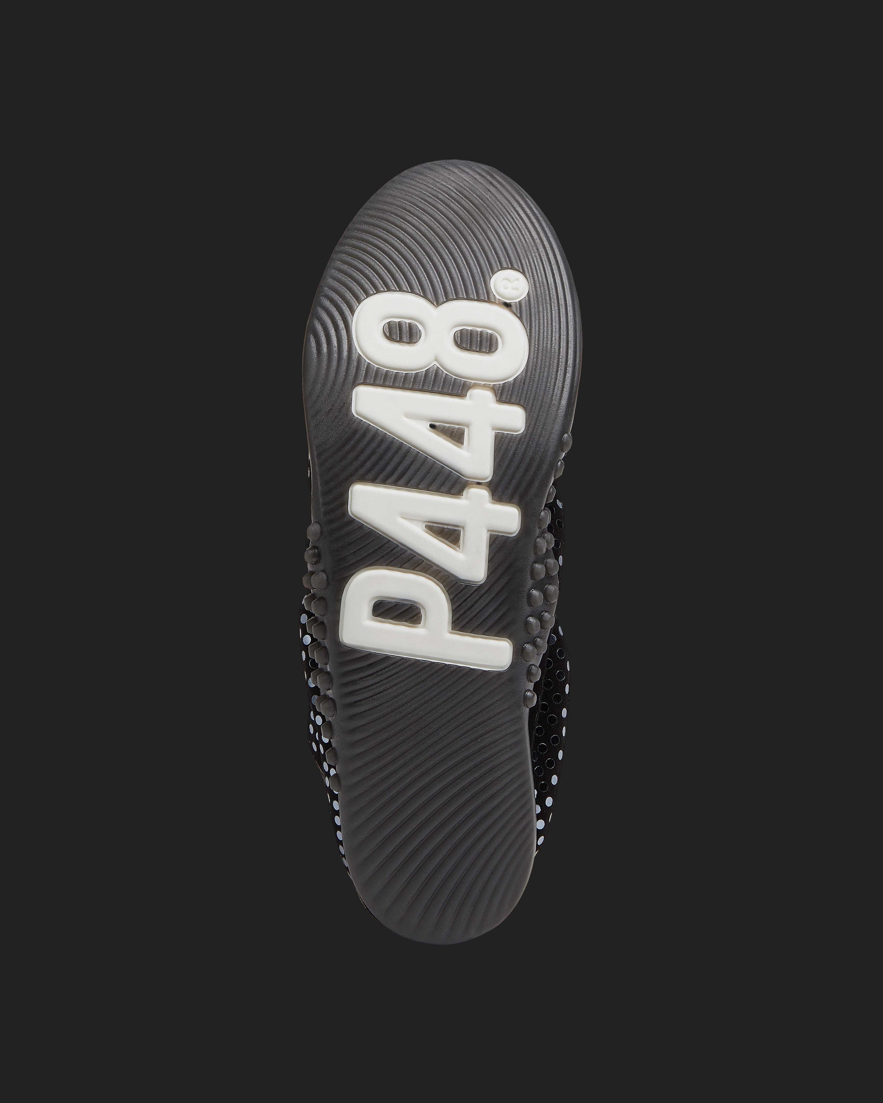 Our P448 designs push the boundaries of footwear by choosing unique specialty materials, some of which require particular care. This includes haircalf, glitter, denim, sponge, and others. These materials are often delicate and difficult to clean. Try to avoid wet or muddy areas when wearing and bring to a cleaning expert when dirty or stained.