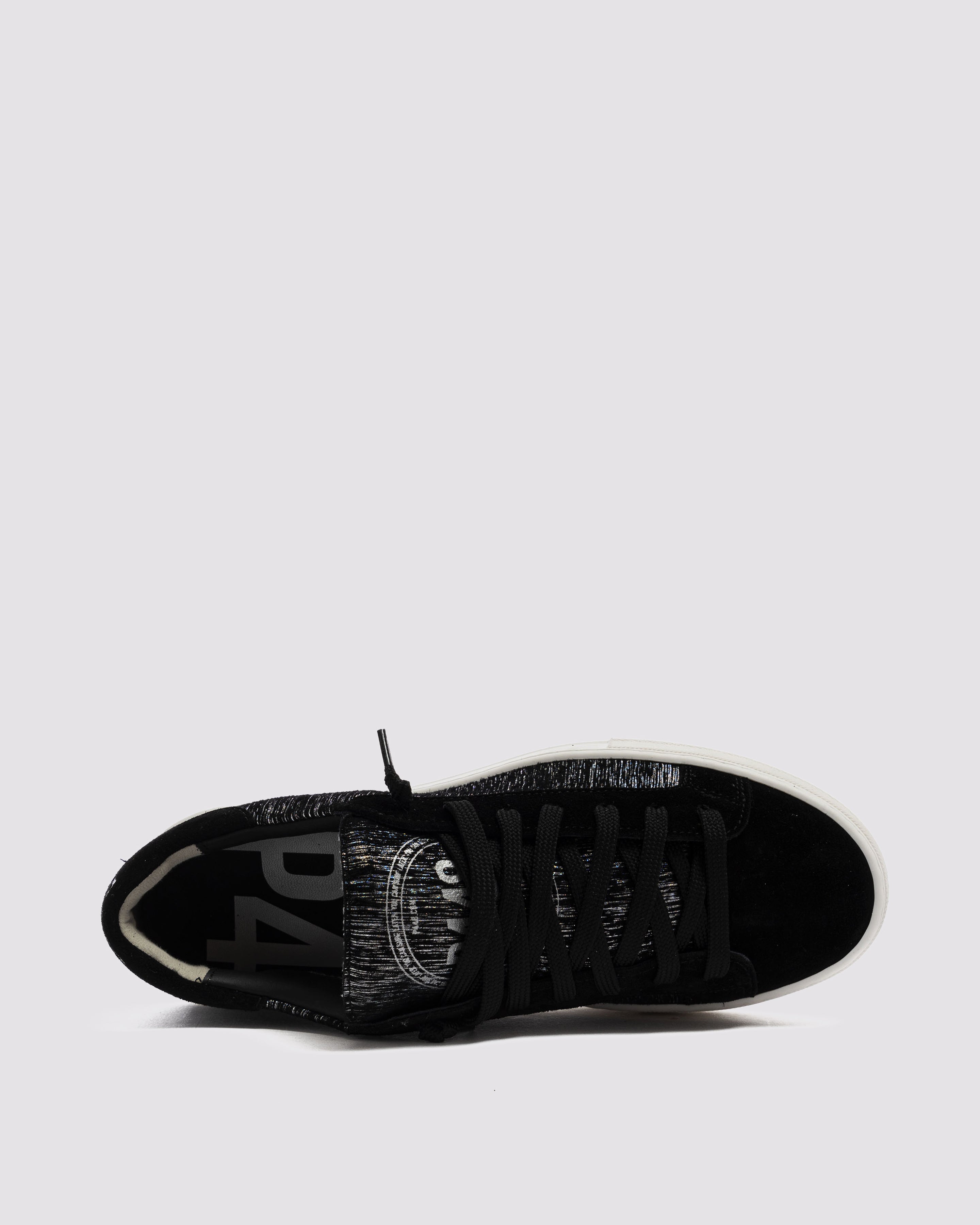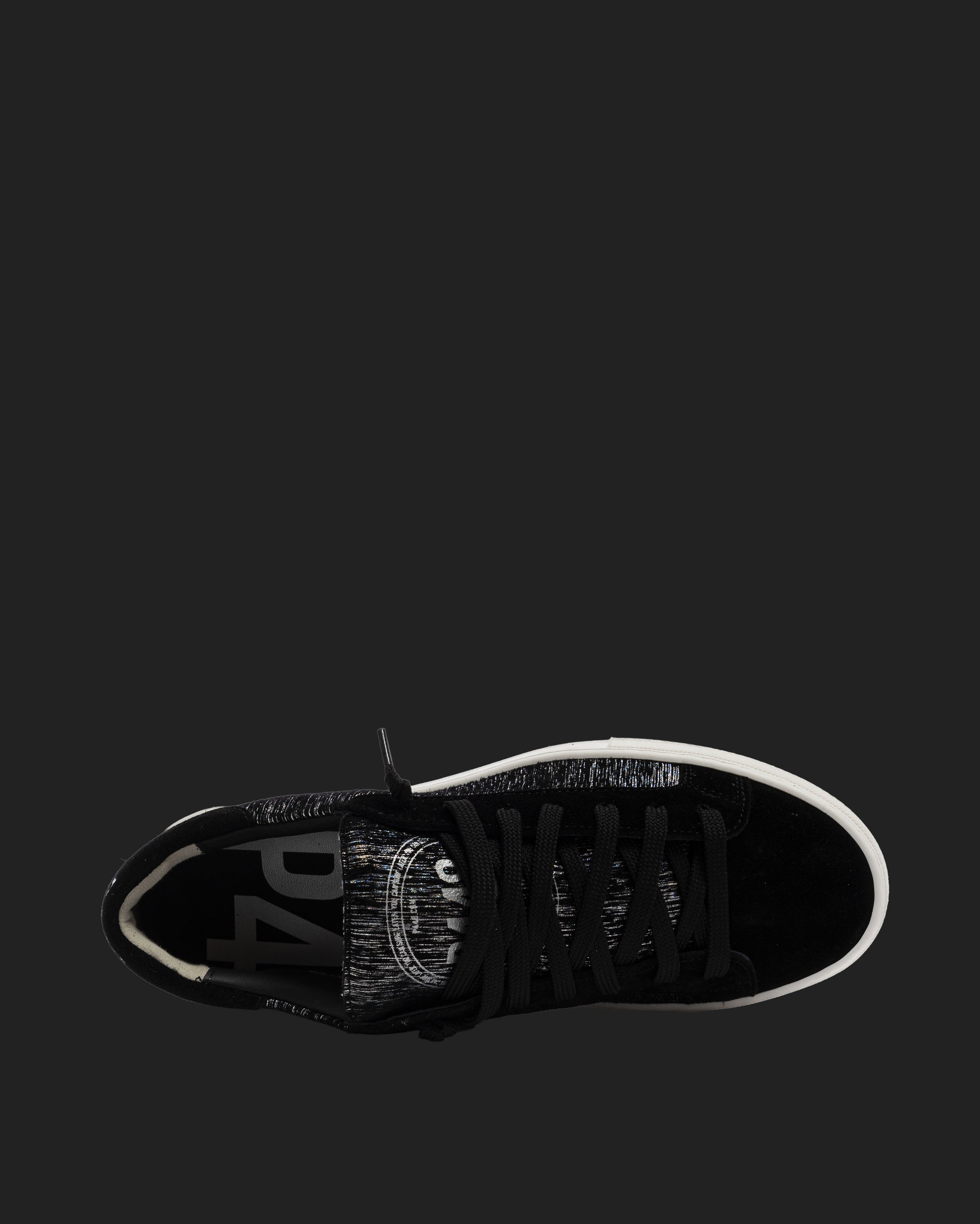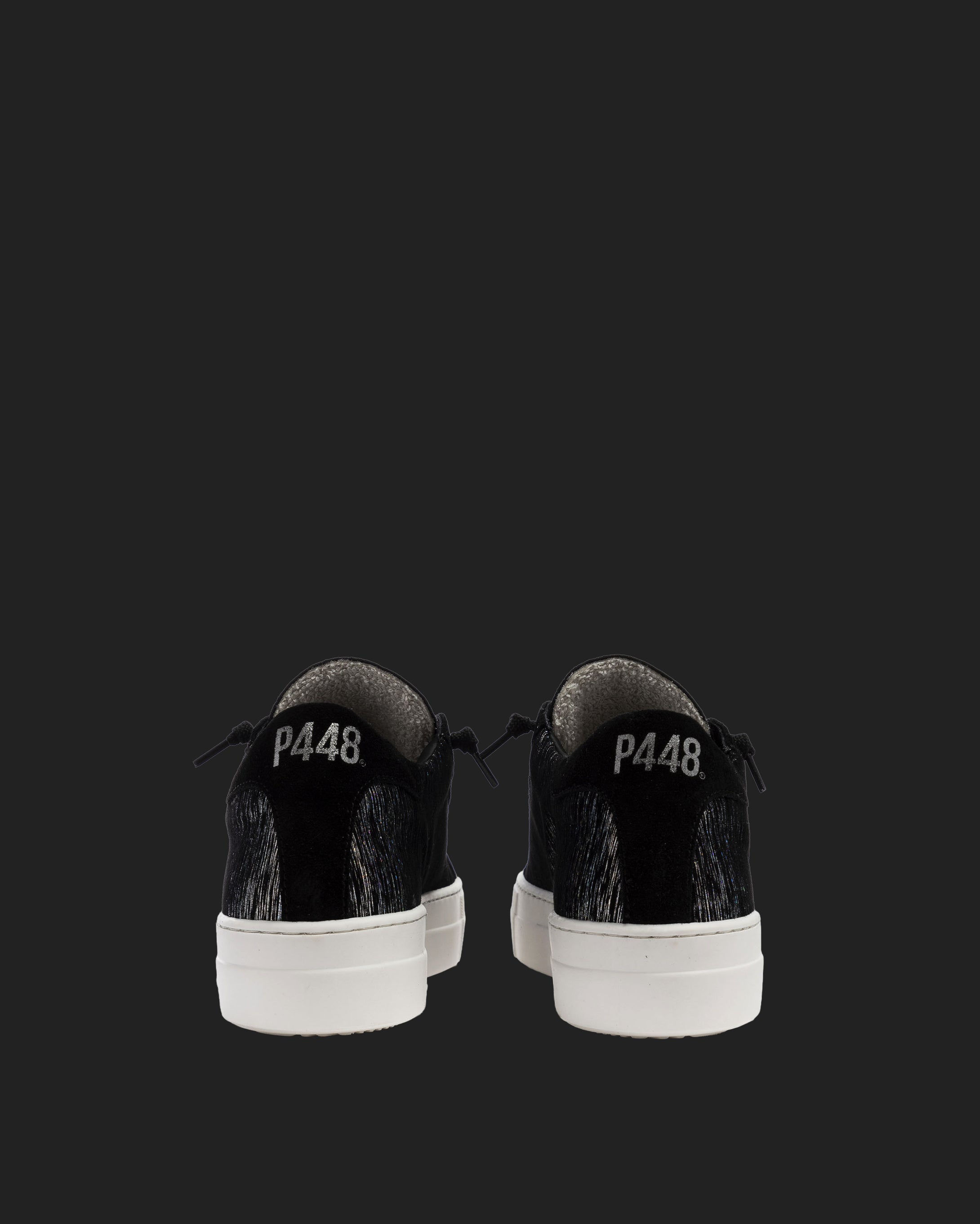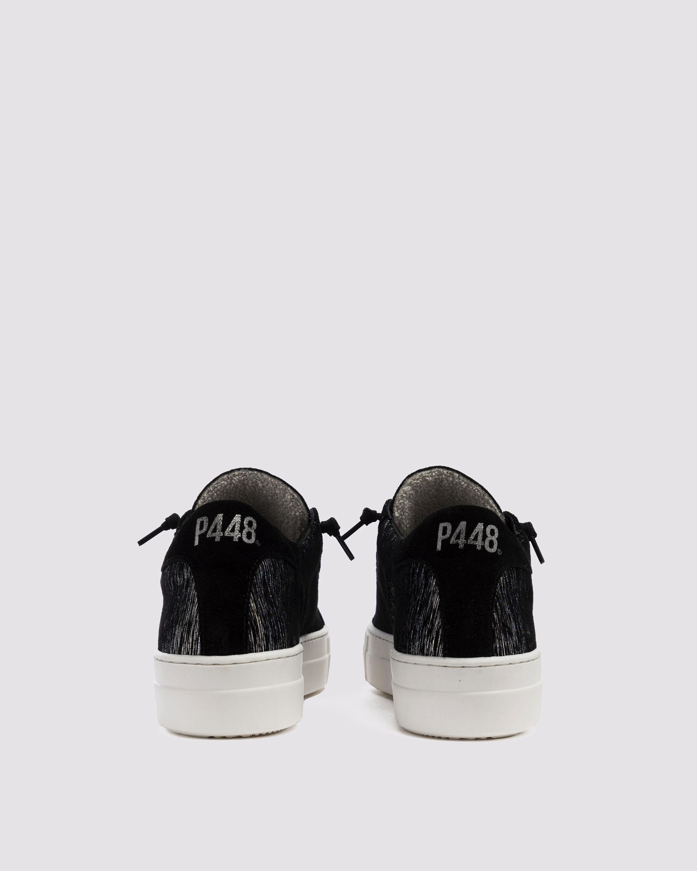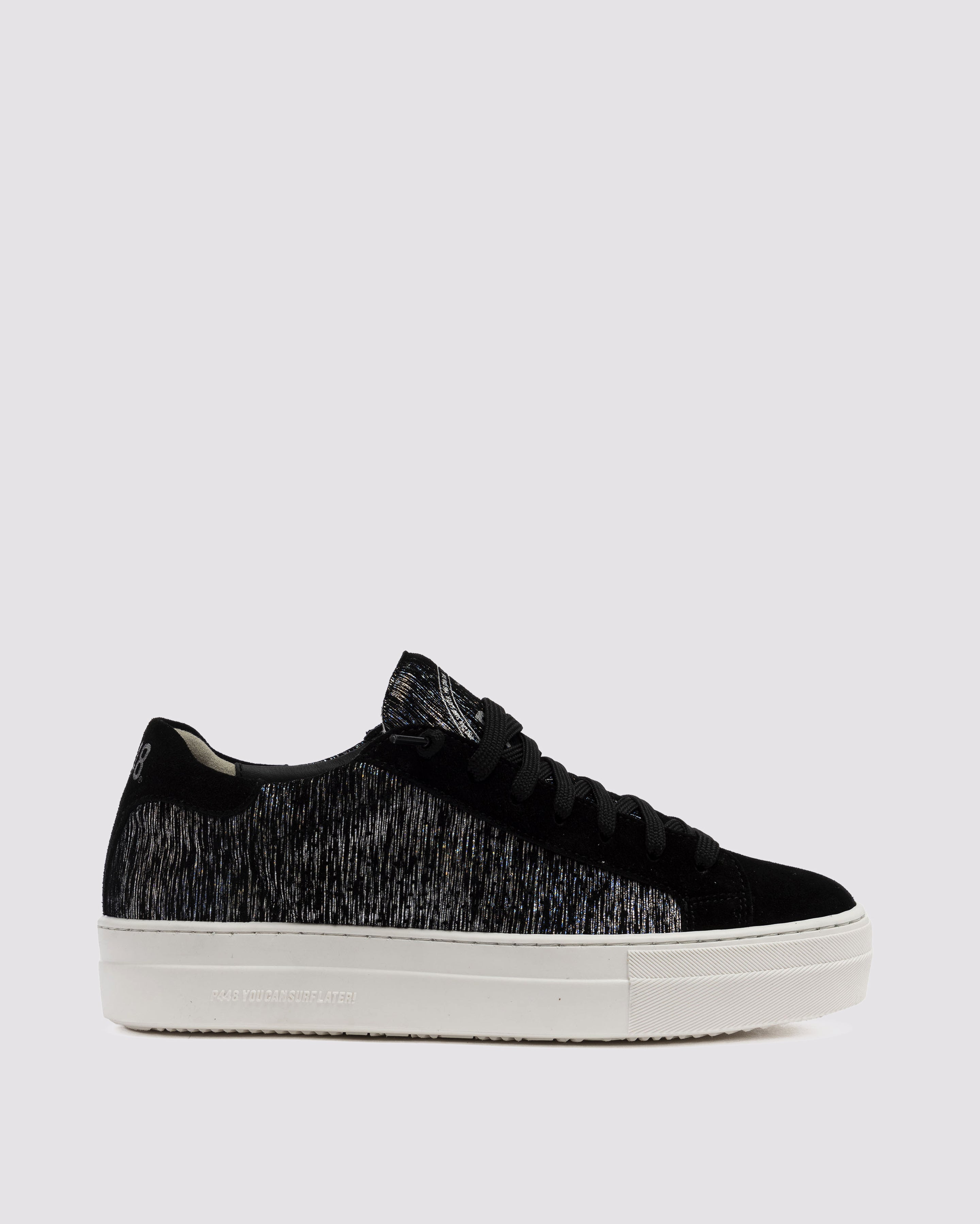The Thea Nightfall is wrapped in black suede and holographic leather with a black suede holographic tongue. Black laces and our signature P448 platform rubber sole finish off the look. This playful platform runs small, so be sure to size up if you’re in between.