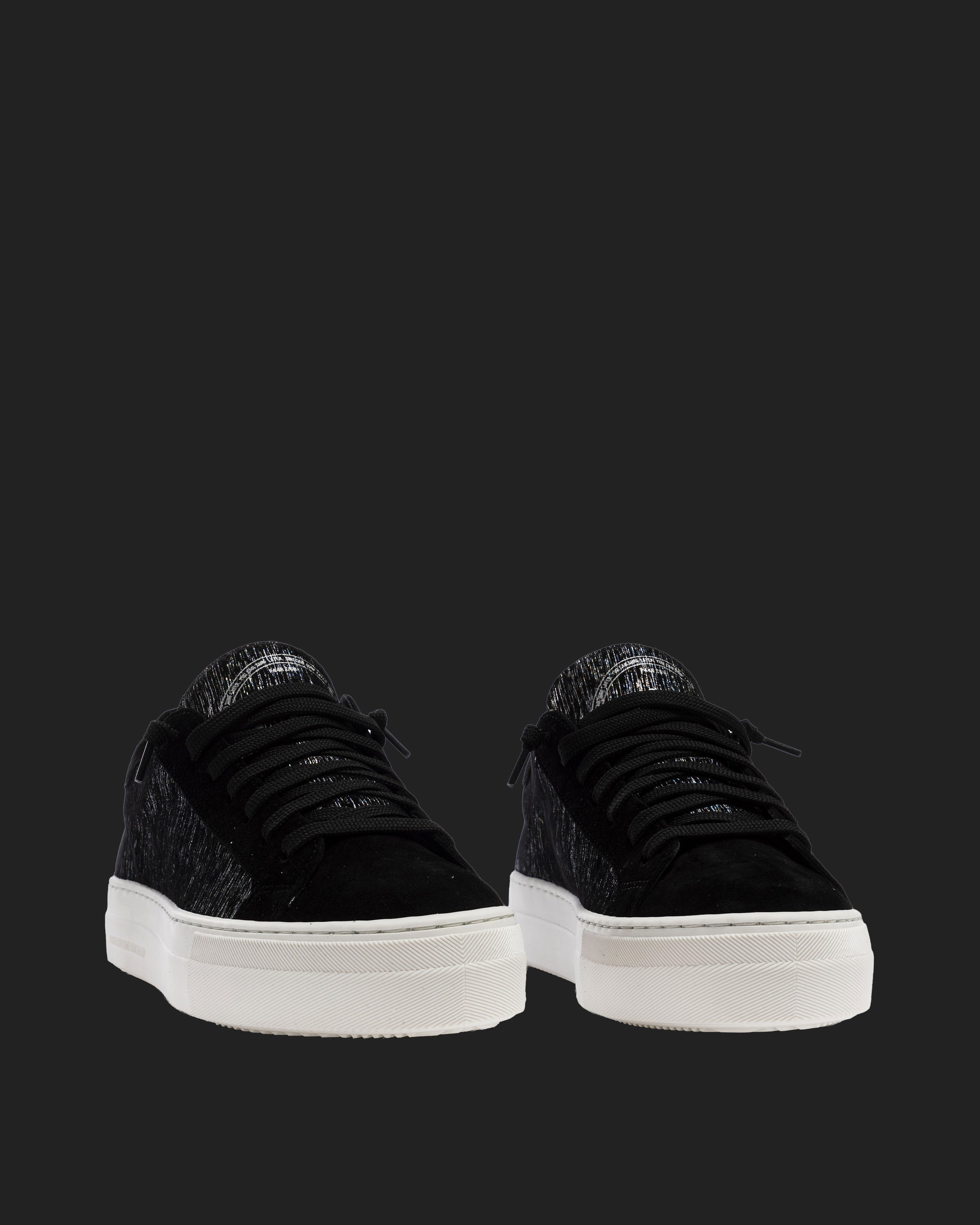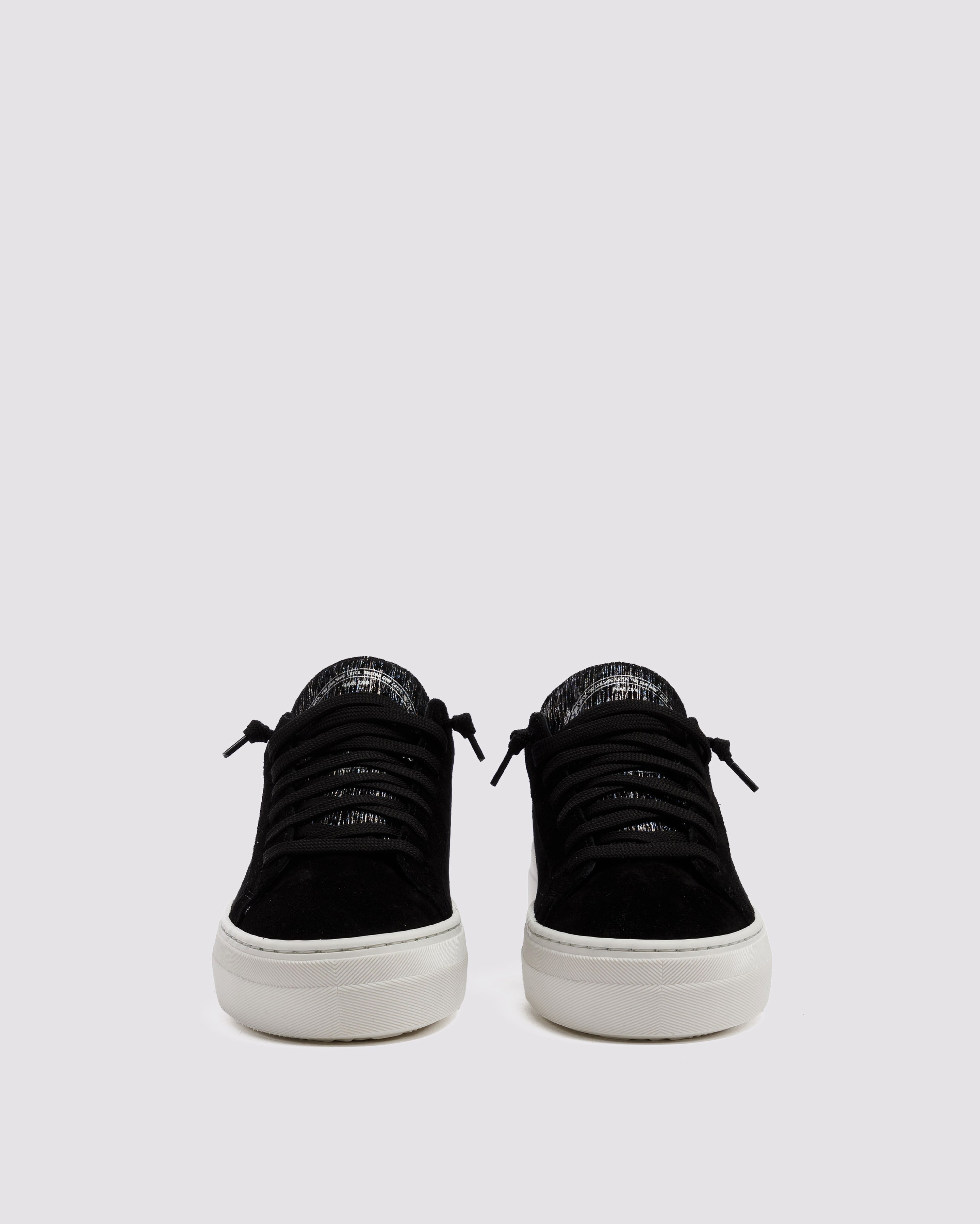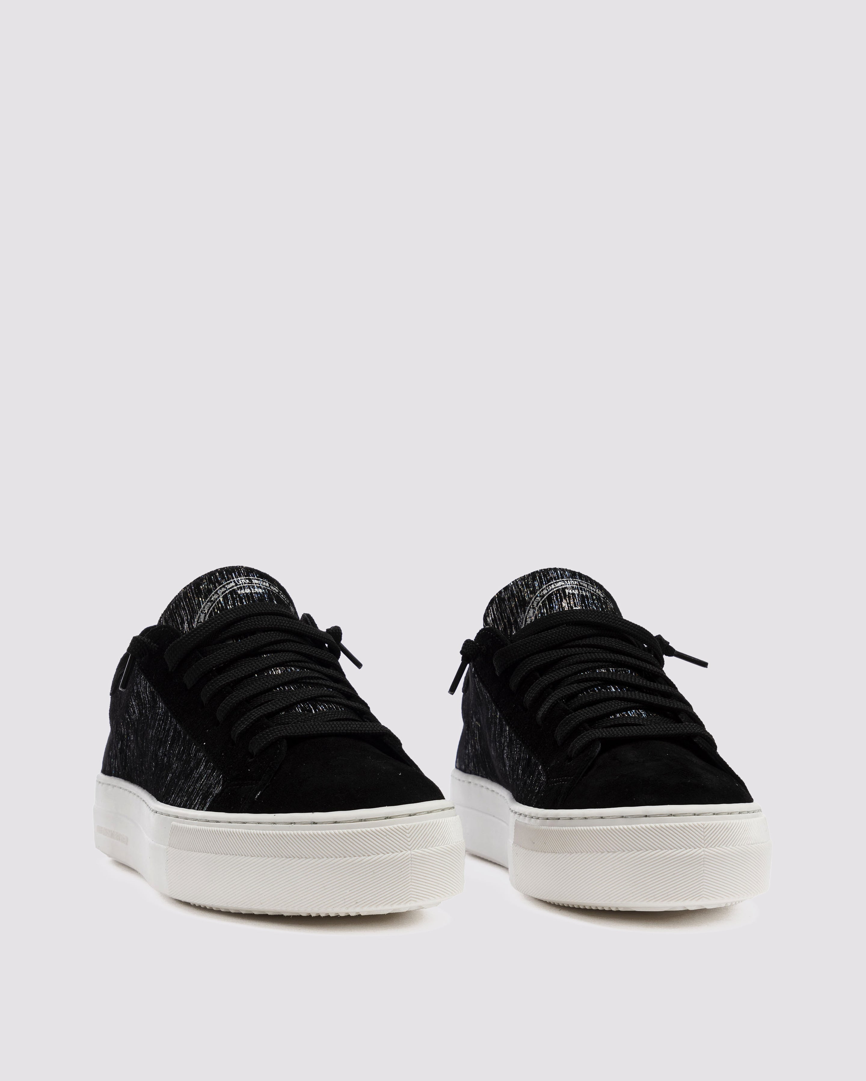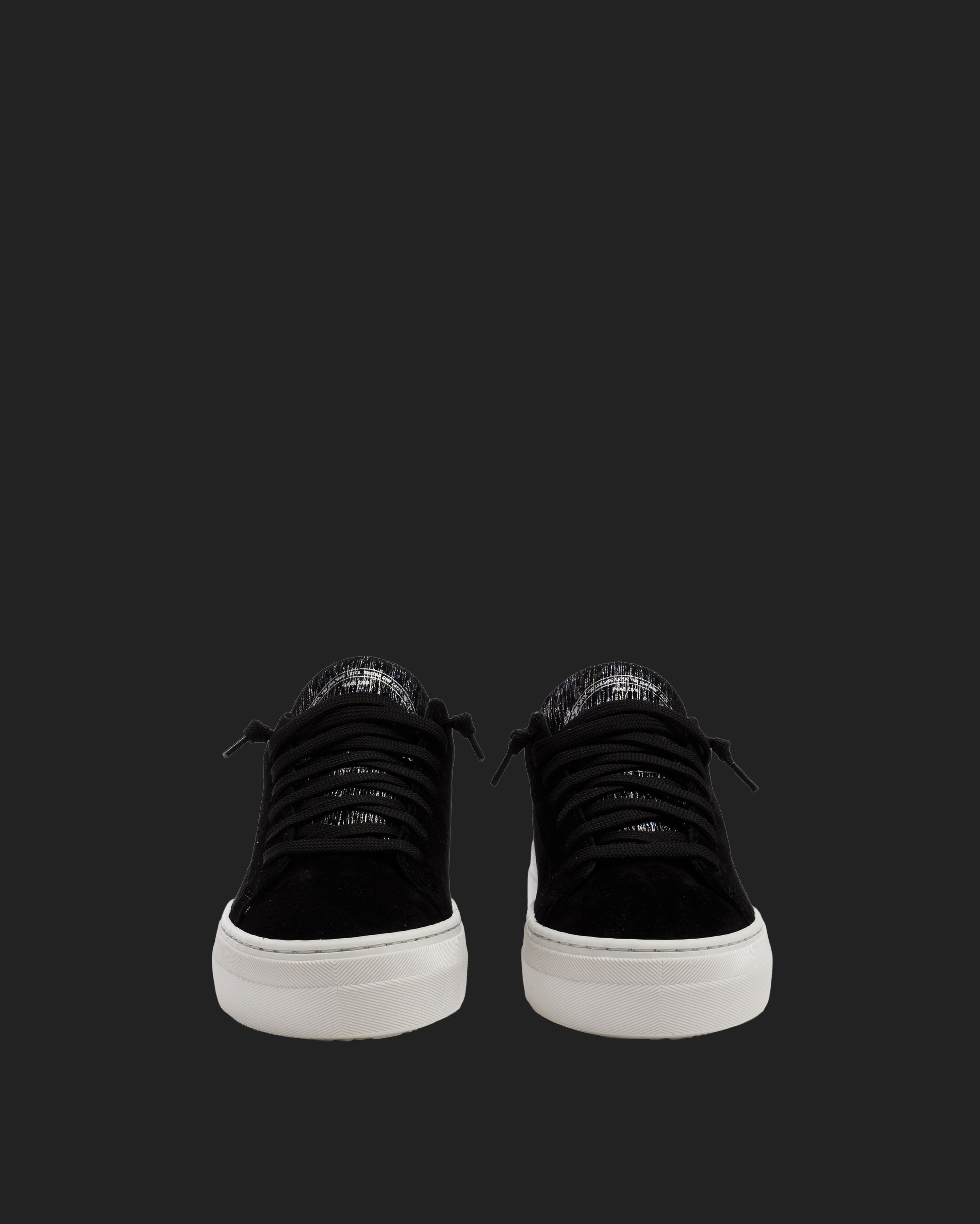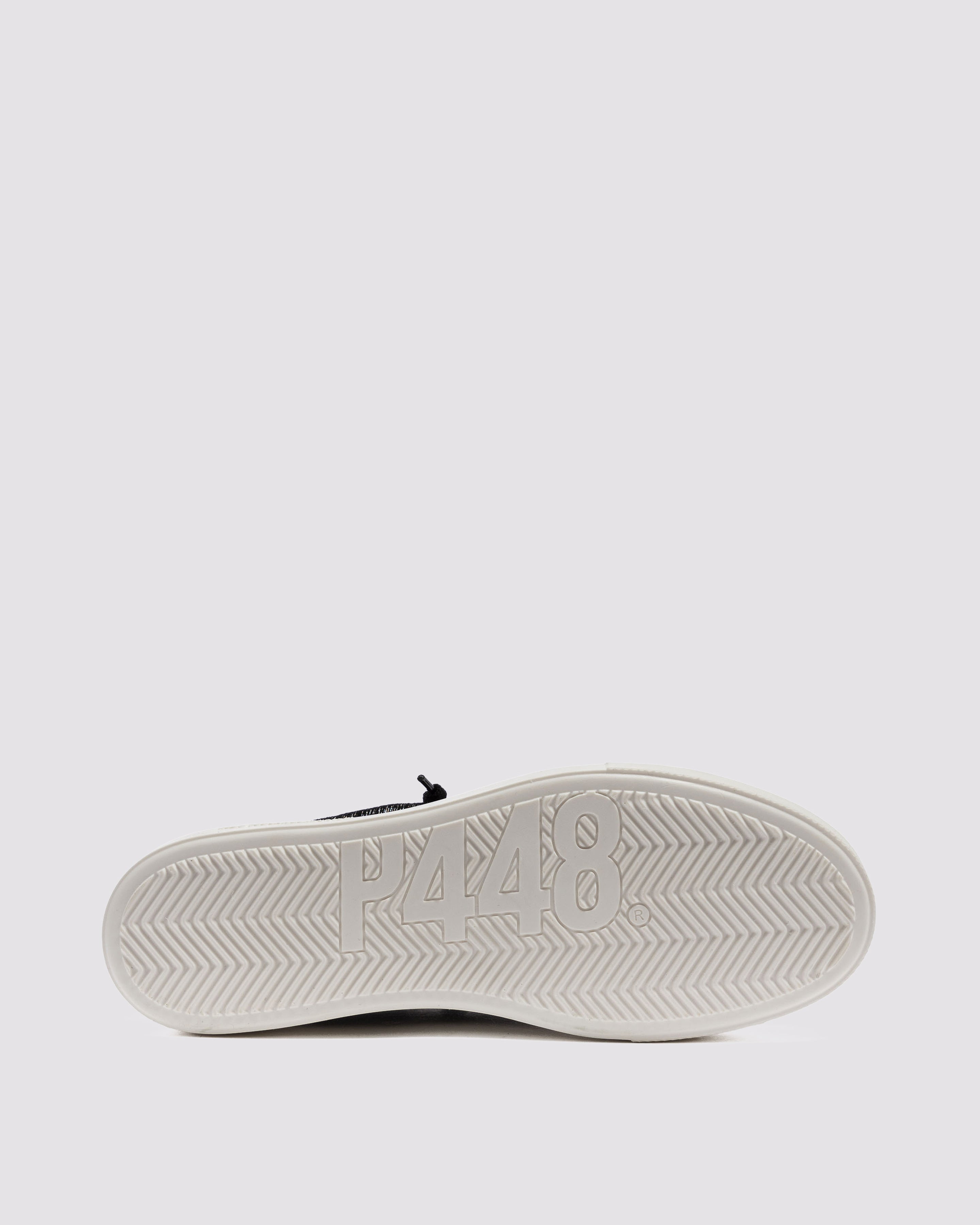 The Thea Nightfall is wrapped in black suede and holographic leather with a black suede holographic tongue. Black laces and our signature P448 platform rubber sole finish off the look. This playful platform runs small, so be sure to size up if you’re in between.