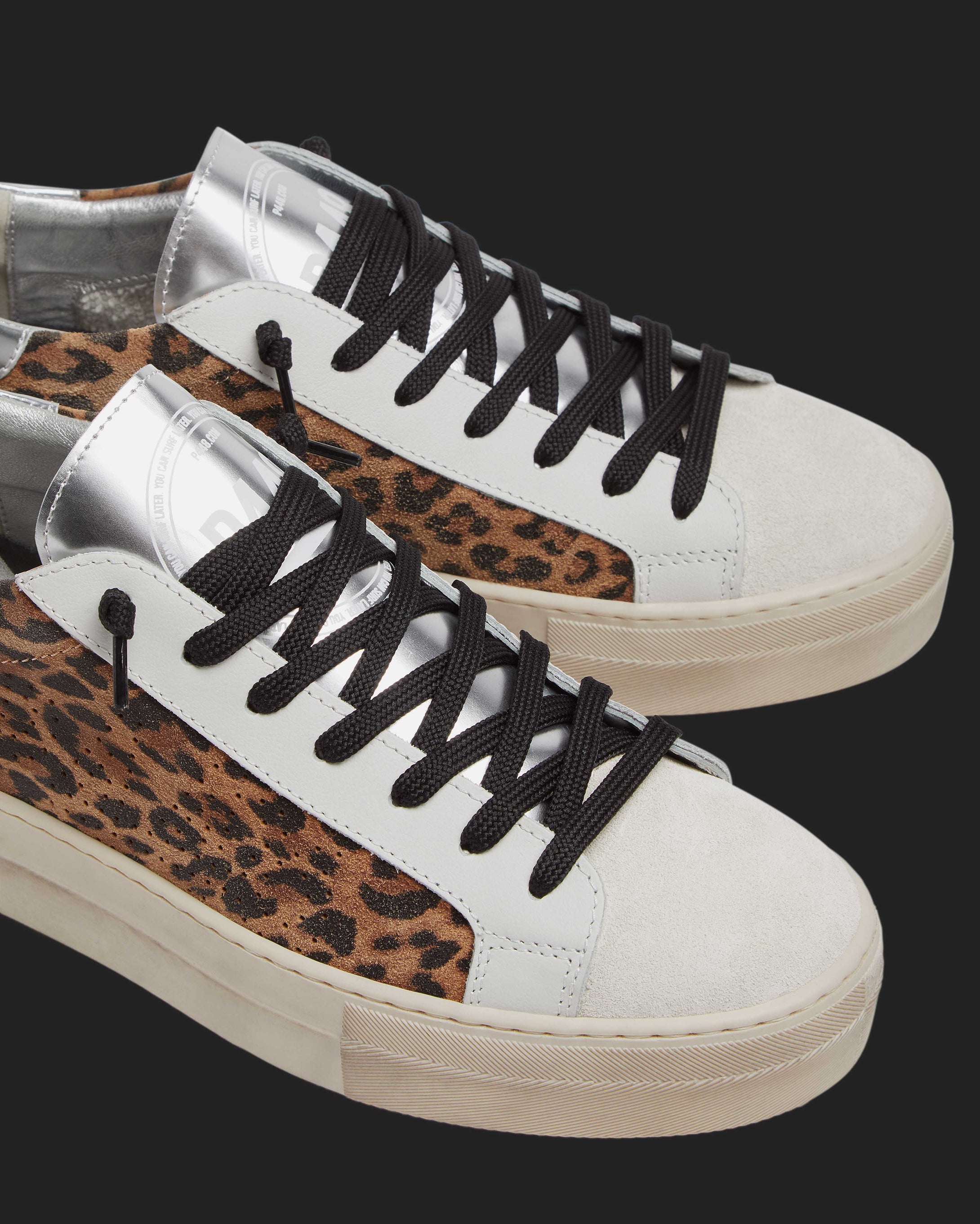 The Thea Leopard/Silver is wrapped in leopard print leather, complemented by a silver leather tongue and heel tab, all grounded by white leather trims and a cream suede toe. Black cotton laces and beige treads under our signature P448 hand-distressed platform rubber soles finish off the look. This playful animal print sneaker runs small, so be sure to size up if you’re in between.