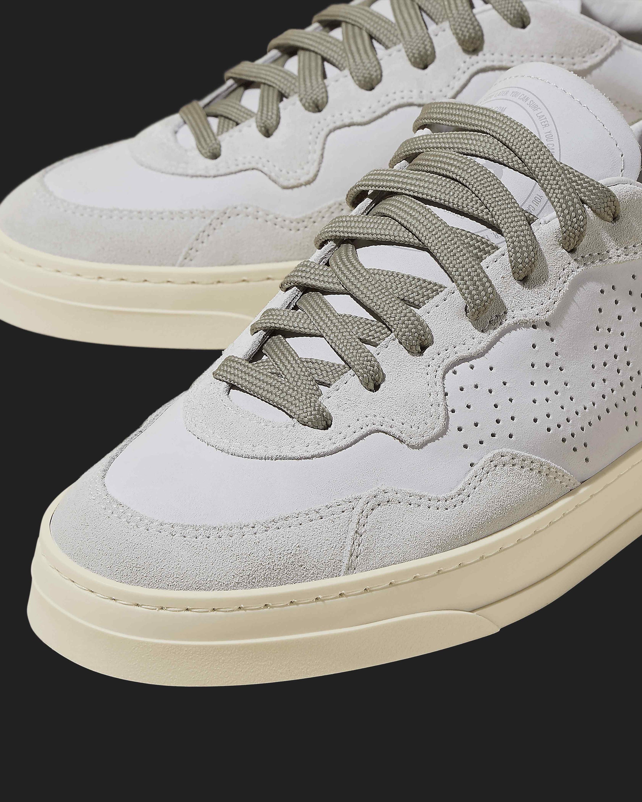 The Bali Diego features a white leather upper, tongue and toe with off-white suede trim, complemented by the green suede heel tab and green cotton laces.