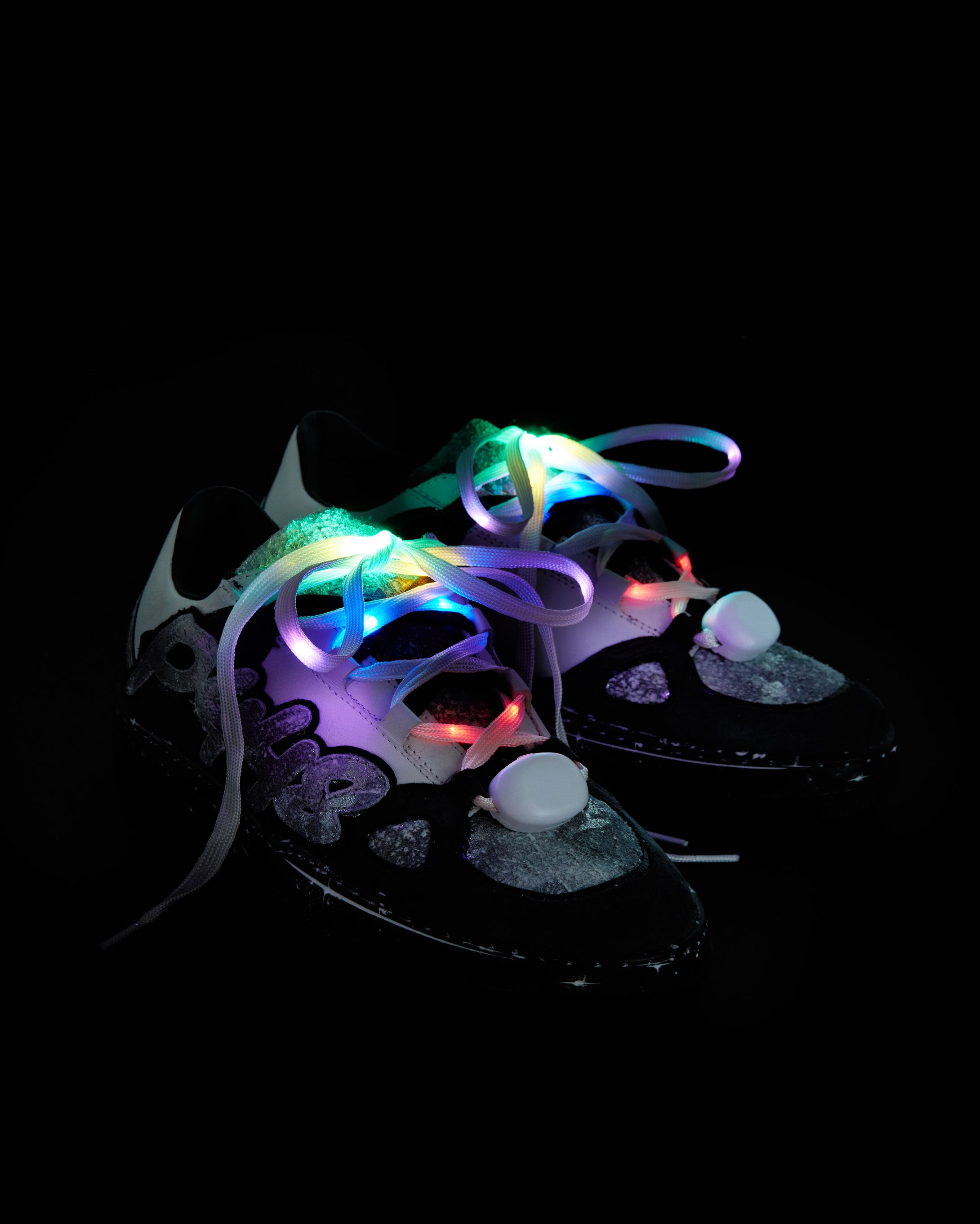 In the George Stella, P448 Brand Instigator, AKA Olympic skateboarder Bombette Martin, opted for a galaxy-inspired palette with a modern twist. Black suede and white leather keep the look grounded, while the graffitied P448 logo, silver leather details, black constellation sole, and LED laces bring Bombette’s strikingly cool style to life.