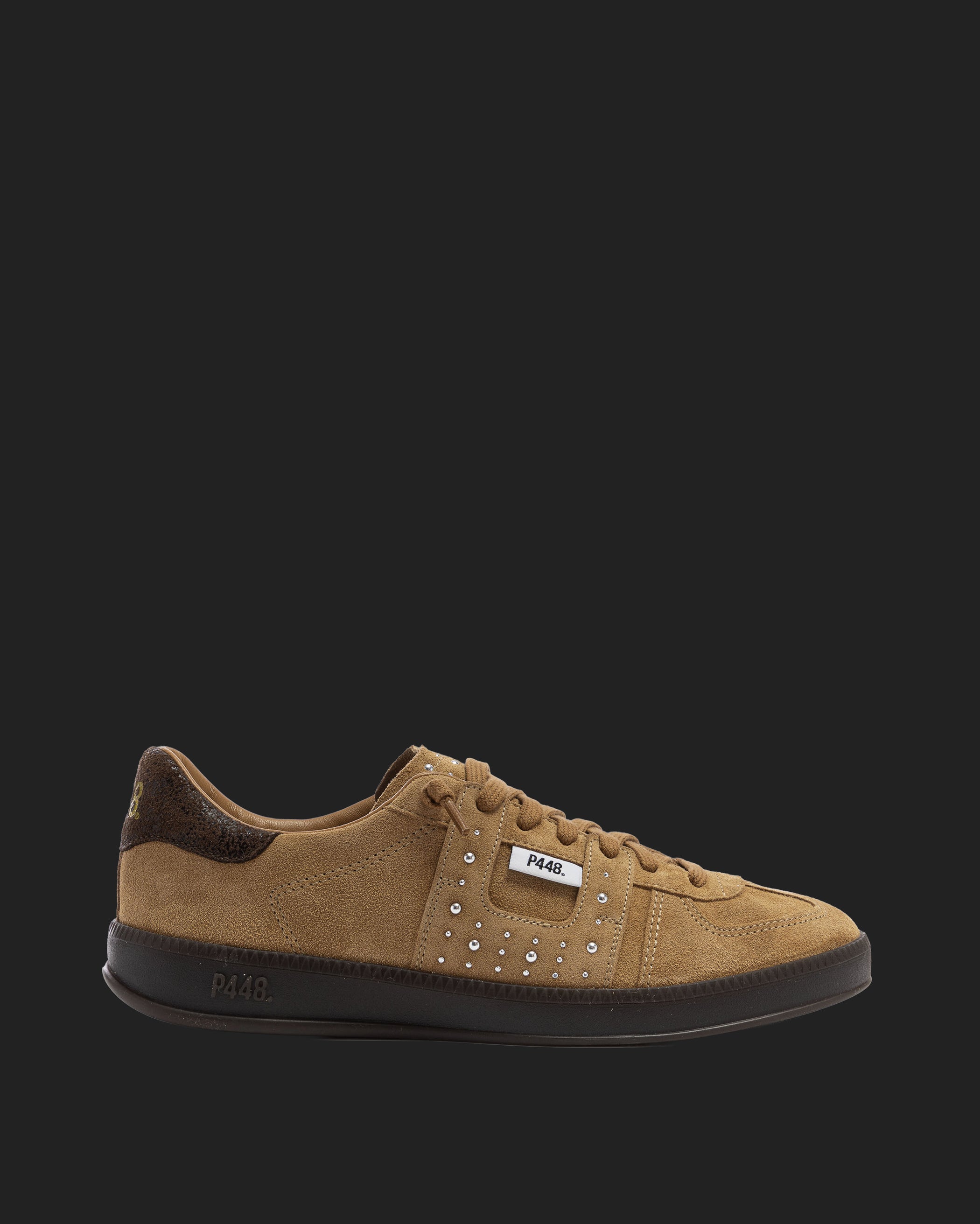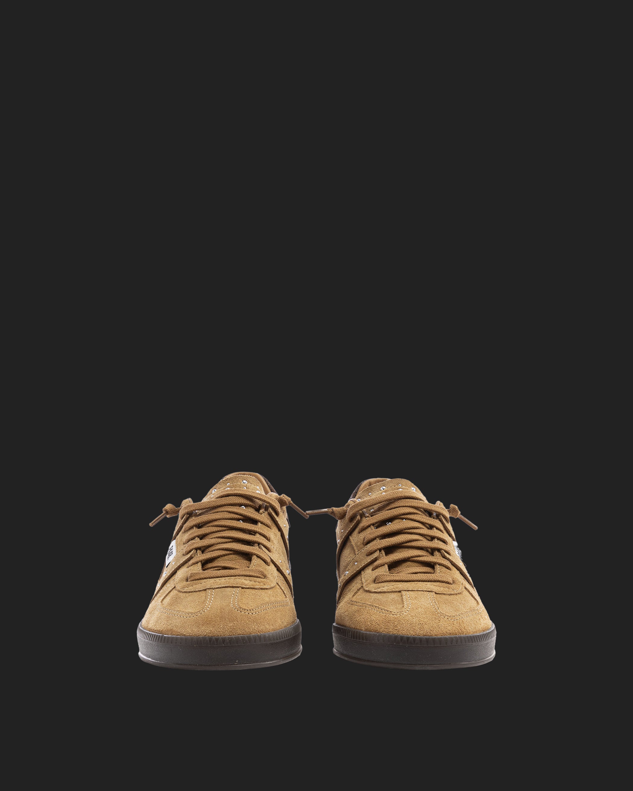 The Monza Glitterfine brings subtle shine to an all-white leather look with a gold glitter-finished beige suede toe, trim and heel tab. White cotton laces and an amber rubber sole finish off the look.