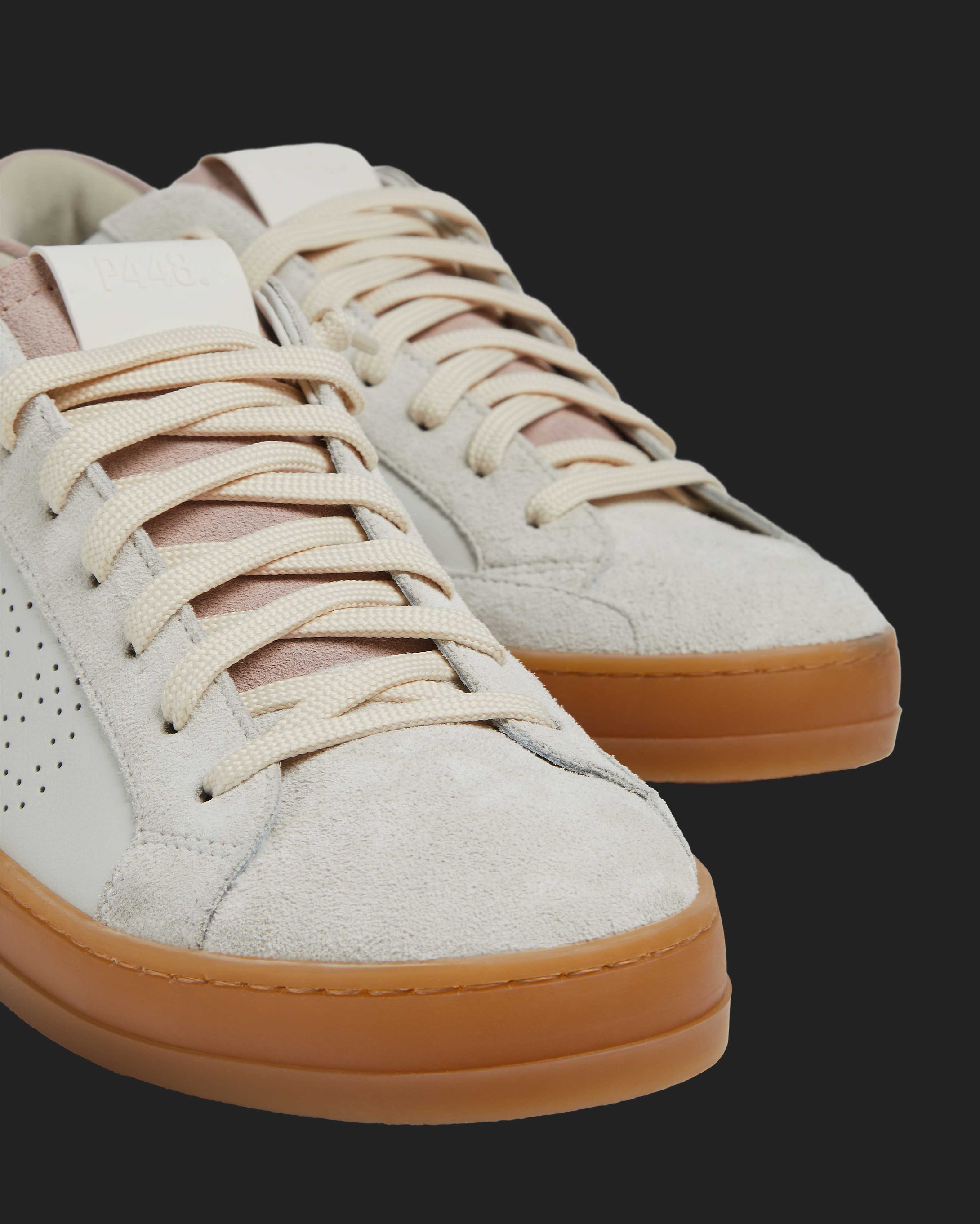 The John Lilac is wrapped in white leather with contrasting light pink and off-white suede details. Off-white cotton laces and our signature P448 amber rubber sole tie it all together.