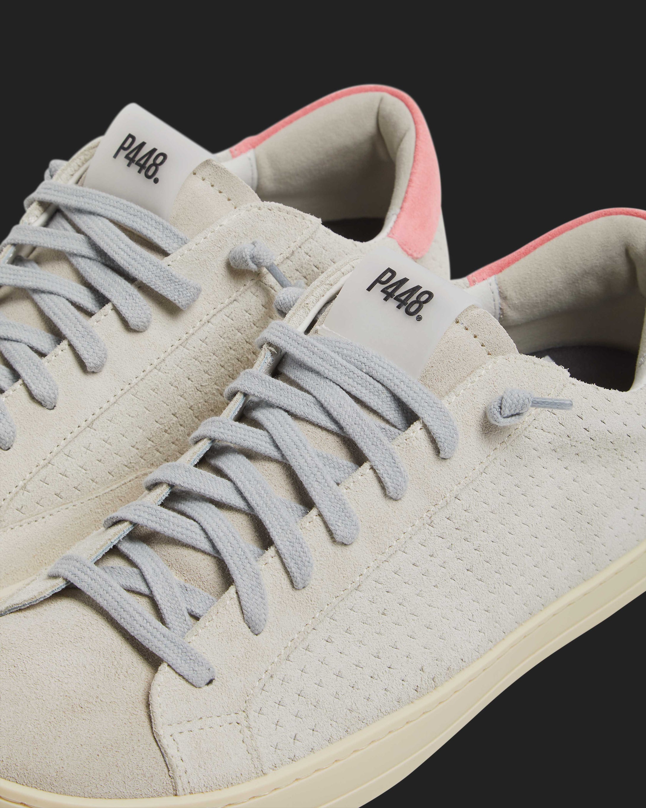 The John Calypso is wrapped in beige perforated suede with a contrasting fluorescent pink suede heel tab. Grey cotton laces and treads tie it all together.