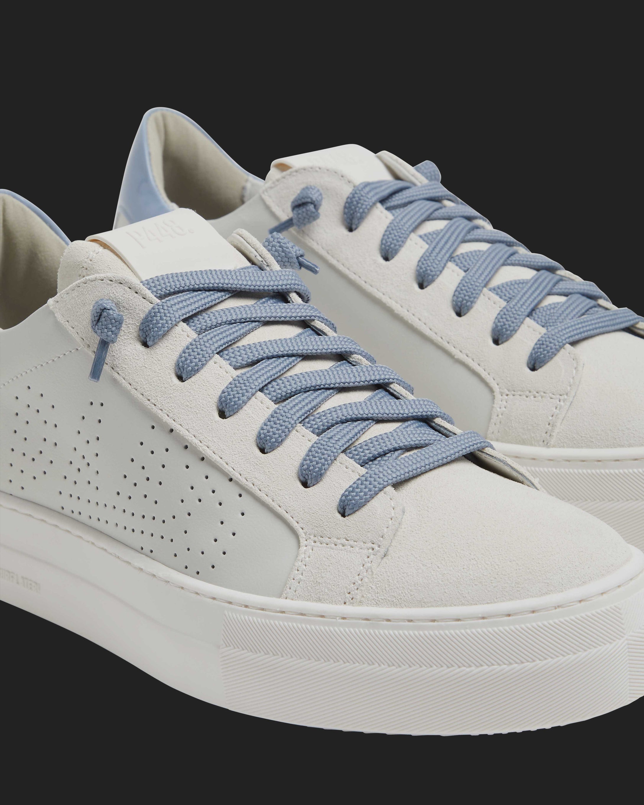 The Thea Sky is wrapped in white leather and suede, complemented by a light blue patent leather heel tab and matching cotton laces. This playful platform runs small, so be sure to size up if you're in between.