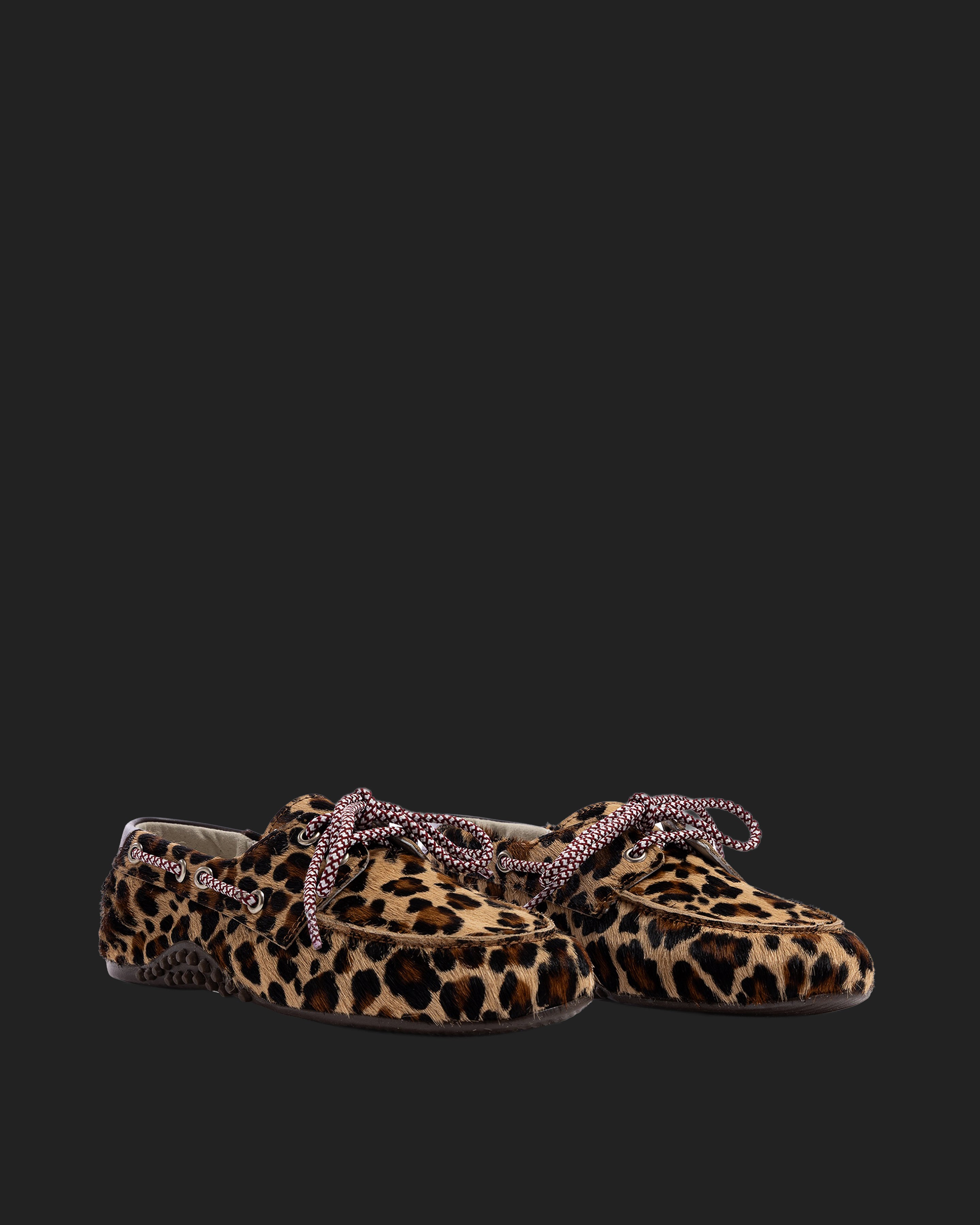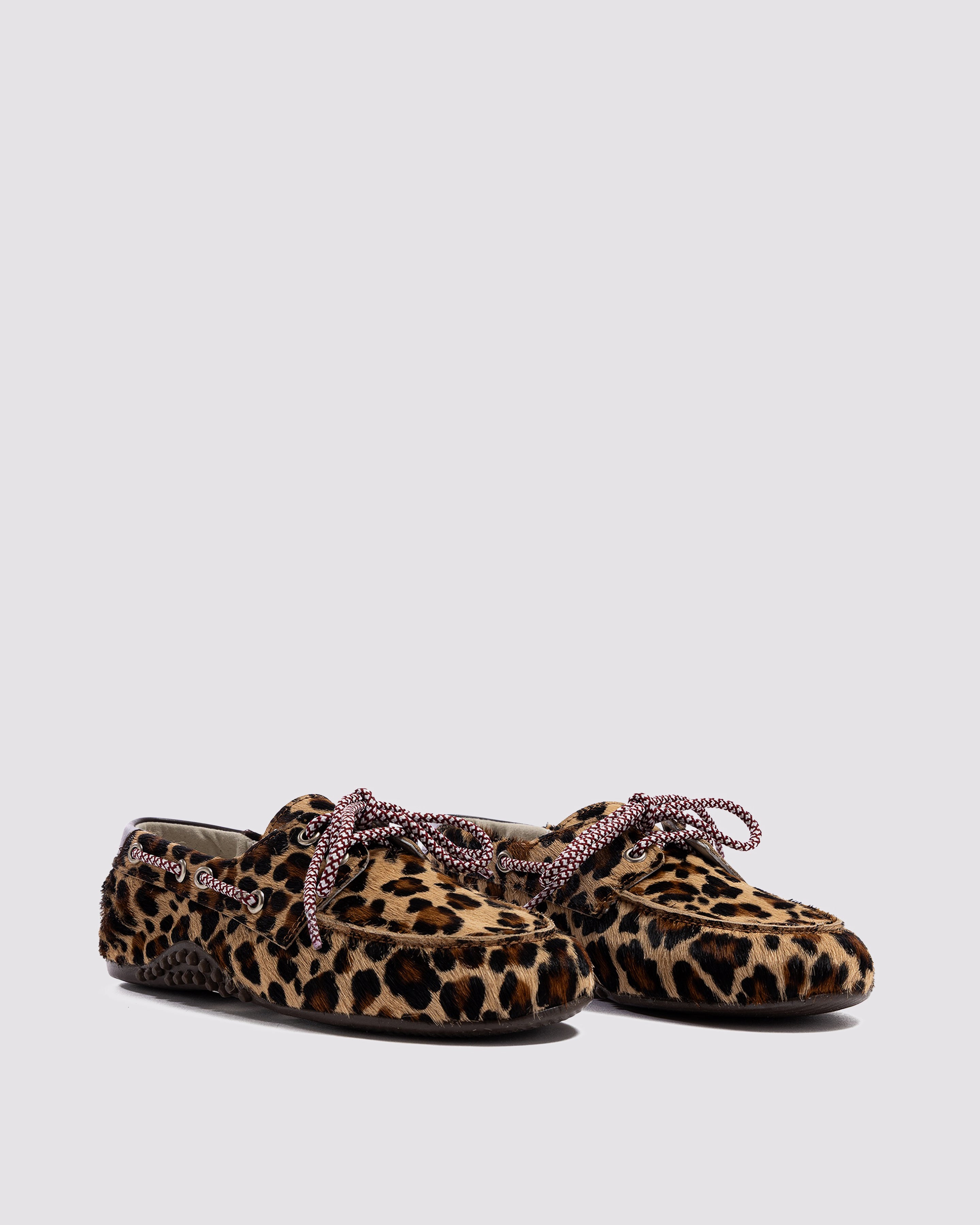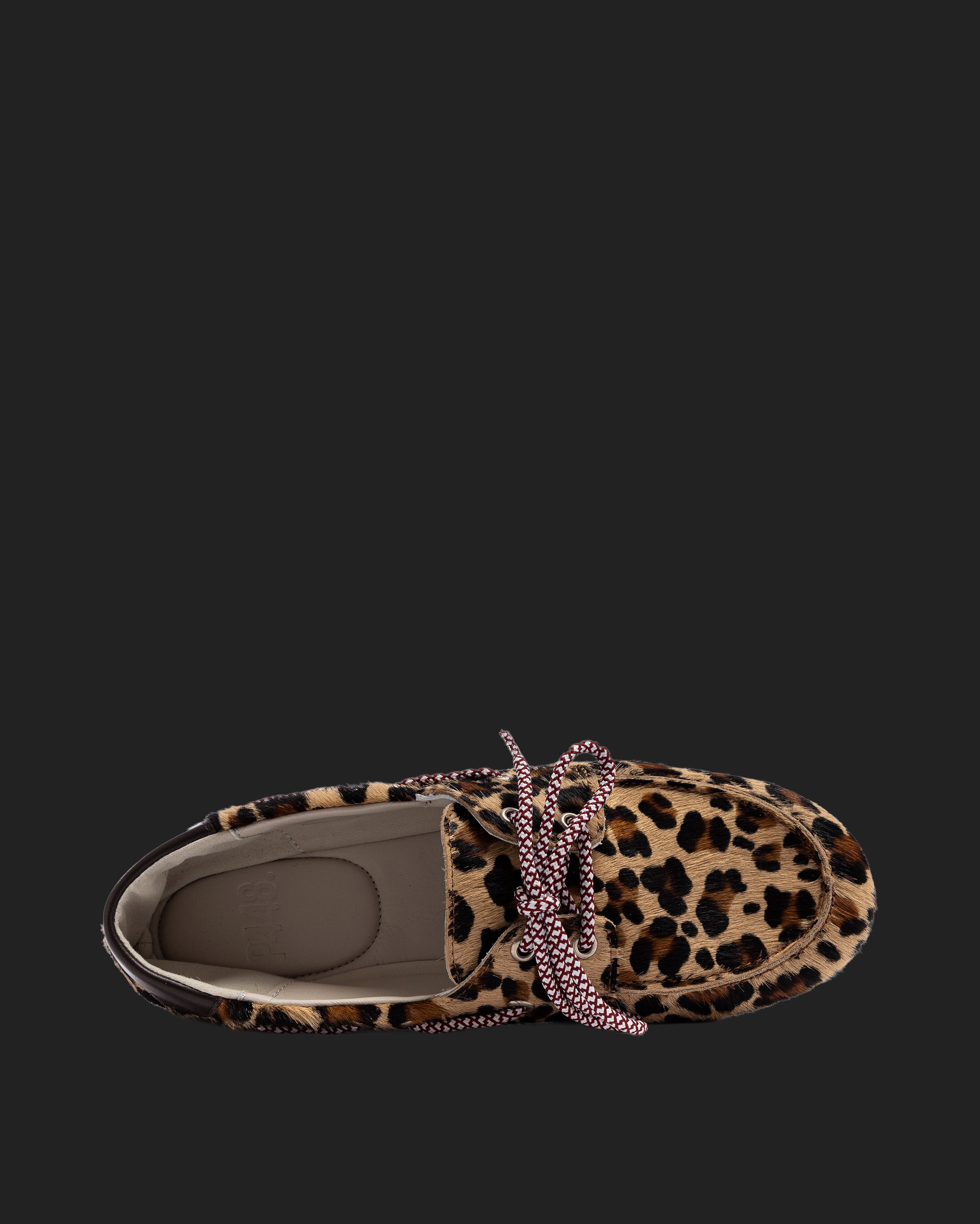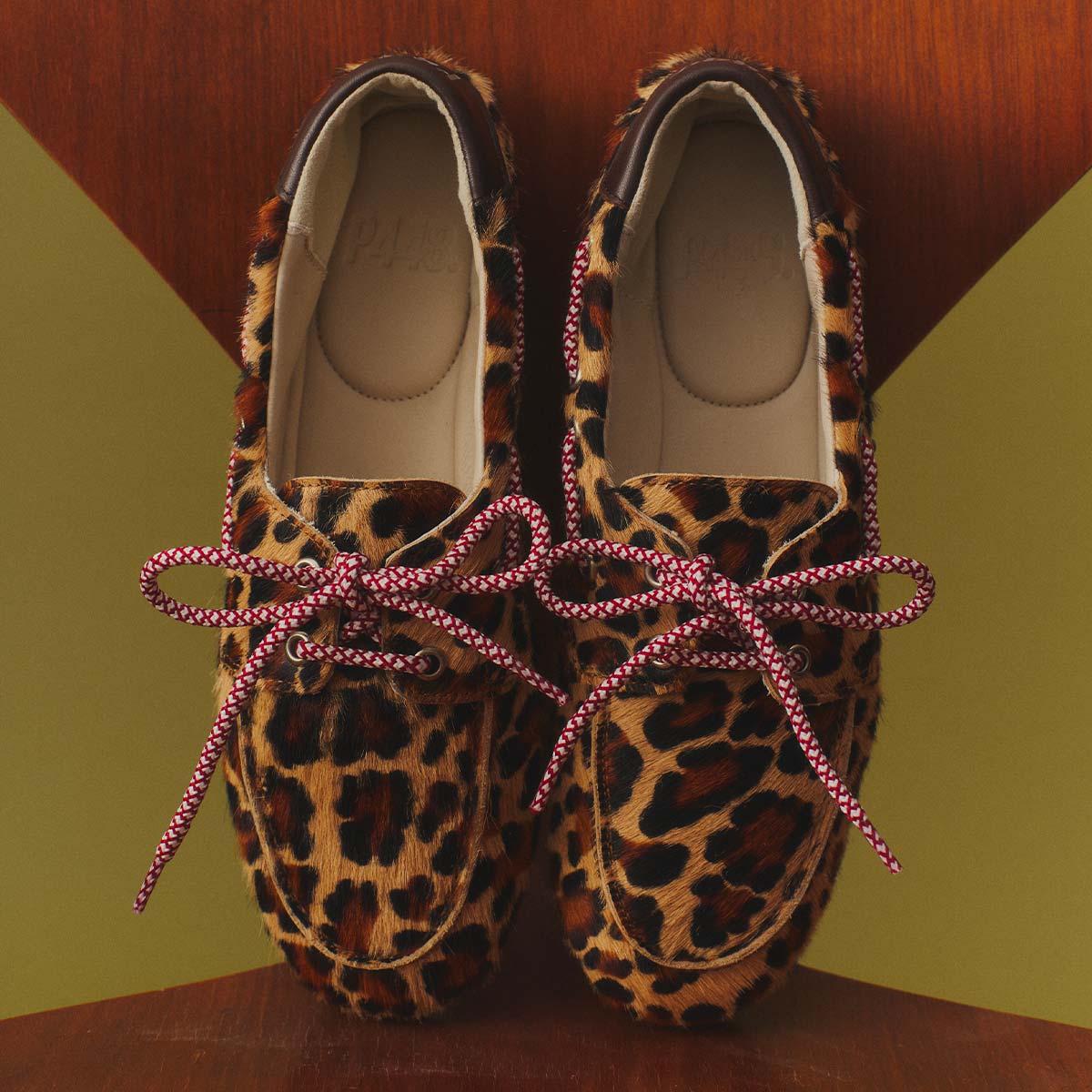 The Antibes Leopard Wine is a P448 sacchetto-designed boat shoe that uses a handmade process to bring you ultimate comfort and sleek style. Soft all-over leopard print haircalf leather is complemented by a brown leather heel tab, with burgundy and white laces woven around the shoe. Our raised gum tread finishes off the look.