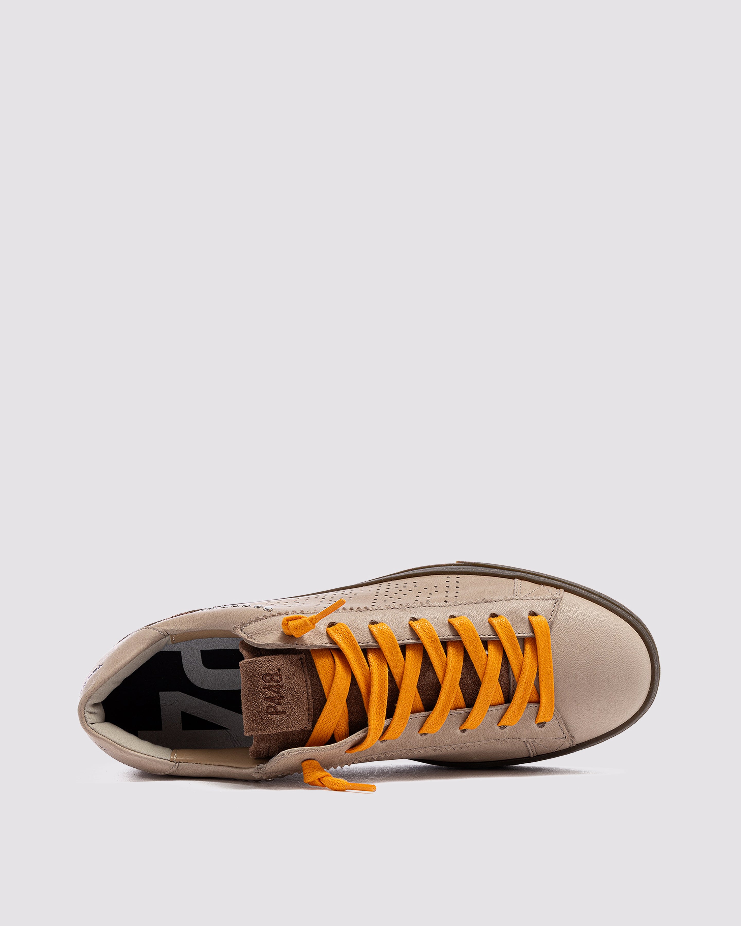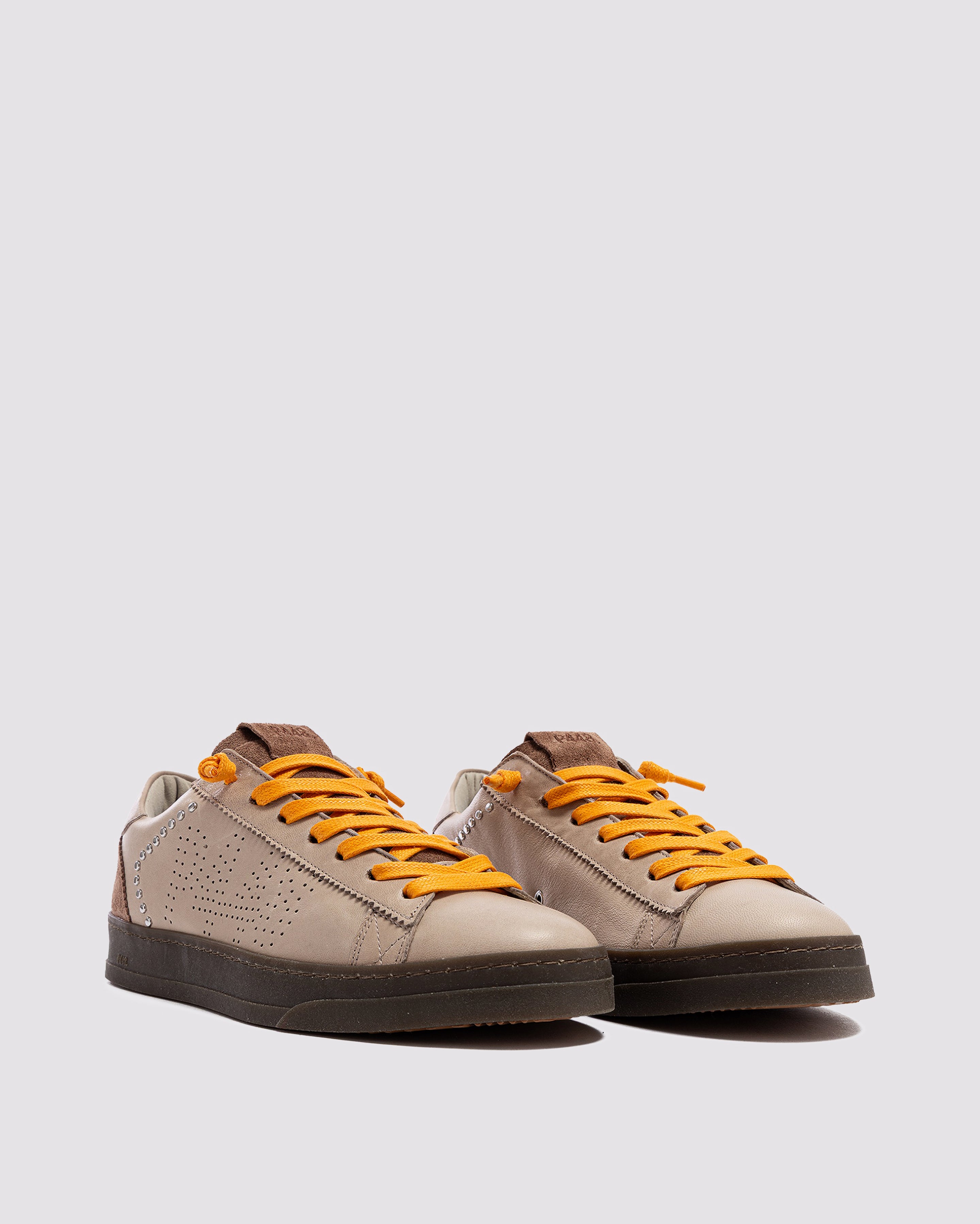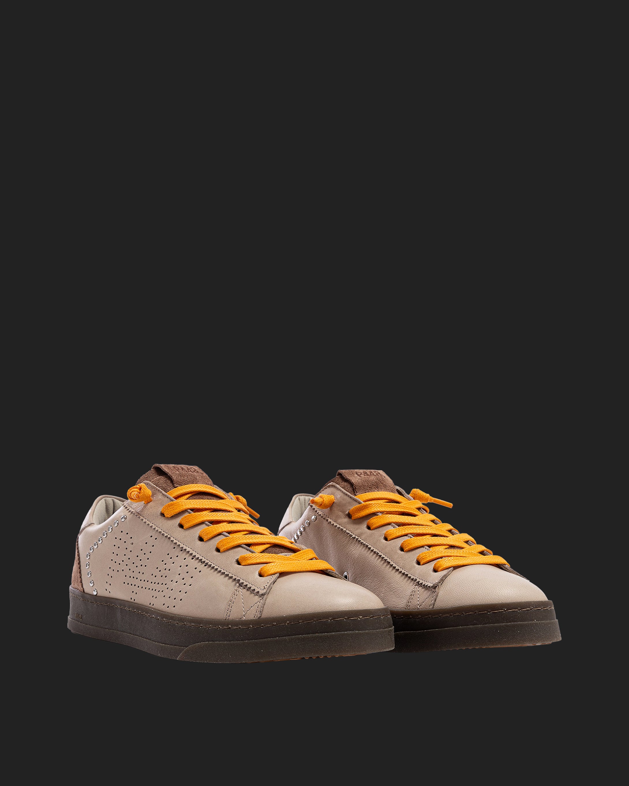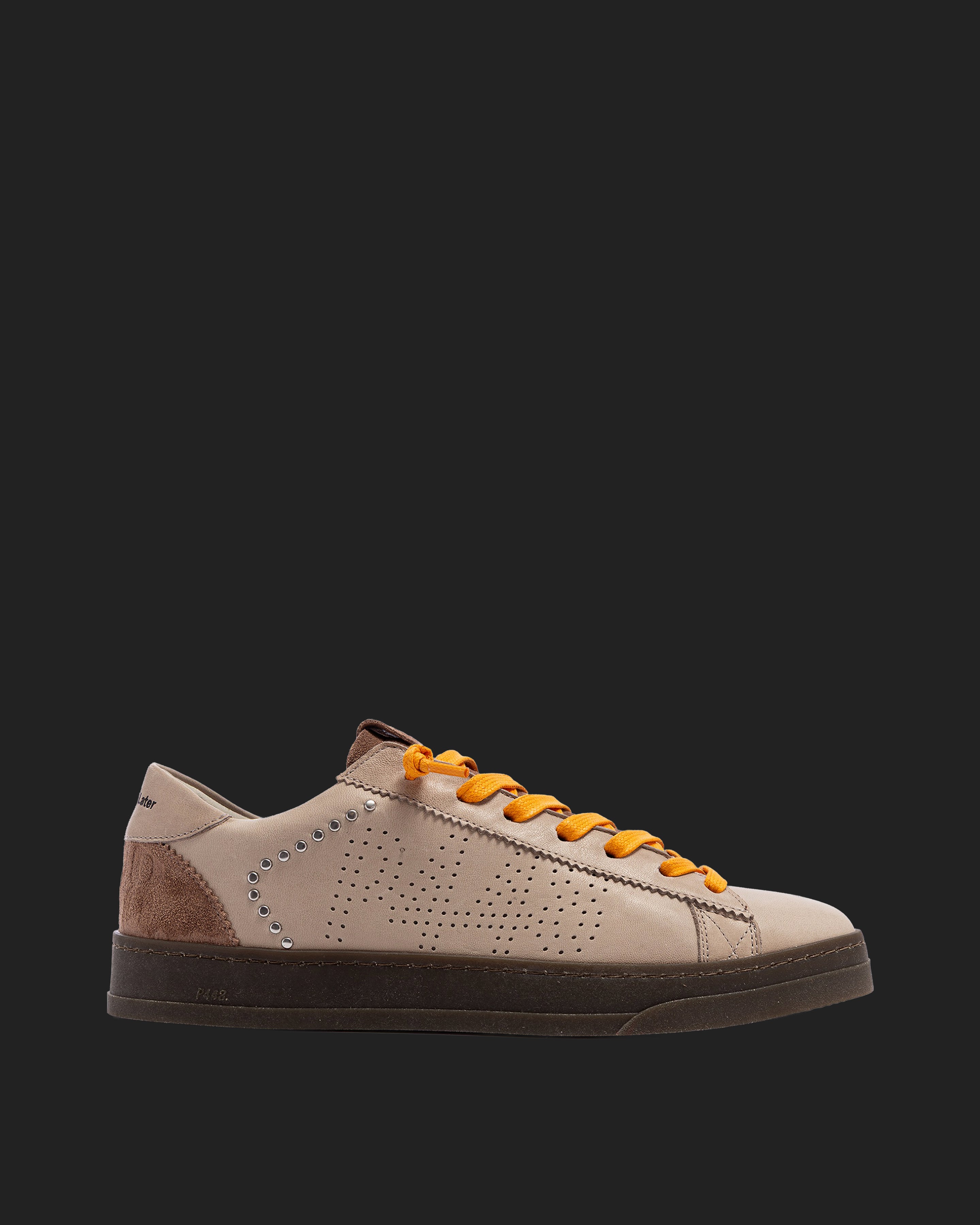 The Jack Terra features all-over beige leather complemented by brown suede and studded accents. Orange waxed cotton laces, our P448...