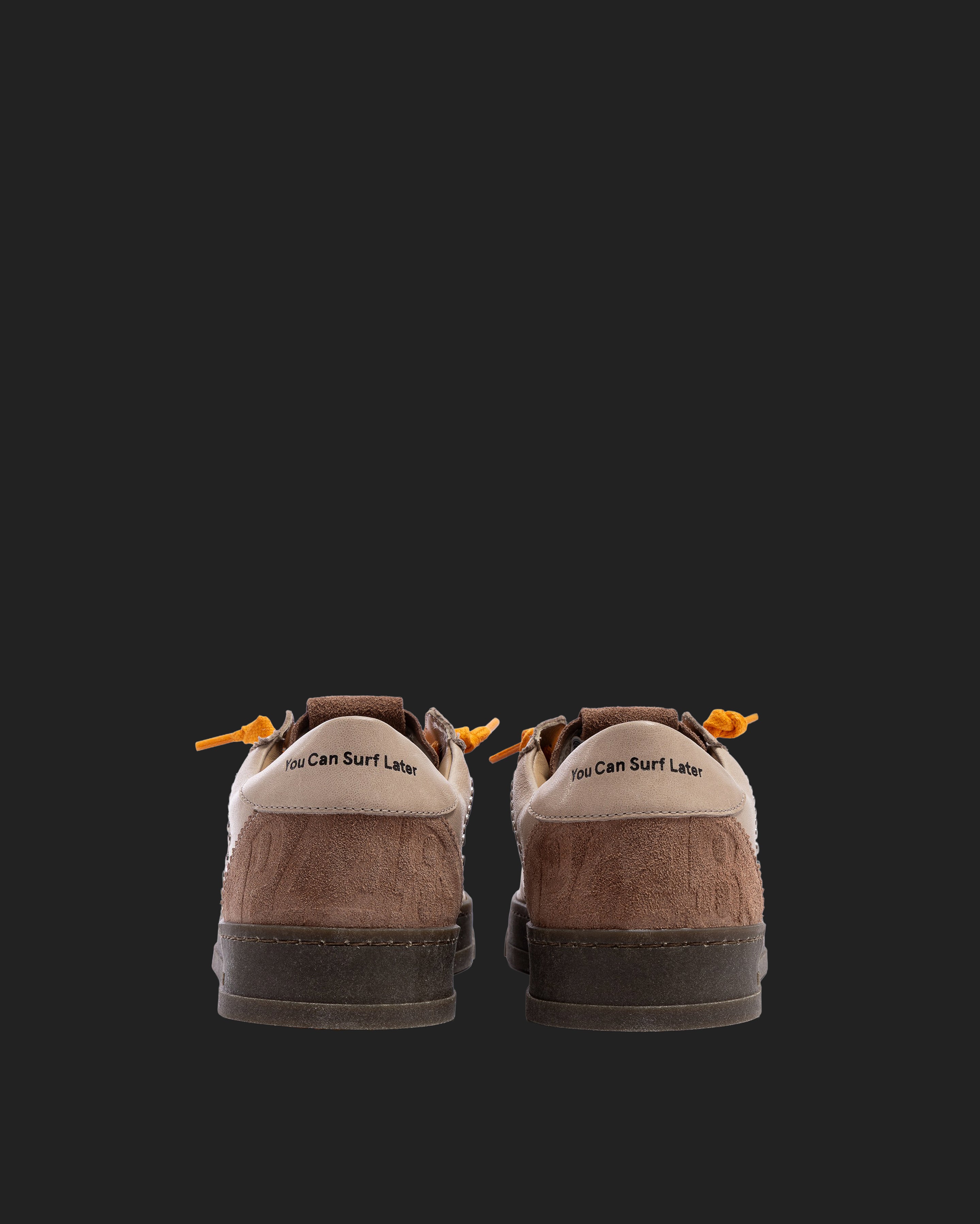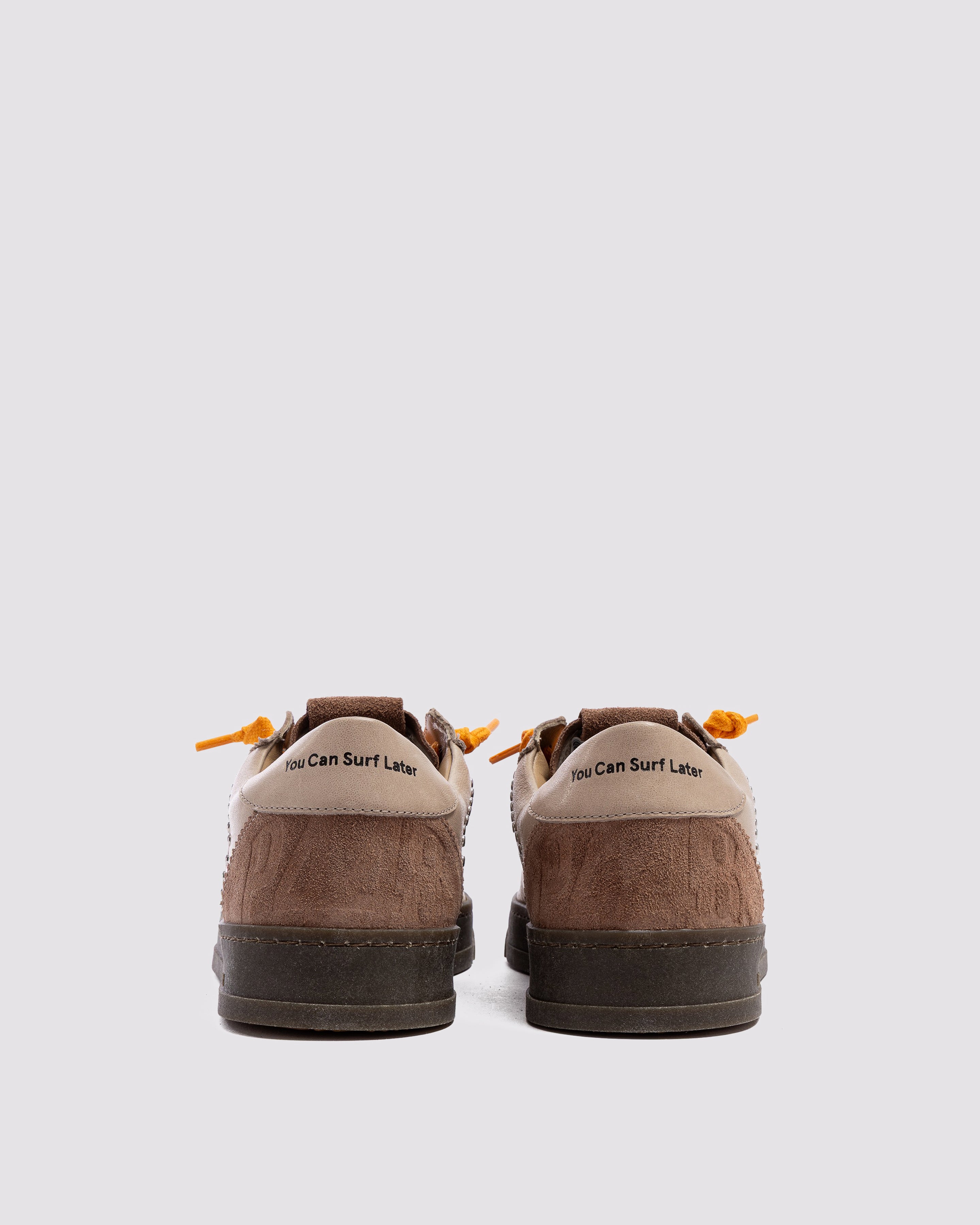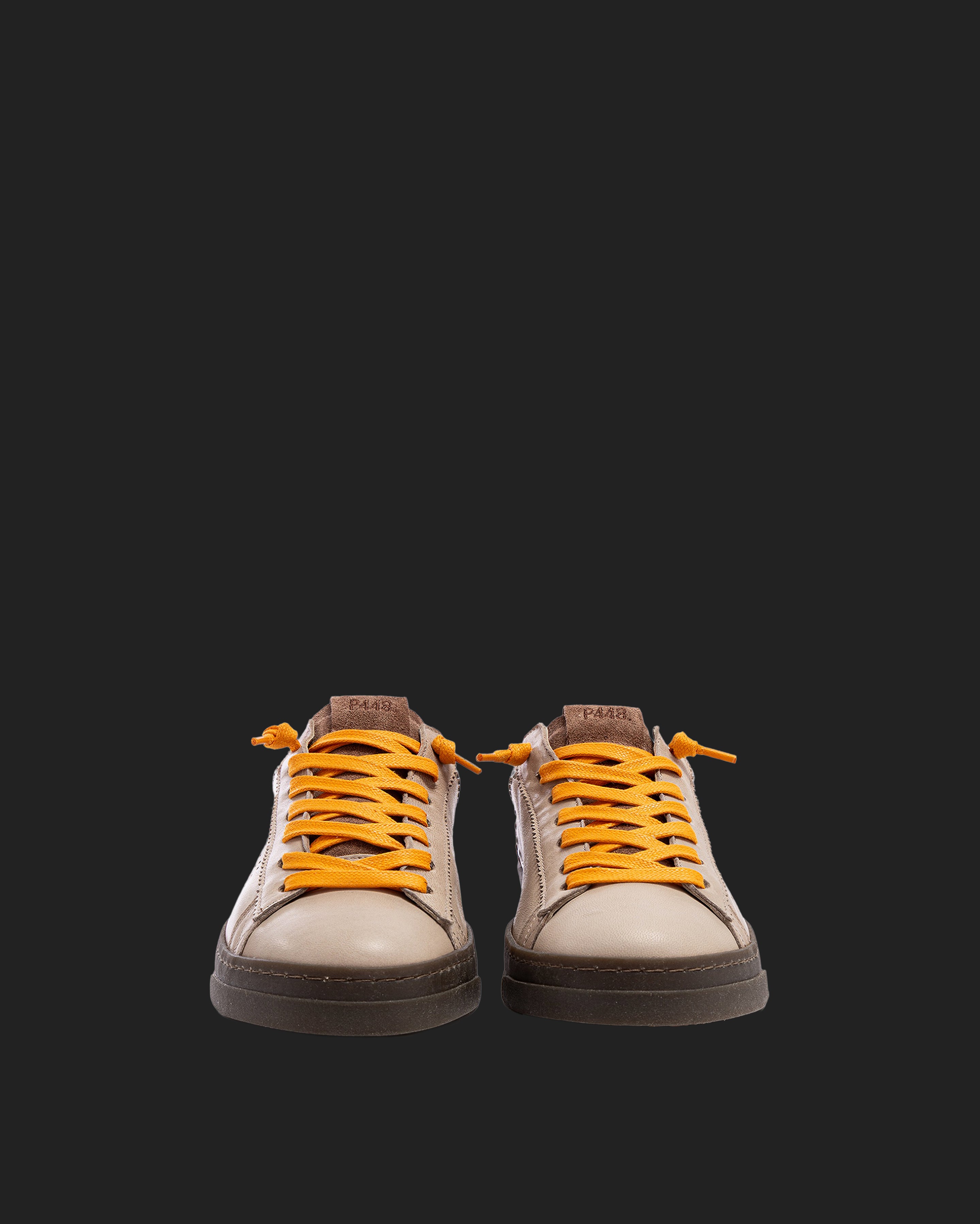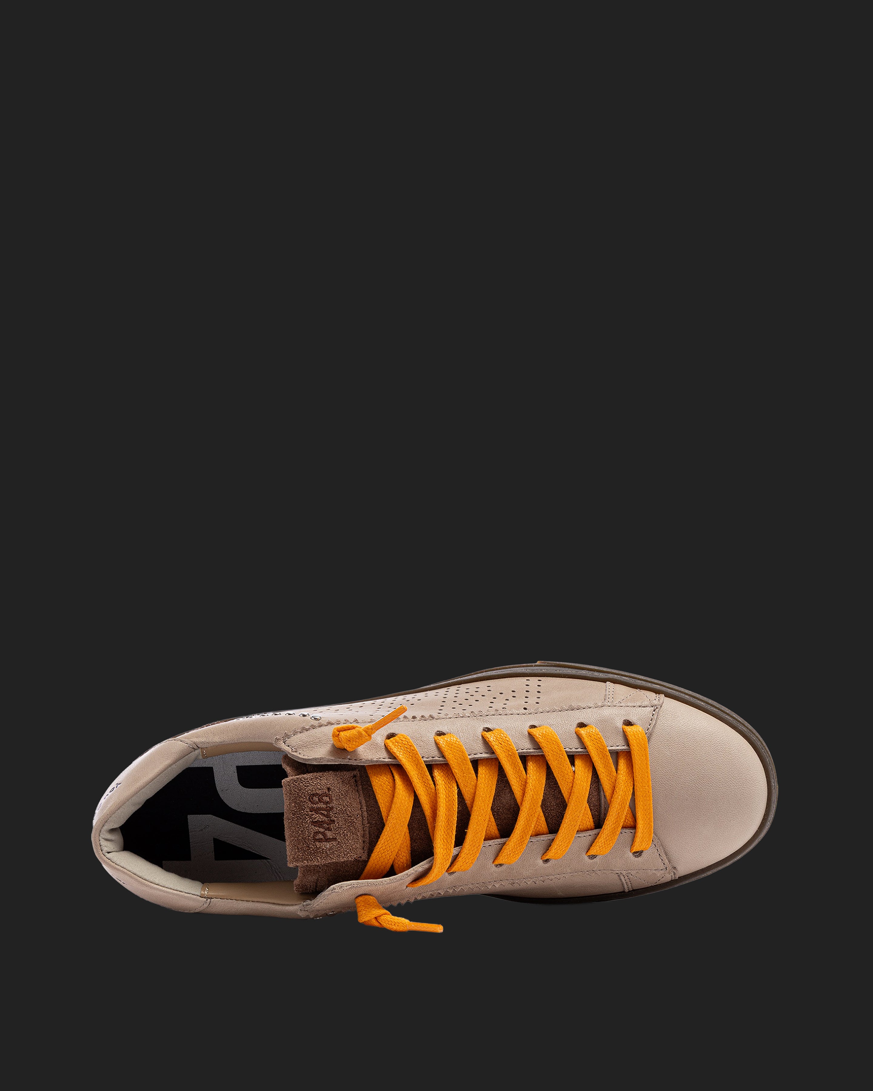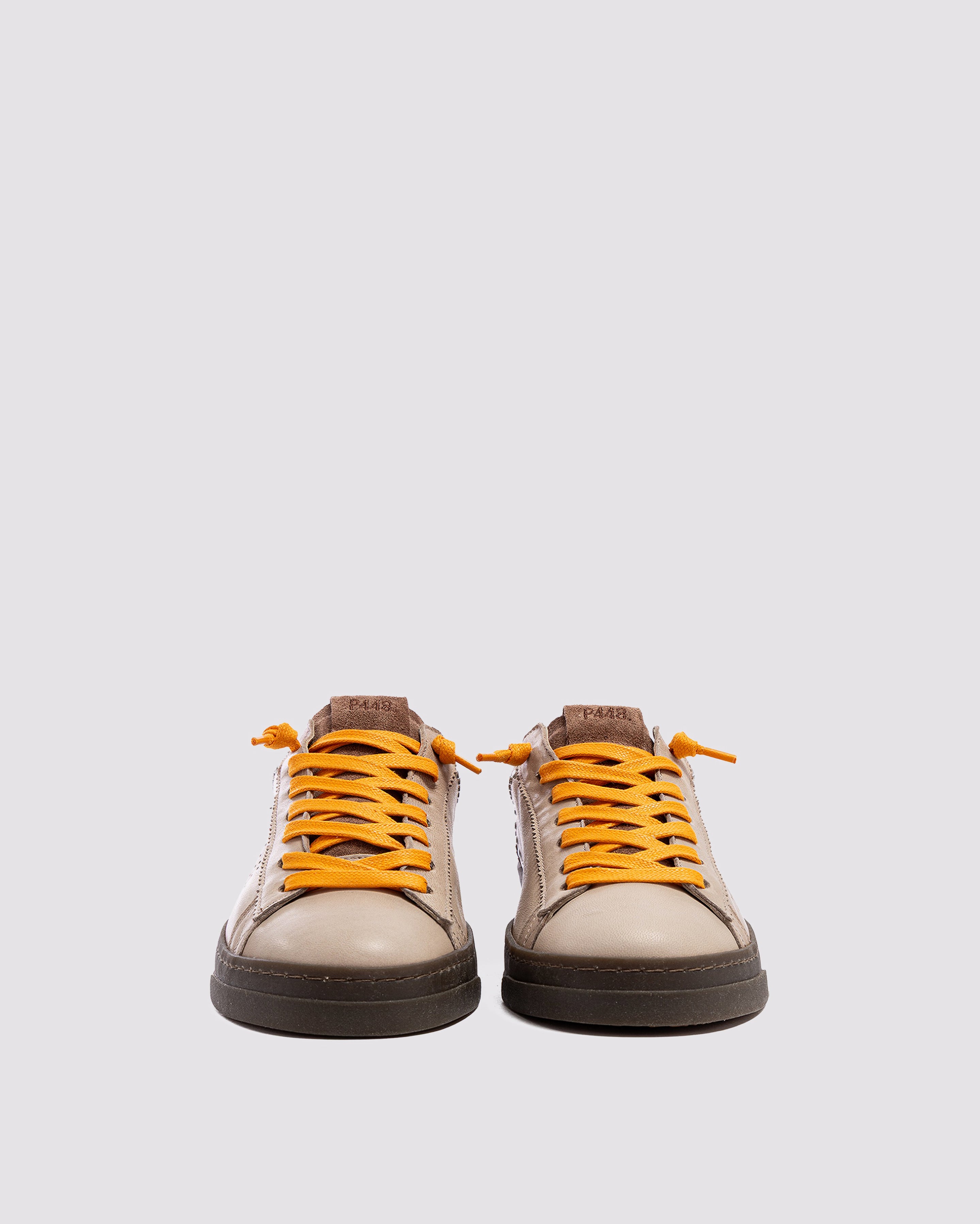 The Jack Terra features all-over beige leather complemented by brown suede and studded accents. Orange waxed cotton laces, our P448...