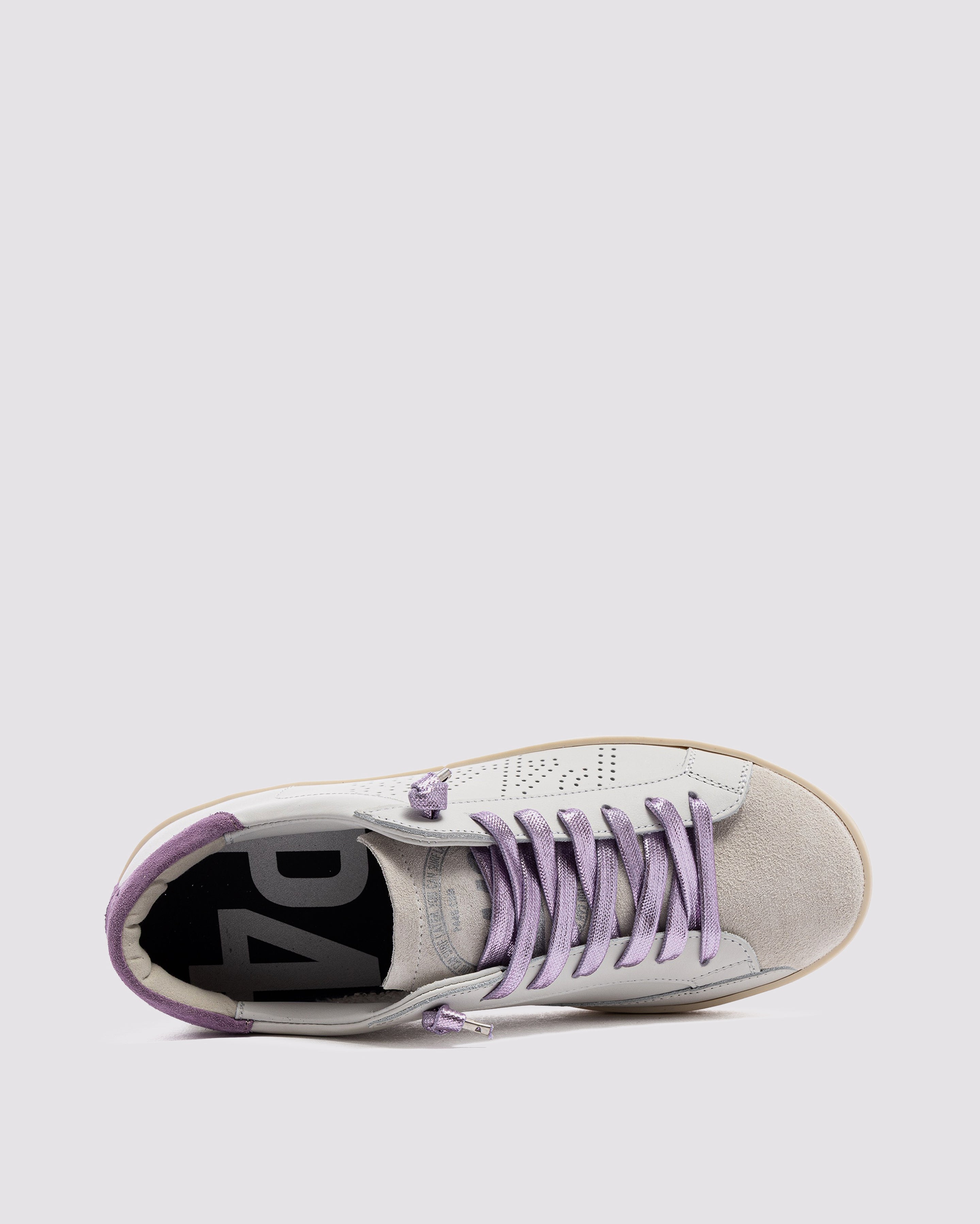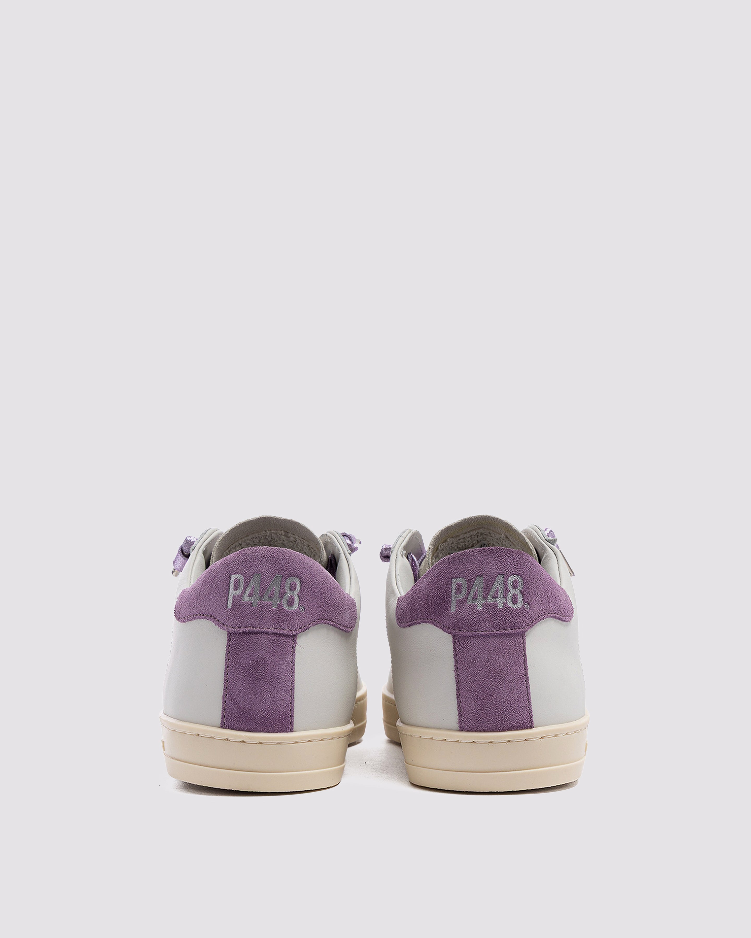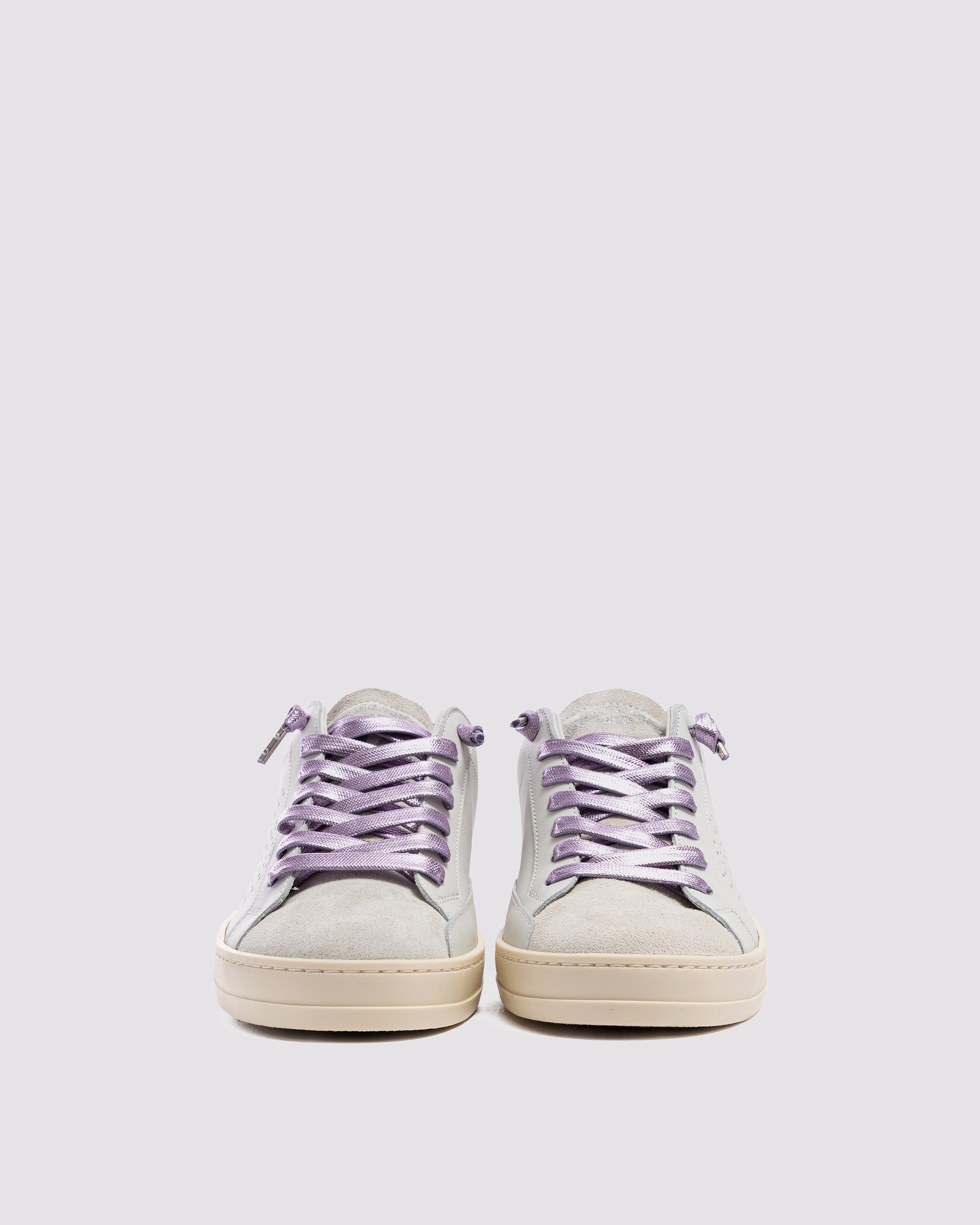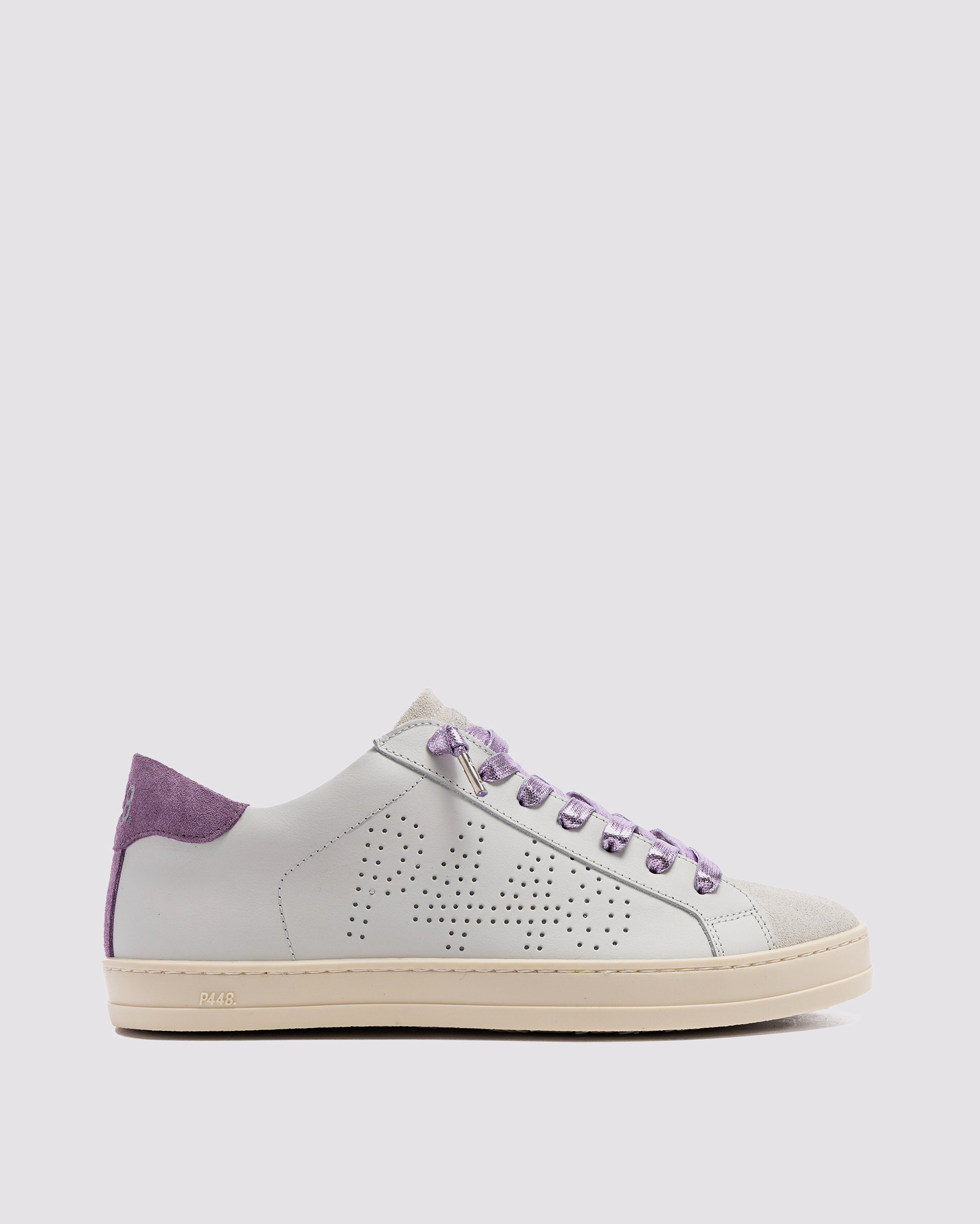 The John Orchid is wrapped in cream leather and suede accented by a lilac suede heel tab and matching lilac laces with metallic tips. Our signature P448 rubber sole and silver tread ground the look. Swap in the extra pair of silver laces for a shiny statement.