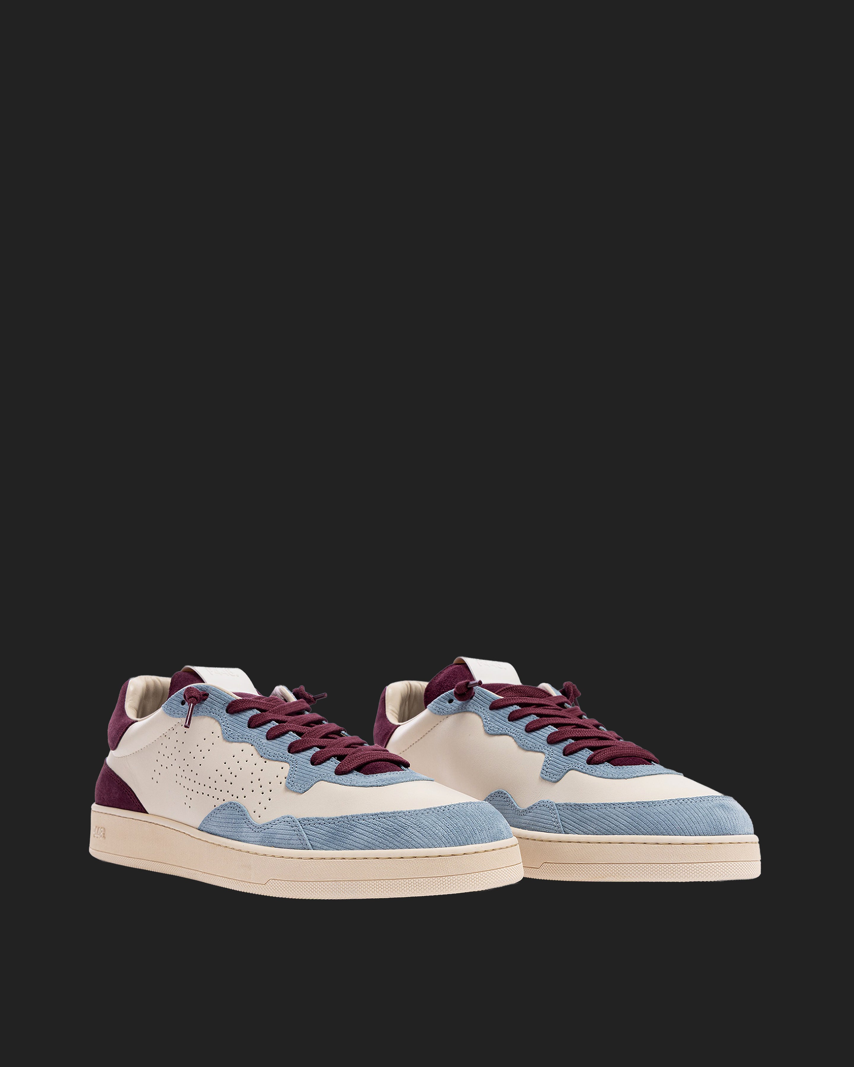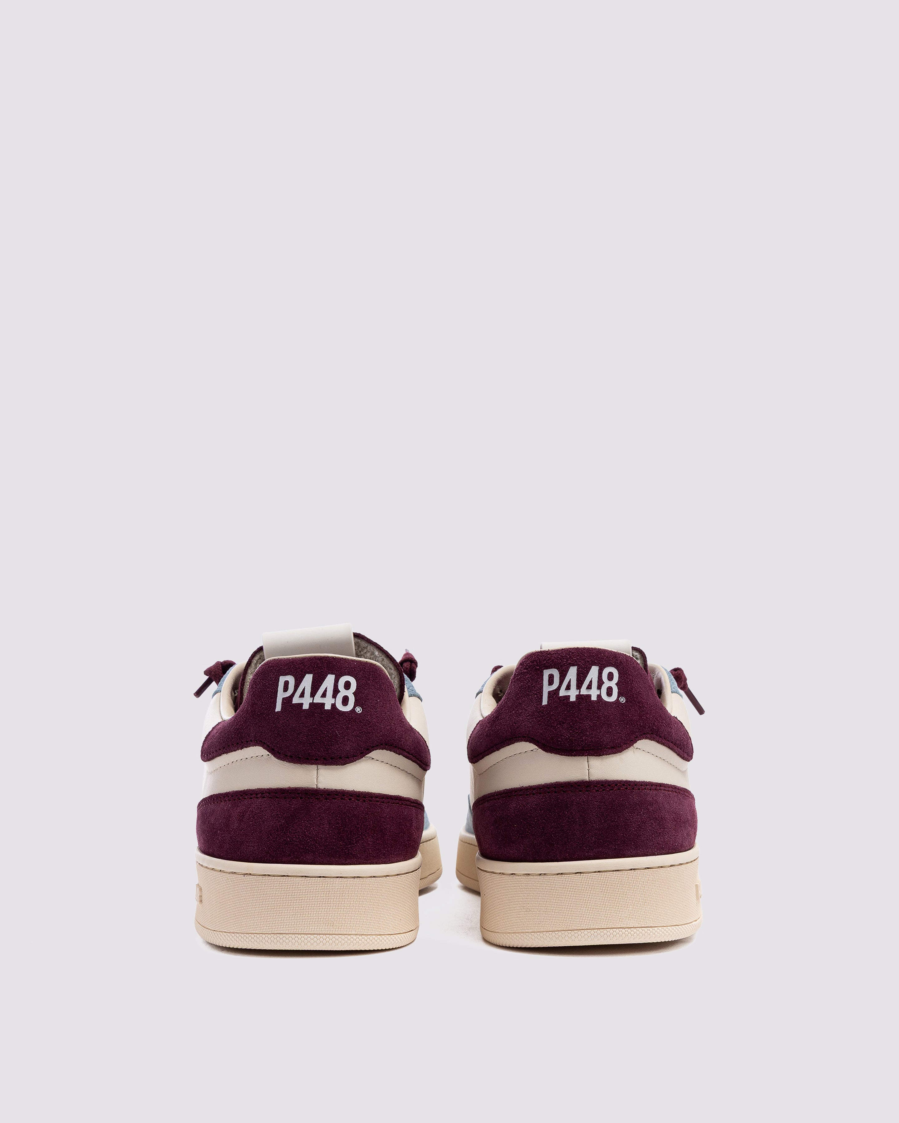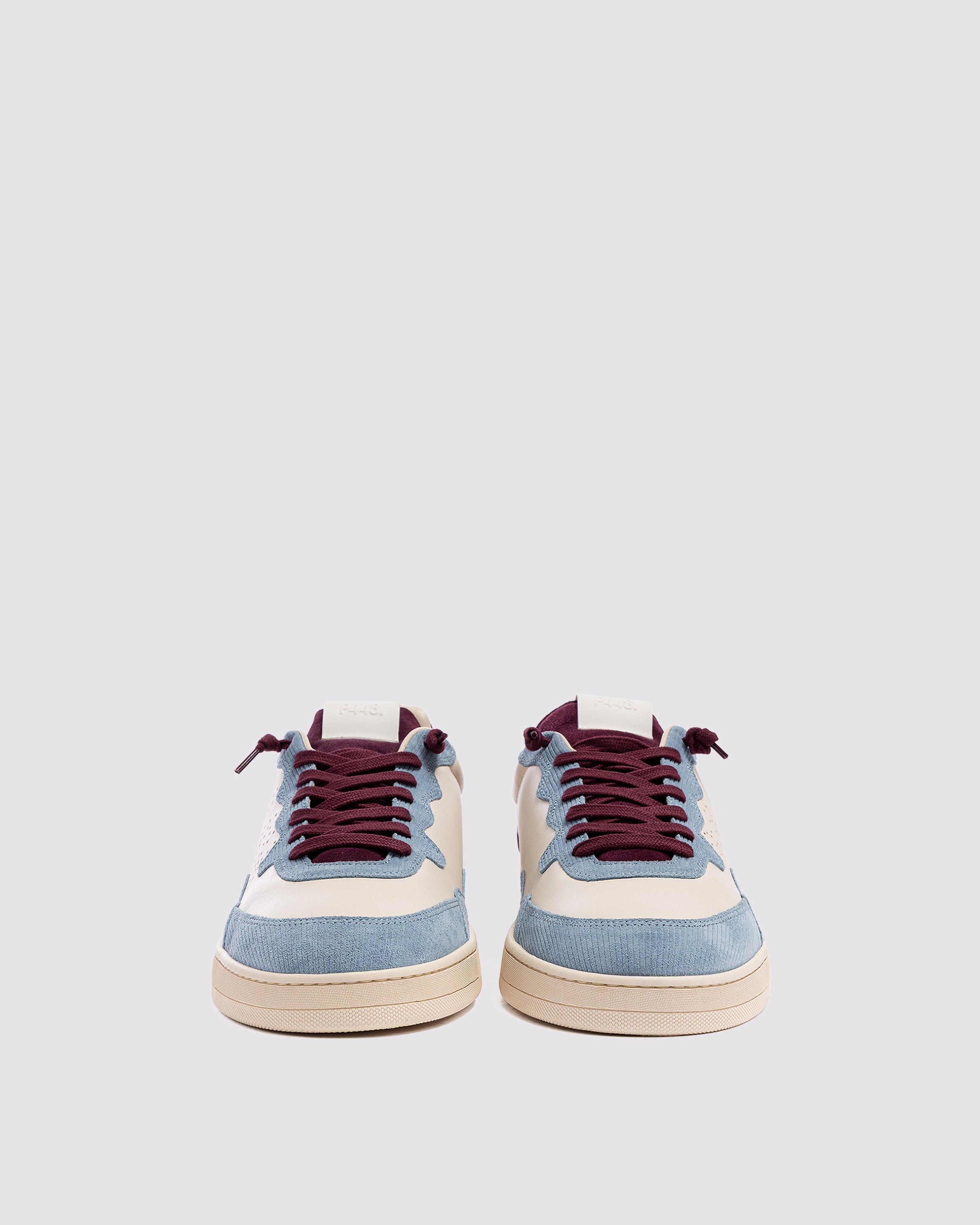 The Vert Sand Sky features a white leather upper with a perforated P448 logo, accented by a burgundy suede tongue, blue corduroy suede trim and toe, and burgundy suede heel tab and detailing. Finished with burgundy cotton laces, or swap in the extra pair of white cotton laces for a cleaner look. Our signature P448 rubber sole is crafted with skaters in mind, featuring a herringbone tread and pivot point for extra grip and ultimate comfort.